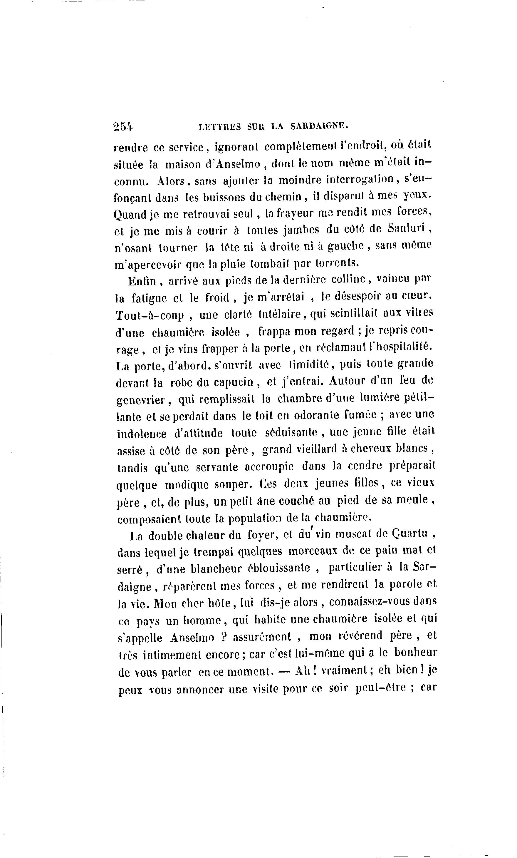 2i)V LETTRES SUR LA SARDAIGNE. rendre ce service, ignorant complètement l'endroit, où était, située la maison d'Ànselmo , dont le nom même m'était i n - connu. Alors, sans ajouter la moindre interrogation, s'en- fonçanl dans les buissons du chemin , il disparut à mes yeux. Quand je me retrouvai seul, la frayeur me rendit mes forces, et je me mis à courir à toutes jambes du côté de Sanluri, n'osant tourner la tète ni à droite ni à gauche , sans môme m'apercevoir que la pluie tombait par torrents. Enfin , arrivé aux pieds de la dernière colline, vaincu par la fatigue et le froid , je m'arrêtai , le désespoir au cœur. Tout-à -coup , une clarté lulélaire, qui scintillait aux vitres d'une chaumière isolée , frappa mon regard ; je repris cou- rage , et je vins frapper à la porte, en réclamant l'hospitalité. La porte, d'abord, s'ouvrit avec timidité, puis toute grande devant la robe du capucin , et j'entrai. Autour d'un feu de genévrier, qui remplissait la chambre d'une lumière pétil- lante et se perdait dans le toit en odorante fumée ; avec une indolence d'attitude toute séduisante , une jeune fille était assise à côté de son père , grand vieillard à cheveux blancs , tandis qu'une servante accroupie dans la cendre préparait quelque modique souper. Ces deux jeunes filles, ce vieux père , et, de plus, un petit âne couché au pied de sa meule , composaient toute la population de la chaumière. La double chaleur du foyer, et du vin muscat de Quarlu , dans lequel je trempai quelques morceaux de ce pain mal et serré , d'une blancheur éblouissante , particulier à la Sar- daigne , réparèrent mes forces , et me rendirent la parole et la vie. Mon cher hôte, lui dis-je alors , connaissez-vous dans ce pays un homme, qui habite une chaumière isolée et qui s'appelle Anselmo ? assurément , mon révérend père , et très intimement encore; car c'est lui-même qui a le bonheur de vous parler en ce moment. — Ah ! vraiment ; eh bien ! je peux vous annoncer une visite pour ce soir peut-être ; car