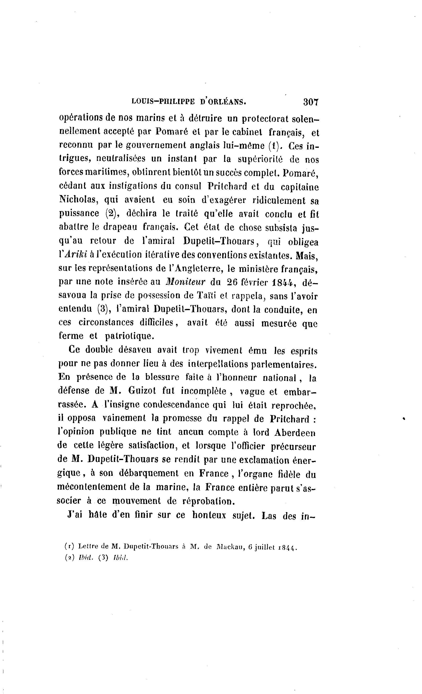 LOUIS-PHILIPPE D'ORLÉANS. 307 opérations de nos marins et à détruire un protectorat solen- nellement accepté par Pomaré et par le cabinet français, et reconnu par le gouvernement anglais lui-môme (1). Ces in- trigues, neutralisées un instant par la supériorité de nos forces maritimes, obtinrent bientôt un succès complet. Pomaré, cédant aux instigations du consul Pritchard et du capitaine Nicholas, qui avaient eu soin d'exagérer ridiculement sa puissance (2), déchira le traité qu'elle avait conclu et fit abattre le drapeau français. Cet état de chose subsista jus- qu'au retour de l'amiral Dupelit-Thouars, qui obligea VAriki à l'exécution itérative des conventions existantes. Mais, sur les représentations de l'Angleterre, le ministère français, par une note insérée au Moniteur du 26 février 1844, dé- savoua la prise de possession de ïaïti et rappela, sans l'avoir entendu (3), l'amiral Dupelit-Thouars, dont la conduite, en ces circonstances difficiles, avait été aussi mesurée que ferme et patriotique. Ce double désaveu avait trop vivement ému les esprits pour ne pas donner lieu à des interpellations parlementaires. En présence de la blessure faite a l'honneur national , la défense de M. Guizot fut incomplète , vague et embar- rassée. A l'insigne condescendance qui lui était reprochée, il opposa vainement la promesse du rappel de Pritchard : l'opinion publique ne tint ancun compte à lord Aberdeen de celle légère satisfaction, et lorsque l'officier précurseur de M. Dupetit-Thouars se rendit par une exclamation éner- gique , à son débarquement en France , l'organe fidèle du mécontentement de la marine, la France entière parut s'as- socier à ce mouvement de réprobation. J'ai hâte d'en finir sur ce honteux sujet. Las des in- (r) Lellre de M. Dupelit-Thouars à M. de Mackau, G juillet 1844. (4) Ibid. (3) IbUI.