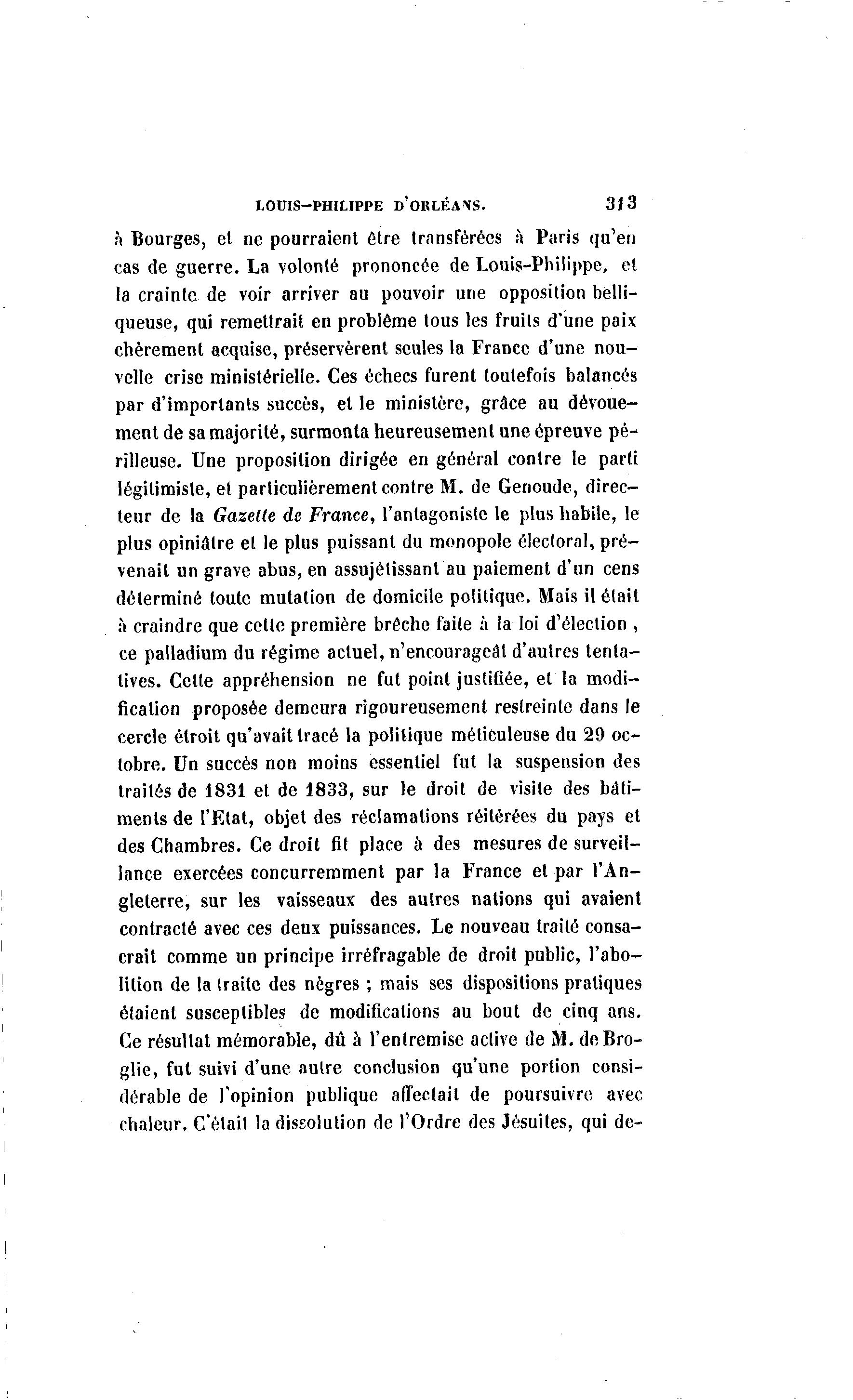 LOUIS-PHILIPPE D'OKLÉA\S. 313 à Bourges, et ne pourraient être transférées à Paris qu'en cas de guerre. La volonté prononcée de Louis-Philippe, et la crainte de voir arriver au pouvoir une opposition belli- queuse, qui remettrait en problême tous les fruits d'une paix chèrement acquise, préservèrent seules la France d'une nou- velle crise ministérielle. Ces échecs furent toutefois balancés par d'importants succès, et le ministère, grâce au dévoue- ment de sa majorité, surmonta heureusement une épreuve pé- rilleuse. Une proposition dirigée en général contre le parti légitimiste, et particulièrement contre M. de Genoude, direc- teur de la Gazelle de France, l'antagoniste le plus habile, le plus opiniâtre et le plus puissant du monopole électoral, pré- venait un grave abus, en assujélissant au paiement d'un cens déterminé toute mutation de domicile politique. Mais il était à craindre que celte première broche faite à la loi d'élection , ce palladium du régime actuel, n'encourageât d'autres tenta- tives. Cette appréhension ne fut point justifiée, et la modi- fication proposée demeura rigoureusement restreinte dans le cercle étroit qu'avait tracé la politique méticuleuse du 29 oc- tobre. Un succès non moins essentiel fut la suspension des traités de 1831 et de 1833, sur le droit de visite des bâti- ments de l'Etal, objet des réclamations réitérées du pays et des Chambres. Ce droit fit place à des mesures de surveil- lance exercées concurremment par la France et par l'An- gleterre, sur les vaisseaux des autres nations qui avaient contracté avec ces deux puissances. Le nouveau traité consa- crait comme un principe irréfragable de droit public, l'abo- lition de la traite des nègres ; mais ses dispositions pratiques étaient susceptibles de modifications au bout de cinq ans. Ce résultat mémorable, dû à l'entremise active de M. deBro- glie, fut suivi d'une autre conclusion qu'une portion consi- dérable de l'opinion publique affectait de poursuivre avec chaleur. C'était la dissolution de l'Ordre des Jésuites, qui de-