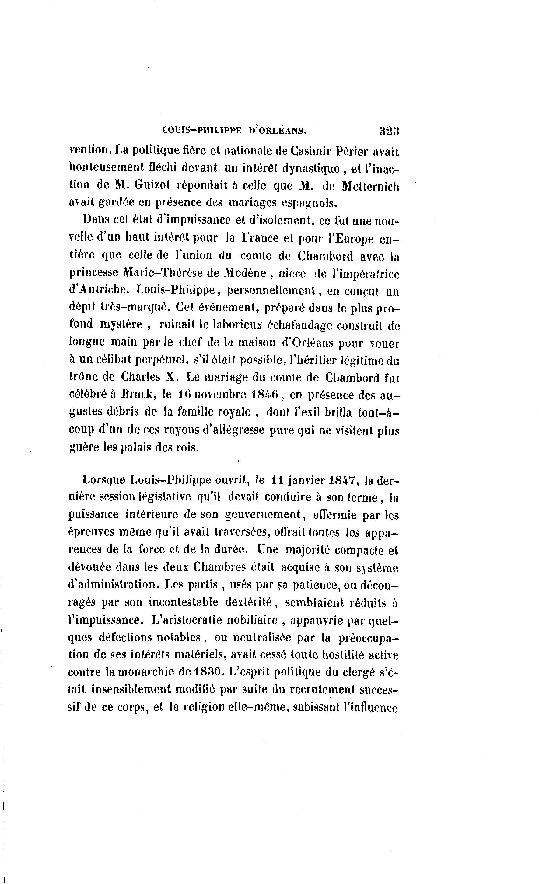 LOUIS-PHILIPPE W'OKLÉANS. 323 vention. La politique fière et nationale de Casimir Périer avait honteusement fléchi devant un intérêt dynastique , et l'inac- tion de M. Guizot répondait à celle que M. de Metternich avait gardée en présence des mariages espagnols. Dans cet état d'impuissance et d'isolement, ce fut une nou- velle d'un haut intérêt pour la France et pour l'Europe en- tière que celle de l'union du comte de Chambord avec la princesse Marie-Thérèse de Modène , nièce de l'impératrice d'Autriche. Louis-Phiîippe, personnellement, en conçut un dépit très-marqué. Cet événement, préparé dans le plus pro- fond mystère , ruinait le laborieux échafaudage construit de longue main par le chef de la maison d'Orléans pour vouer à un célibat perpétuel, s'il était possible, l'héritier légitime du trône de Charles X. Le mariage du comte de Chambord fut célébré à Bruck, le 16 novembre 1846, en présence des au- gustes débris de la famille royale , dont l'exil brilla tout-à - coup d'un de ces rayons d'allégresse pure qui ne visitent plus guère les palais des rois. Lorsque Louis-Philippe ouvrit, le 11 janvier 1847, la der- nière session législative qu'il devait conduire à son terme, la puissance intérieure de son gouvernement, affermie par les épreuves même qu'il avait traversées, offrait toutes les appa- rences de la force et de la durée. Une majorité compacte et dévouée dans les deux Chambres était acquise à son système d'administration. Les partis , usés par sa patience, ou décou- ragés par son incontestable dextérité, semblaient réduits à l'impuissance. L'aristocratie nobiliaire , appauvrie par quel- ques défections notables, ou neutralisée par la préoccupa- tion de ses intérêts matériels, avait cessé toute hostilité active contre la monarchie de 1830. L'esprit politique du clergé s'é- tait insensiblement modifié par suite du recrutement succes- sif de ce corps, et la religion elle-même, subissant l'influence