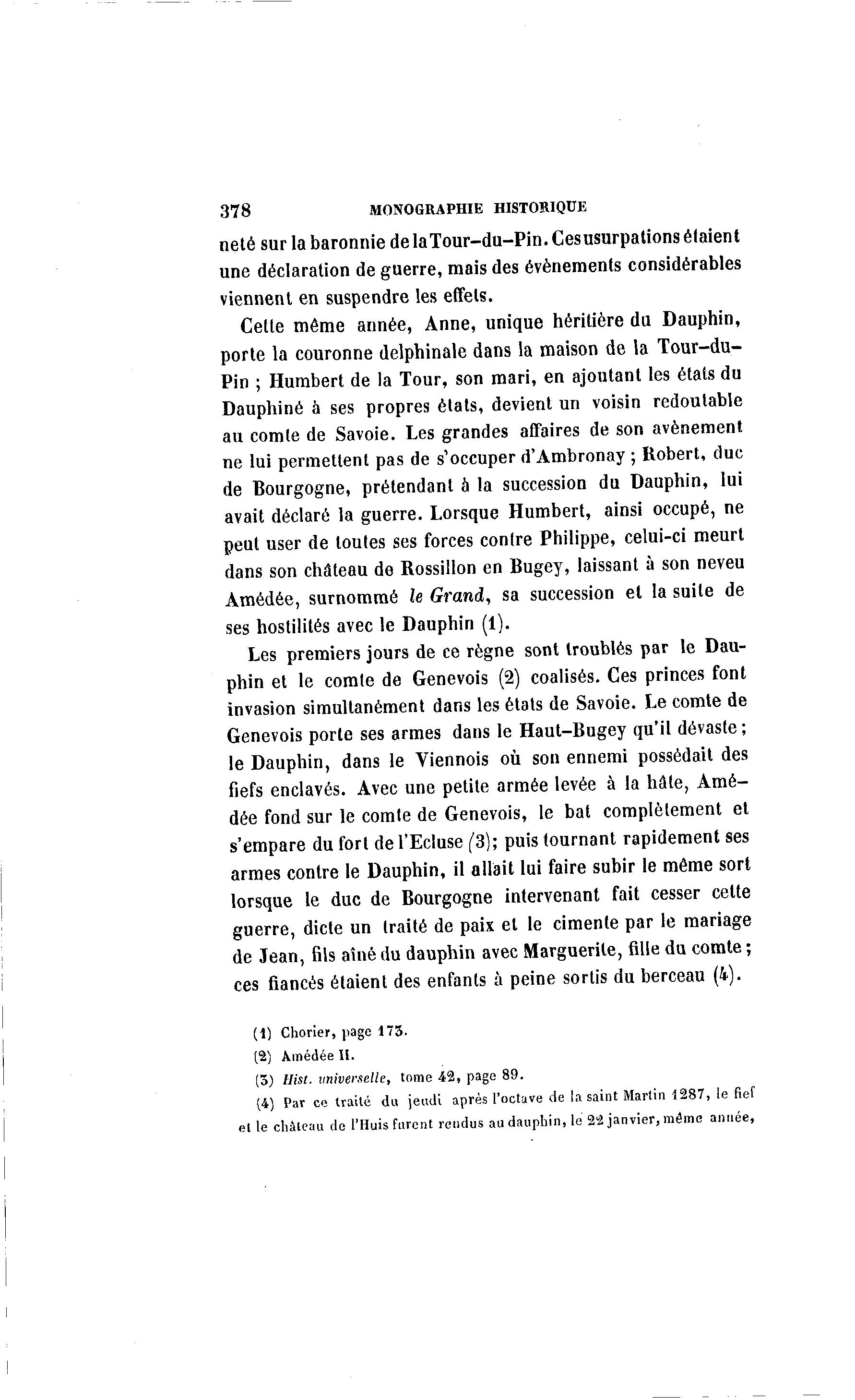 378 MONOGRAPHIE HISTORIQUE neté sur la baronnie de la Tour-du-Pin. Ces usurpations étaient une déclaration de guerre, mais des événements considérables viennent en suspendre les effets. Cette même année, Anne, unique héritière du Dauphin, porte la couronne delphinale dans la maison de la Tour-du- Pin ; Humbert de la Tour, son mari, en ajoutant les états du Dauphiné à ses propres états, devient un voisin redoutable au comte de Savoie. Les grandes affaires de son avènement ne lui permettent pas de s'occuper d'Ambronay ; Robert, duc de Bourgogne, prétendant à la succession du Dauphin, lui avait déclaré la guerre. Lorsque Humbert, ainsi occupé, ne peut user de toutes ses forces contre Philippe, celui-ci meurt dans son château de Rossillon en Bugey, laissant à son neveu Amédée, surnommé le Grand, sa succession et la suite de ses hostilités avec le Dauphin (1). Les premiers jours de ce règne sont troublés par le Dau- phin et le comte de Genevois (2) coalisés. Ces princes font invasion simultanément dans les états de Savoie. Le comte de Genevois porte ses armes dans le Haut-Bugey qu'il dévaste ; le Dauphin, dans le Viennois où son ennemi possédait des fiefs enclavés. Avec une petite armée levée à la hâte, Amé- dée fond sur le comte de Genevois, le bat complètement et s'empare du fort de l'Ecluse (3); puis tournant rapidement ses armes contre le Dauphin, il allait lui faire subir le même sort lorsque le duc de Bourgogne intervenant fait cesser cette guerre, dicte un traité de paix et le cimente par le mariage de Jean, fils aîné du dauphin avec Marguerite, fille du comte ; ces fiancés étaient des enfants à peine sortis du berceau (4). (1) Chorier, page 173. (2) Amédée H. (5) Uist. universelle, tome 42, page 89. (4) Par ce traité du jeudi après l'octave de la saint Martin 1287, le fief et le chaleau de l'Huis furent rendus au dauphin, le 22 janvier, même année,