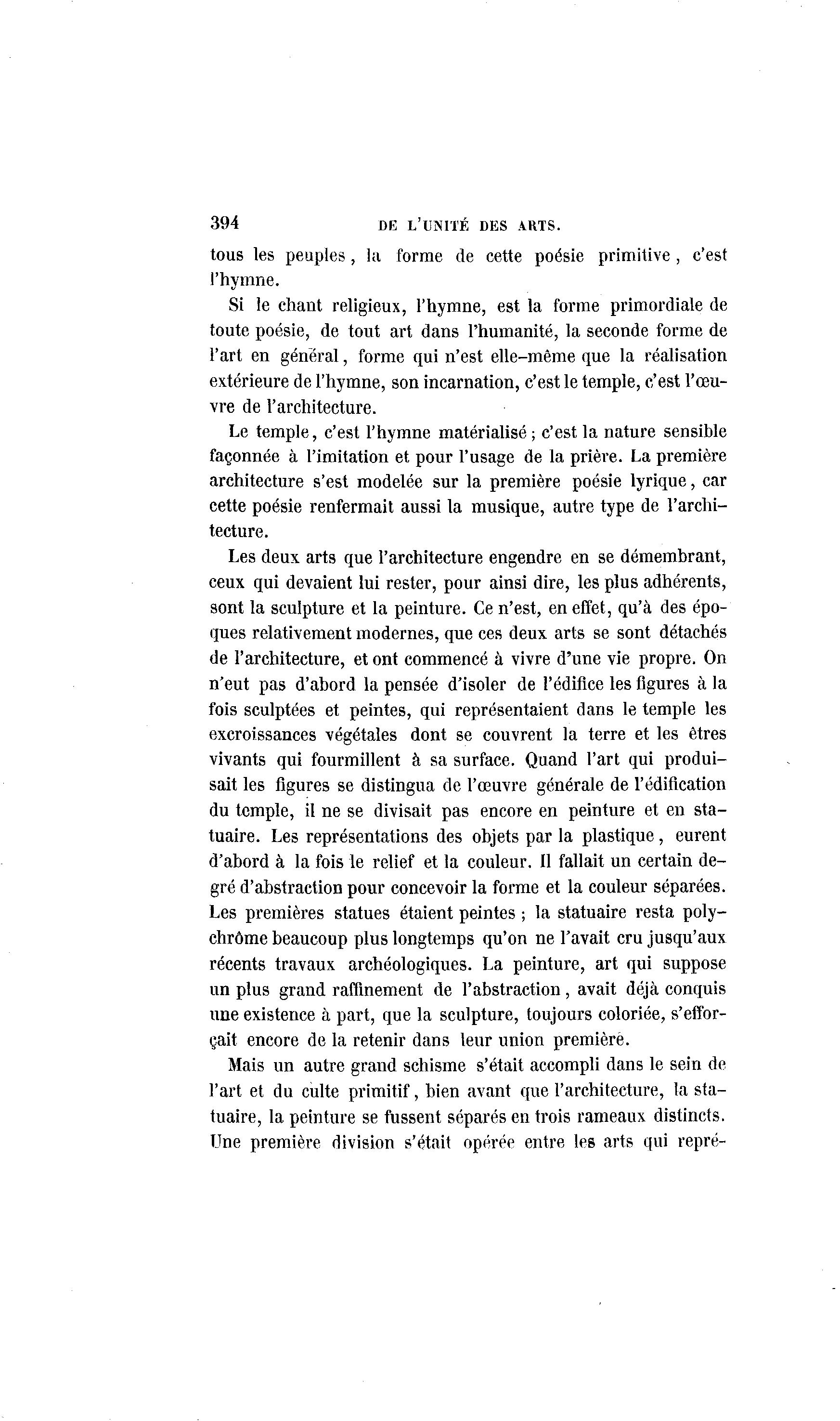 394 DE L'UNITÉ DES ARTS. tous les peuples, la forme de cette poésie primitive , c'est l'hymne. Si le chant religieux, l'hymne, est la forme primordiale de toute poésie, de tout art dans l'humanité, la seconde forme de l'art en général, forme qui n'est elle-même que la réalisation extérieure de l'hymne, son incarnation, c'est le temple, c'est l'œu- vre de l'architecture. Le temple, c'est l'hymne matérialisé ; c'est la nature sensible façonnée à l'imitation et pour l'usage de la prière. La première architecture s'est modelée sur la première poésie lyrique, car cette poésie renfermait aussi la musique, autre type de l'archi- tecture. Les deux arts que l'architecture engendre en se démembrant, ceux qui devaient lui rester, pour ainsi dire, les plus adhérents, sont la sculpture et la peinture. Ce n'est, en effet, qu'à des épo- ques relativement modernes, que ces deux arts se sont détachés de l'architecture, et ont commencé à vivre d'une vie propre. On n'eut pas d'abord la pensée d'isoler de l'édifice les figures à la fois sculptées et peintes, qui représentaient dans le temple les excroissances végétales dont se couvrent la terre et les êtres vivants qui fourmillent à sa surface. Quand l'art qui produi- sait les figures se distingua de l'œuvre générale de l'édification du temple, il ne se divisait pas encore en peinture et en sta- tuaire. Les représentations des objets par la plastique, eurent d'abord à la fois le relief et la couleur. Il fallait un certain de- gré d'abstraction pour concevoir la forme et la couleur séparées. Les premières statues étaient peintes ; la statuaire resta poly- chrome beaucoup plus longtemps qu'on ne l'avait cru jusqu'aux récents travaux archéologiques. La peinture, art qui suppose un plus grand raffinement de l'abstraction, avait déjà conquis une existence à part, que la sculpture, toujours coloriée, s'effor- çait encore de la retenir dans leur union première. Mais un autre grand schisme s'était accompli dans le sein de l'art et du culte primitif, bien avant que l'architecture, la sta- tuaire, la peinture se fussent séparés en trois rameaux distincts. Une première division s'était opérée entre les arts qui repré-