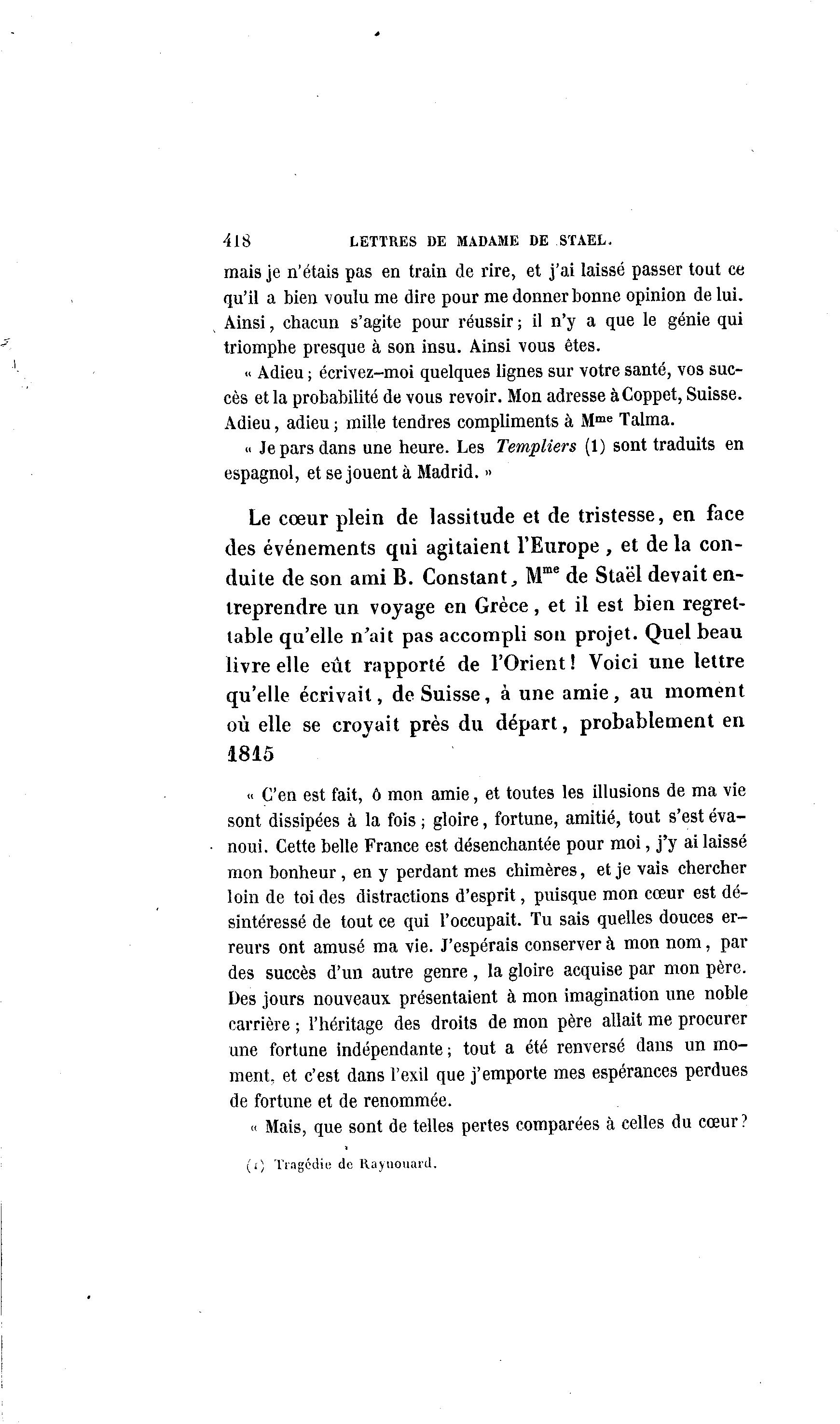 418 LETTRES DE MADAME DE STAËL. mais je n'étais pas en train de rire, et j'ai laissé passer tout ce qu'il a bien voulu me dire pour me donner bonne opinion de lui. Ainsi, chacun s'agite pour réussir ; il n'y a que le génie qui triomphe presque à son insu. Ainsi vous êtes. « Adieu ; écrivez-moi quelques lignes sur votre santé, vos suc- cès et la probabilité de vous revoir. Mon adresse à Coppet, Suisse. Adieu, adieu ; mille tendres compliments à Mme Talma. « Je pars dans une heure. Les Templiers (1) sont traduits en espagnol, et se jouent à Madrid. » Le cœur plein de lassitude et de tristesse, en face des événements qui agitaient l'Europe , et de la con- duite de son ami B. Constant,, Mœe de Staël devait en- treprendre un voyage en Grèce, et il est bien regret- table qu'elle n'ait pas accompli son projet. Quel beau livre elle eût rapporté de l'Orient ! Voici une lettre qu'elle écrivait, de Suisse, à une amie, au moment où elle se croyait près du départ, probablement en 1815 « C'en est fait, ô mon amie, et toutes les illusions de ma vie sont dissipées à la fois ; gloire, fortune, amitié, tout s'est éva- noui. Cette belle France est désenchantée pour moi, j'y ai laissé mon bonheur, en y perdant mes chimères, et je vais chercher loin de toi des distractions d'esprit, puisque mon cœur est dé- sintéressé de tout ce qui l'occupait. Tu sais quelles douces er- reurs ont amusé ma vie. J'espérais conserver à mon nom, par des succès d'un autre genre , la gloire acquise par mon père. Des jours nouveaux présentaient à mon imagination une noble carrière ; l'héritage des droits de mon père allait me procurer une fortune indépendante ; tout a été renversé dans un mo- ment, et c'est dans l'exil que j'emporte mes espérances perdues de fortune et de renommée. « Mais, que sont de telles pertes comparées à celles du cœur? (i) Tïagédii; de Rayiiouard.