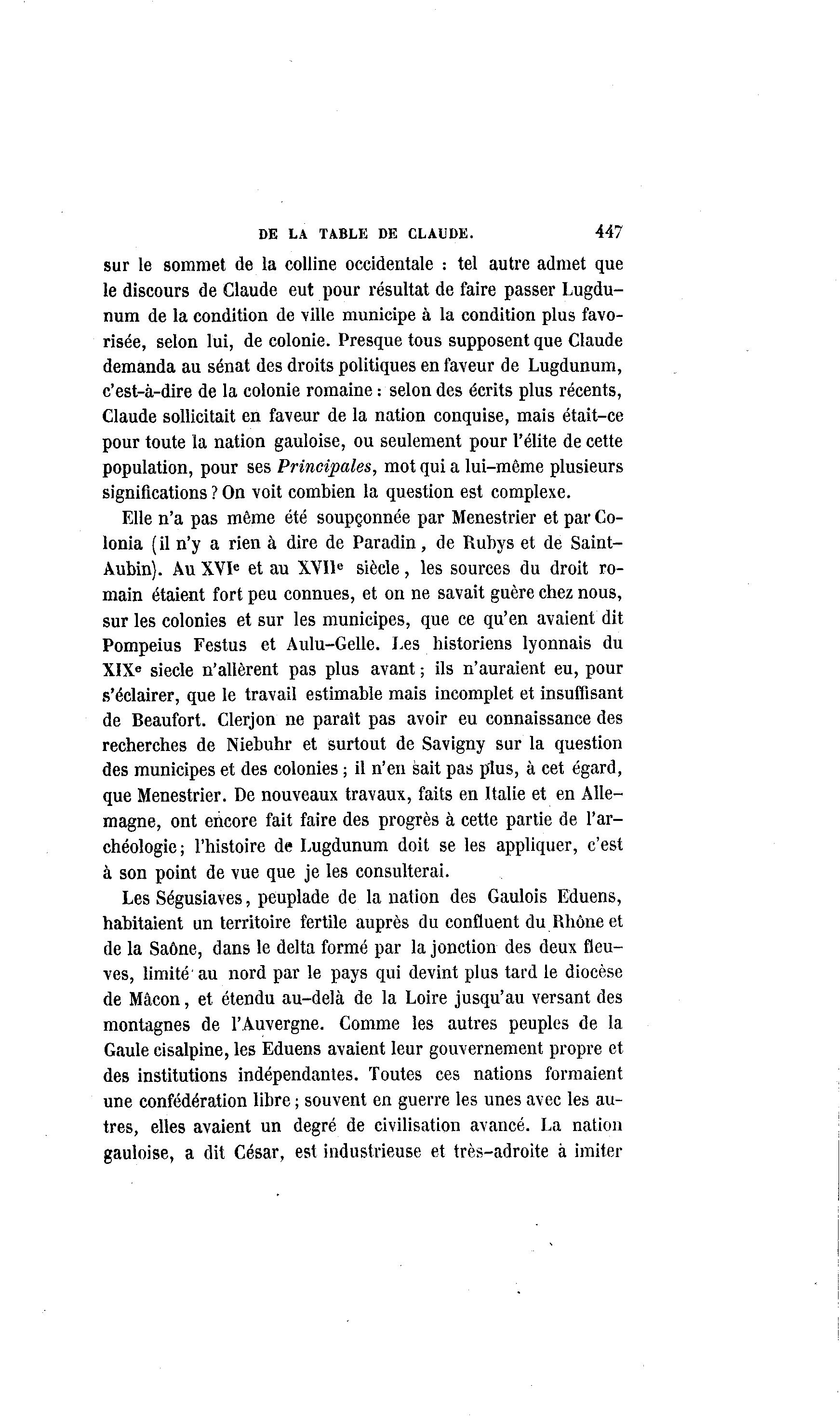 DE LA TABLE DE CLAUDE. 447 sur le sommet de la colline occidentale : tel autre admet que le discours de Claude eut pour résultat de faire passer Lugdu- num de la condition de ville municipe à la condition plus favo- risée, selon lui, de colonie. Presque tous supposent que Claude demanda au sénat des droits politiques en faveur de Lugdunum, c'est-à -dire de la colonie romaine : selon des écrits plus récents, Claude sollicitait en faveur de la nation conquise, mais était-ce pour toute la nation gauloise, ou seulement pour l'élite de cette population, pour ses Principales, mot qui a lui-même plusieurs significations ? On voit combien la question est complexe. Elle n'a pas même été soupçonnée par Menestrier et par Co- lonia (il n'y a rien à dire de Paradin, de Rubys et de Saint- Aubin). Au XVIe et au XVIIe siècle, les sources du droit ro- main étaient fort peu connues, et on ne savait guère chez nous, sur les colonies et sur les municipes, que ce qu'en avaient dit Pompeius Festus et Aulu-Gelle. Les historiens lyonnais du XIXe siècle n'allèrent pas plus avant ; ils n'auraient eu, pour s'éclairer, que le travail estimable mais incomplet et insuffisant de Beaufort. Clerjon ne paraît pas avoir eu connaissance des recherches de Niebuhr et surtout de Savigny sur la question des municipes et des colonies ; il n'en sait pas plus, à cet égard, que Menestrier. De nouveaux travaux, faits en Italie et en Alle- magne, ont encore fait faire des progrès à cette partie de l'ar- chéologie; l'histoire de Lugdunum doit se les appliquer, c'est à son point de vue que je les consulterai. Les Ségusiaves, peuplade de la nation des Gaulois Eduens, habitaient un territoire fertile auprès du confluent du Rhône et de la Saône, dans le delta formé par la jonction des deux fleu- ves, limité'au nord par le pays qui devint plus tard le diocèse de Mâcon, et étendu au-delà de la Loire jusqu'au versant des montagnes de l'Auvergne. Comme les autres peuples de la Gaule cisalpine, les Eduens avaient leur gouvernement propre et des institutions indépendantes. Toutes ces nations formaient une confédération libre ; souvent en guerre les unes avec les au- tres, elles avaient un degré de civilisation avancé. La nation gauloise, a dit César, est industrieuse et très-adroite à imiter