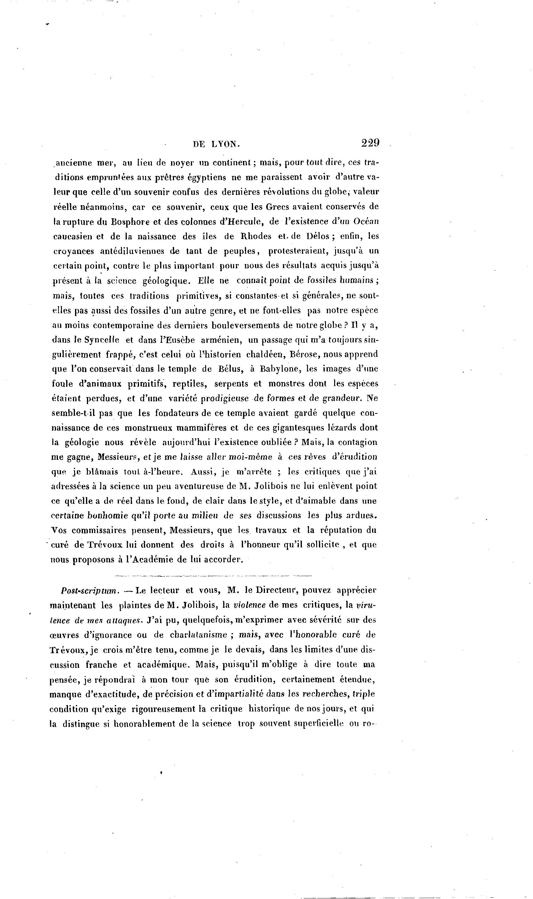 DE LYON. 229 ancienne mer, au lieu de noyer un continent ; mais, pour tout dire, ces tra- ditions empruntées aux prêtres égyptiens ne me paraissent avoir d'autre va- leur que celle d'un souvenir confus des dernières révolutions du globe; valeur réelle néanmoins, car ce souvenir, ceux que les Grecs avaient conservés de la rupture du Bosphore et des colonnes d'Hercule, de l'existence d'un Océan caucasien et de la naissance des îles de Rhodes et. de Délos ; enfin, les croyances antédiluviennes de tant de peuples, protesteraient, jusqu'à un certain point, contre le plus important pour nous des résultats acquis jusqu'à présent à la science géologique. Elle ne connaît point de fossiles humains ; mais, toutes ces traditions primitives, si constantes et si générales, ne sont- elles pas aussi des fossiles d'un autre genre, et ne font-elles pas notre espèce au moins contemporaine des derniers bouleversements de notre globe? Il y a, dans le Syncelle et dans l'Eusèbe arménien, un passage qui m'a toujours sin- gulièrement frappé, c'est celui où l'historien chaldéen, Bérose, nous apprend que l'on conservait dans le temple de Bélus, à Babylone, les images d'une foule d'animaux primitifs, reptiles, serpents et monstres dont les espèces étaient perdues, et d'une variété prodigieuse de formes et de grandeur. Ne semble-t il pas que les fondateurs de ce temple avaient gardé quelque con- naissance de ces monstrueux mammifères et de ces gigantesques lézards dont la géologie nous révèle aujourd'hui l'existence oubliée ? Mais, la contagion me gagne, Messieurs, et j e me laisse aller moi-même à ces rêves d'érudition que je blâmais tout à -l'heure. Aussi, je m'arrête ; les critiques que j ' a i adressées à la science un peu aventureuse de M. Jolibois ne lui enlèvent point ce qu'elle a de réel dans le fond, de clair dans le style, et d'aimable dans une certaine bonhomie qu'il porte au milieu de ses discussions les plus ardues. Vos commissaires pensent, Messieurs, que les travaux et la réputation du curé de Trévoux lui donnent des droits à l'honneur qu'il sollicite, et que nous proposons à l'Académie de lui accorder. Post-scriptum. — L e lecteur et vous, M . le Directeur, pouvez apprécier maintenant les plaintes de M . Jolibois, la violence de mes critiques, la viru- lence de mes attaques. J'ai pu, quelquefois,m'exprimer avec sévérité sur des œuvres d'ignorance ou de charlatanisme ; mais, avec l'honorable curé de Trévoux, je crois m'être tenu, comme je le devais, dans les limites d'une dis- cussion franche et académique. Mais, puisqu'il m'oblige à dire toute ma pensée, je répondrai à mon tour que son érudition, certainement étendue, manque d'exactitude, de précision et d'impartialité dans les recherches, triple condition qu'exige rigoureusement la critique historique de nos jours, et qui la distingue si honorablement de la science trop souvent superficielle ou ro-
