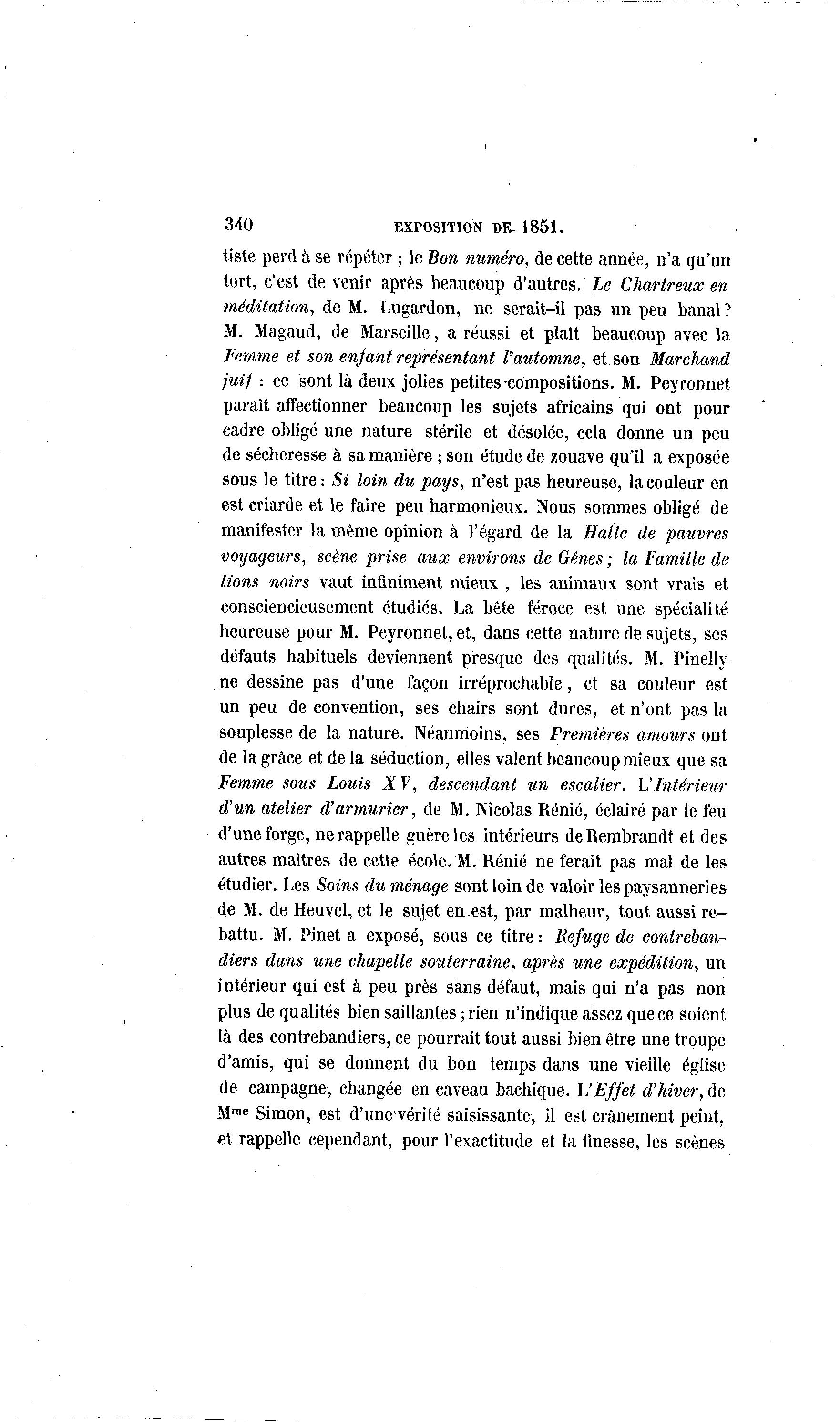 340 EXPOSITION DR 1851. tiste perd à se répéter ; le Bon numéro, de cette année, n'a qu'un tort, c'est de venir après beaucoup d'autres. Le Chartreux en méditation, de M. Lugardon, ne serait-il pas un peu banal? M. Magaud, de Marseille, a réussi et plaît beaucoup avec la Femme et son enjant représentant l'automne, et son Marchand juif : ce sont là deux jolies petites -compositions. M. Peyronnet paraît affectionner beaucoup les sujets africains qui ont pour cadre obligé une nature stérile et désolée, cela donne un peu de sécheresse à sa manière ; son étude de zouave qu'il a exposée sous le titre : Si loin du pays, n'est pas heureuse, la couleur en est criarde et le faire peu harmonieux. Nous sommes obligé de manifester la même opinion à l'égard de la Halte de pauvres voyageurs, scène prise aux environs de Gênes ; la Famille de lions noirs vaut infiniment mieux , les animaux sont vrais et consciencieusement étudiés. La bête féroce est une spécialité heureuse pour M. Peyronnet, et, dans cette nature de sujets, ses défauts habituels deviennent presque des qualités. M. Pinelly . ne dessine pas d'une façon irréprochable, et sa couleur est un peu de convention, ses chairs sont dures, et n'ont pas la souplesse de la nature. Néanmoins, ses Premières amours ont de la grâce et de la séduction, elles valent beaucoup mieux que sa Femme sous Louis Xf, descendant un escalier. L'Intérieur d'un atelier d'armurier, de M. Nicolas Renié, éclairé par le feu d'vine forge, ne rappelle guère les intérieurs de Rembrandt et des autres maîtres de cette école. M. Renié ne ferait pas mal de les étudier. Les Soins du ménage sont loin de valoir les paysanneries de M. de Heuvel, et le sujet en.est, par malheur, tout aussi re- battu. M. Pinet a exposé, sous ce titre : Refuge de contreban- diers dans une chapelle souterraine, après une expédition, un intérieur qui est à peu près sans défaut, mais qui n'a pas non plus de qualités bien saillantes ; rien n'indique assez que ce soient là des contrebandiers, ce pourrait tout aussi bien être une troupe d'amis, qui se donnent du bon temps dans une vieille église de campagne, changée en caveau bachique. L'Effet d'hiver, de Mme Simon, est d'unevérité saisissante, il est crânement peint, et rappelle cependant, pour l'exactitude et la finesse, les scènes