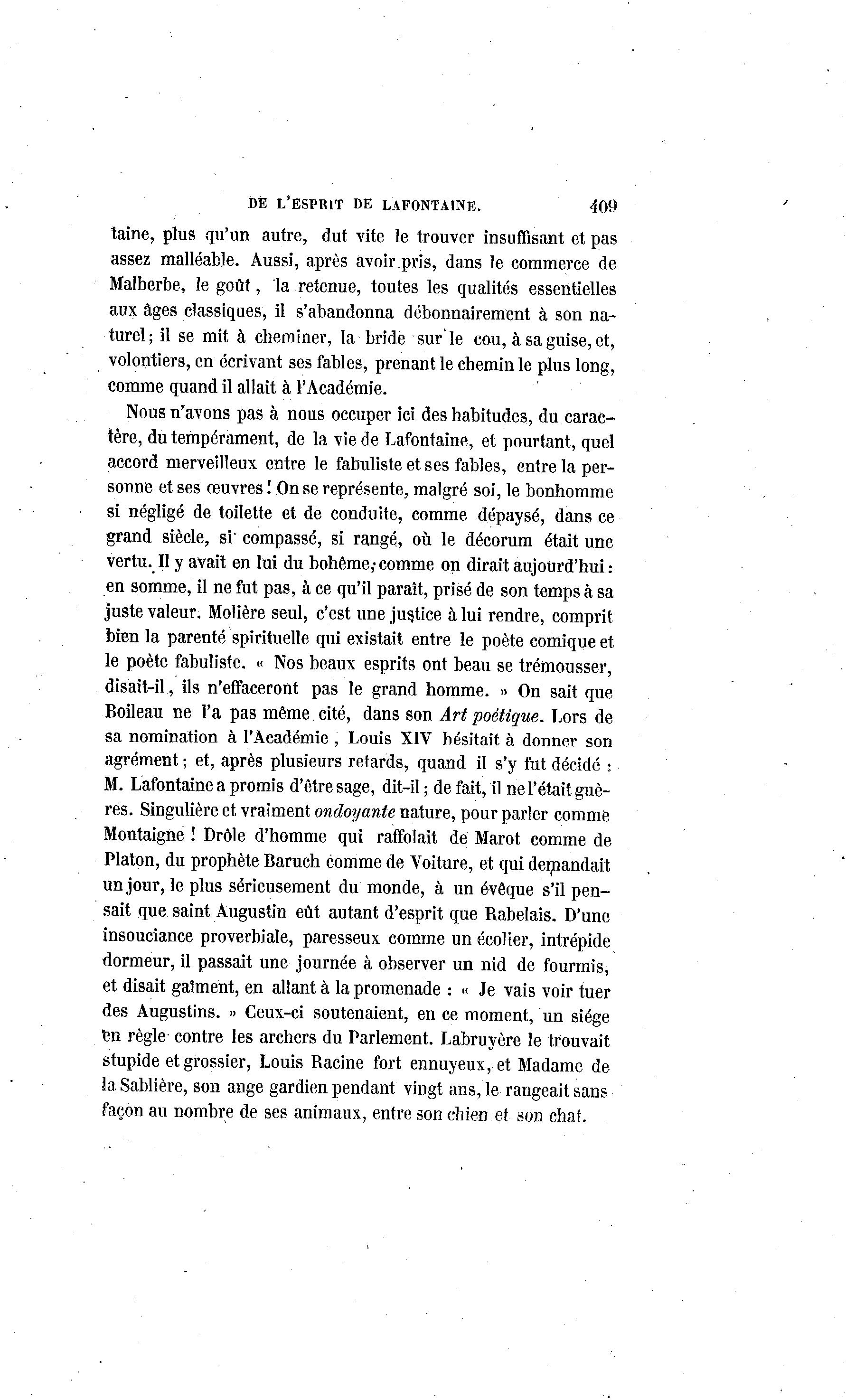 DÉ L'ESPRIT DE LAFONTAINE. 409 taine, plus qu'un autre, dut vite le trouver insuffisant et pas assez malléable. Aussi, après avoir pris, dans le commerce de Malherbe, le goût, la retenue, toutes les qualités essentielles aux âges classiques, il s'abandonna débonnairement à son na- turel; il se mit à cheminer, la bride sur'le cou, à sa guise, et, volontiers, en écrivant ses fables, prenant le chemin le plus long, comme quand il allait à l'Académie. Nous n'avons pas à nous occuper ici des habitudes, du carac- tère, du tempérament, de la vie de Lafontaine, et pourtant, quel accord merveilleux entre le fabuliste et ses fables, entre la per- sonne et ses œuvres ! On se représente, malgré soi, le bonhomme si négligé de toilette et de conduite, comme dépaysé, dans ce grand siècle, si' compassé, si rangé, où le décorum était une vertu. Il y avait en lui du bohème,- comme on dirait aujourd'hui : en somme, il ne fut pas, à ce qu'il parait, prisé de son temps à sa juste valeur. Molière seul, c'est une justice à lui rendre, comprit bien la parenté spirituelle qui existait entre le poète comique et le poète fabuliste. « Nos beaux esprits ont beau se trémousser, disait-il, ils n'effaceront pas le grand homme. » On sait que Boileau ne l'a pas même cité, dans son Art poétique. Lors de sa nomination à l'Académie , Louis XIV hésitait à donner son agrément ; et, après plusieurs retards, quand il s'y fut décidé : M. Lafontaine a promis d'être sage, dit-il; défait, il ne l'était guè- res. Singulière et vraiment ondoyante nature, pour parler comme Montaigne ! Drôle d'homme qui raffolait de Marot comme de Platon, du prophète Baruch comme de Voiture, et qui demandait un jour, le plus sérieusement du monde, à un évêque s'il pen- sait que saint Augustin eût autant d'esprit que Rabelais. D'une insouciance proverbiale, paresseux comme un écolier, intrépide dormeur, il passait une journée à observer un nid de fourmis, et disait gaîment, en allant à la promenade : « Je vais voir tuer des Augustins. » Ceux-ci soutenaient, en ce moment, un siège en règle contre les archers du Parlement. Labruyère le trouvait stupide et grossier, Louis Racine fort ennuyeux, et Madame de la Sablière, son ange gardien pendant vingt ans, le rangeait sans façon au nombre de ses animaux, entre son chien et son chat.