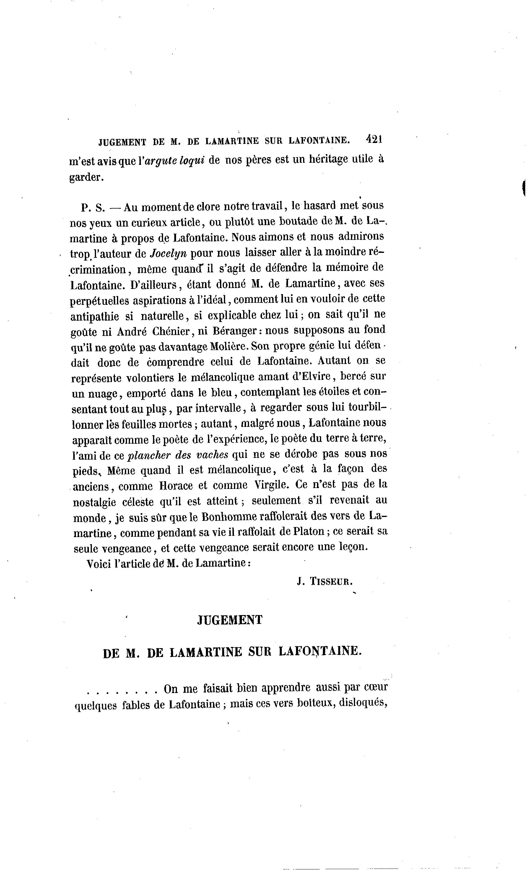 JUGEMENT DE M. DE LAMARTINE SUR LAFONTAINE. 421