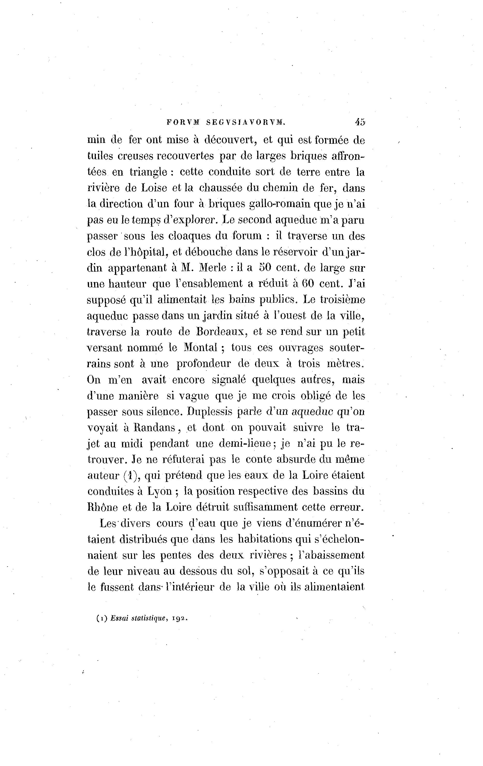 FORVM SEGVSIAVORVM. 45 min de fer ont mise à découvert, et qui est formée de tuiles creuses recouvertes par de larges briques affron- tées en triangle : cette conduite sort de terre entre la rivière de Loise et la chaussée du chemin de fer, dans la direction d'un four à briques gallo-romain que je n'ai pas eu le temps d'explorer. Le second aqueduc m'a paru passer sous les cloaques du forum : il traverse un des clos de l'hôpital, et débouche dans le réservoir d'un jar- din appartenant à M. Merle : il a 50 cent, de large sur une hauteur que l'ensablement a réduit à 60 cent. J'ai supposé qu'il alimentait les bains publics. Le troisième aqueduc passe dans un jardin situé à l'ouest de la ville, traverse la route de Bordeaux, et se rend sur un petit versant nommé le Montai ; tous ces ouvrages souter- rains sont à une profondeur de deux à trois mètres. On m'en avait encore signalé quelques autres, mais d'une manière si vague que je me crois obligé de Ses passer sous silence. Duplessis parle d'un aqueduc qu'on voyait à Randans, et dont on pouvait suivre le tra- jet au midi pendant une demi-lieue ; je n'ai pu le re- trouver. Je ne réfuterai pas le conte absurde du même auteur (1), qui prétend que les eaux de la Loire étaient conduites à Lyon ; la position respective des bassins du Rhône et de la Loire détruit suffisamment cette erreur. Les'divers cours d'eau que je viens d'énumérer n'é- taient distribués que dans les habitations qui s'échelon- naient sur les pentes des deux rivières ; l'abaissement de leur niveau au dessous du sol, s'opposait à ce qu'ils le fussent dans- l'intérieur de ïa ville où ils alimentaient (i) Essai statistique, 192.