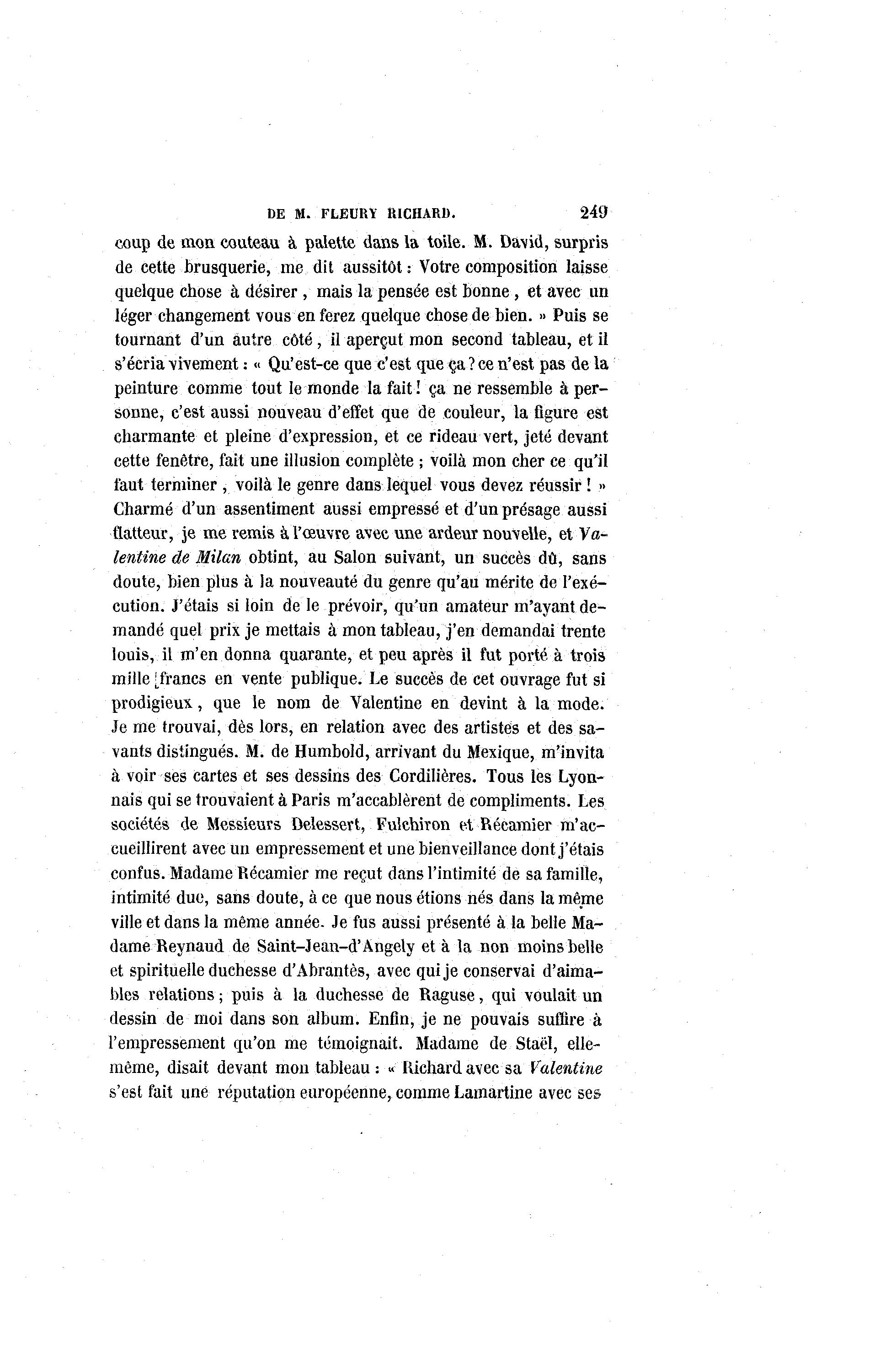 DE M. FLEURà RICHARD. 249 coup de mon couteau à palette dans la toile. M. David, surpris de cette brusquerie, me dit aussitôt : Votre composition laisse quelque chose à désirer , mais la pensée est bonne , et avec un léger changement vous en ferez quelque chose de bien. » Puis se tournant d'un autre côté, il aperçut mon second tableau, et il s'écria vivement : « Qu'est-ce que c'est que ça ? ce n'est pas de la peinture comme tout le monde la fait ! ça ne ressemble à per- sonne, c'est aussi nouveau d'effet que de couleur, la figure est charmante et pleine d'expression, et ce rideau vert, jeté devant cette fenêtre, fait une illusion complète ; voilà mon cher ce qu'il faut terminer , voilà le genre dans lequel vous devez réussir ! » Charmé d'un assentiment aussi empressé et d'un présage aussi flatteur, je me remis à l'œuvre avec une ardeur nouvelle, et Va- lentine de Milan obtint, au Salon suivant, un succès dû, sans doute, bien plus à la nouveauté du genre qu'au mérite de l'exé- cution. J'étais si loin de le prévoir, qu'un amateur m'ayant de- mandé quel prix je mettais à mon tableau, j'en demandai trente louis, il m'en donna quarante, et peu après il M porté à trois mille [francs en vente publique. Le succès de cet ouvrage fut si prodigieux, que le nom de Valentine en devint à la mode. Je me trouvai, dès lors, en relation avec des artistes et des sa- vants distingués. M. de Humbold, arrivant du Mexique, m'invita à voir ses cartes et ses dessins des Cordilières. Tous les Lyon- nais qui se trouvaient à Paris m'accablèrent de compliments. Les sociétés de Messieurs Delessert, Fulehiron et Récamier m'ac- cueillirent avec un empressement et une bienveillance dont j'étais confus. Madame Récamier me reçut dans l'intimité de sa famille, intimité due, sans doute, à ce que nous étions nés dans la même ville et dans la même année. Je fus aussi présenté à la belle Ma- dame Reynaud de Saint-Jean-d'Ângely et à la non moins belle et spirituelle duchesse d'Abrantès, avec qui je conservai d'aima- bles relations ; puis à la duchesse de Raguse, qui voulait un dessin de moi dans son album. Enfin, je ne pouvais suffire à l'empressement qu'on me témoignait. Madame de Staël, elle- même, disait devant mon tableau : « Richard avec sa Valentine s'est fait une réputation européenne, comme Lamartine avec ses