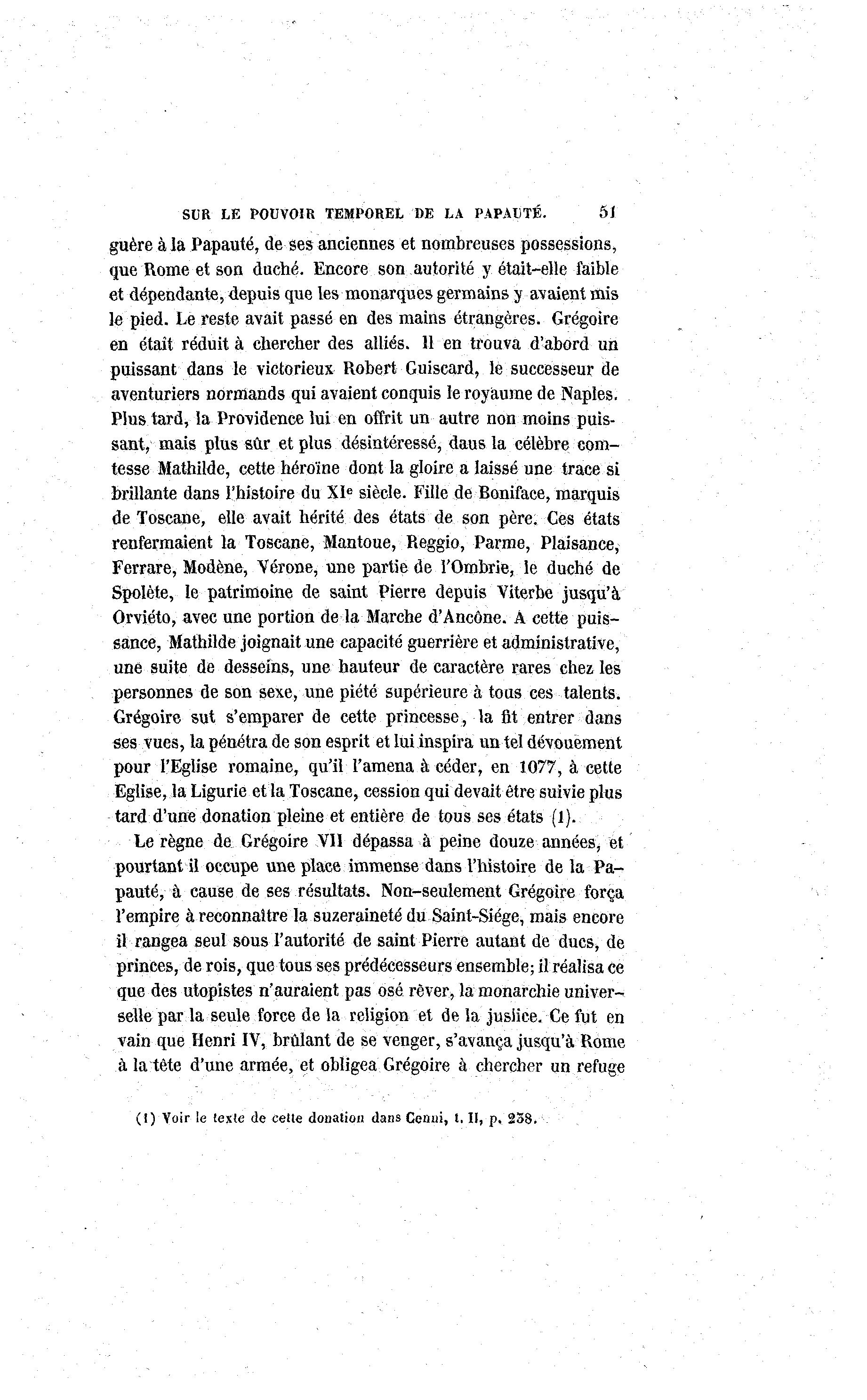 SUR LE POUVOIR TEMPOREL DE LA PAPAUTÉ. 51 guère à la Papauté, de ses anciennes et nombreuses possessions, que Rome et son duché. Encore son autorité y était-elle faible et dépendante, depuis que les monarques germains y avaient mis le pied. Le reste avait passé en des mains étrangères. Grégoire en était réduit à chercher des alliés. 11 en trouva d'abord un puissant dans le victorieux Robert Guiscard, le successeur de aventuriers normands qui avaient conquis le royaume de Naples. Plus tard, la Providence lui en offrit un autre non moins puis- sant, mais plus sûr et plus désintéressé, daus la célèbre com- tesse Mathilde, cette héroïne dont la gloire a laissé une trace si brillante dans l'histoire du XIe siècle. Fille de Boniface, marquis de Toscane, elle avait hérité des états de son père. Ces états renfermaient la Toscane, Mantoue, Reggio, Parme, Plaisance, Ferrare, Modène, Vérone, une partie de l'Ombrie, le duché de Spolète, le patrimoine de saint Pierre depuis Viterbe jusqu'à Orviéto, avec une portion de la Marche d'Ancône. À cette puis- sance, Mathilde joignait une capacité guerrière et administrative, une suite de desseins, une hauteur de caractère rares chez les personnes de son sexe, une piété supérieure à tous ces talents. Grégoire sut s'emparer de cette princesse, la fit entrer dans ses vues, la pénétra de son esprit et lui inspira un tel dévouement pour l'Eglise romaine, qu'il l'amena à céder, en 1077, à cette Eglise, la Ligurie et la Toscane, cession qui devait être suivie plus tard d'une donation pleine et entière de tous ses états (1). Le règne de Grégoire Vil dépassa à peine douze années^ et pourtant il occupe une place immense dans l'histoire de la Pa- pauté, à cause de ses résultats. Non-seulement Grégoire força l'empire à reconnaître la suzeraineté du Saint-Siège, mais encore il rangea seul sous l'autorité de saint Pierre autant de ducs, de princes, de rois, que tous ses prédécesseurs ensemble; il réalisa ce que des utopistes n'auraient pas osé rêver, la monarchie univer- selle par la seule force de la religion et de la jusiiee. Ce fut en vain que Henri IV, brûlant de se venger, s'avança jusqu'à Rome à la tête d'une armée, et obligea Grégoire à chercher un refuge (I) Voir le texle de celte donation dans Cenui, t. II, p. 238.