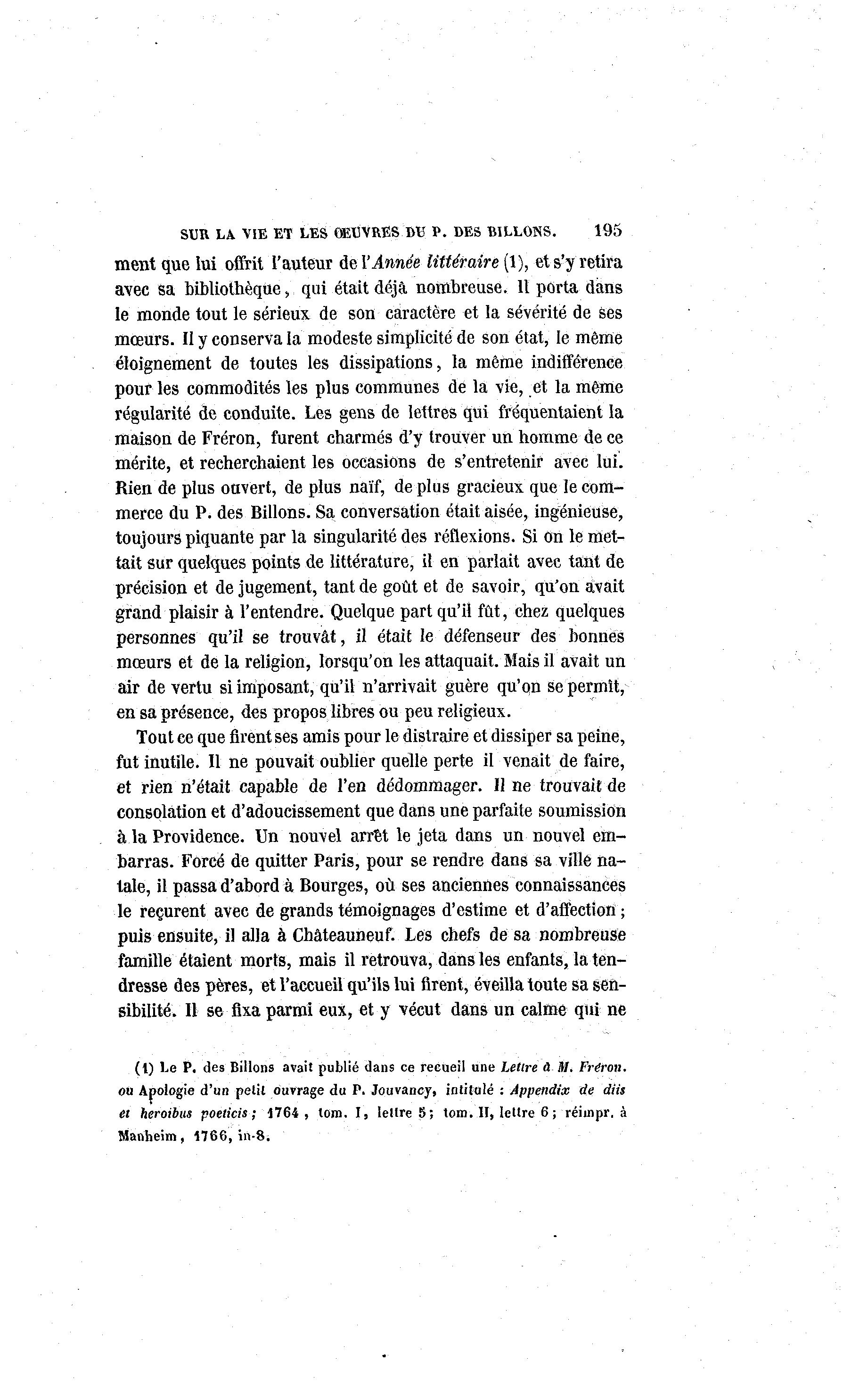 SUR LA VIE ET LES GE13VRËS »tf P. DES BILLONS. 195 ment que lui offrit l'auteur Ae l'Année littéraire (1), et s'y retira avec sa bibliothèque, qui était déjà nombreuse. Il porta dans le monde tout le sérieux de son caractère et la sévérité de ses mœurs. Il y conserva la modeste simplicité de son état, le même éloigneraient de toutes les dissipations, la même indifférence pour les commodités les plus communes de la vie, et la même régularité de conduite. Les gens de lettres qui fréquentaient la maison de Fréron, furent charmés d'y trouver un homme de ce mérite, et recherchaient les occasions de s'entretenir avec lui. Rien de plus oavert, de plus naïf, de plus gracieux que le com- merce du P. des Billons. Sa conversation était aisée, ingénieuse, toujours piquante par la singularité des réflexions. Si on le met- tait sur quelques points de littérature, il en parlait avec tant de précision et de jugement, tant de goût et de savoir, qu'on avait grand plaisir à l'entendre. Quelque part qu'il fût, chez quelques personnes qu'il se trouvât, il était le défenseur des bonnes mœurs et de la religion, lorsqu'on les attaquait. Mais il avait un air de vertu si imposant, qu'il n'arrivait guère qu'on se permît, en sa présence, des propos libres ou peu religieux. Tout ee quefirentses amis pour le distraire et dissiper sa peine, fut inutile. Il ne pouvait oublier quelle perte il venait de faire, et rien n'était capable de l'en dédommager. Il ne trouvait de consolation et d'adoucissement que dans une parfaite soumission à la Providence. Un nouvel arrêt le jeta dans un nouvel em- barras. Forcé de quitter Paris, pour se rendre dans sa ville na- tale, il passa d'abord à Bourges, où ses anciennes connaissances le reçurent avec de grands témoignages d'estime et d'affection ; puis ensuite, il alla à Châteauneuf. Les chefs dé sa nombreuse famille étaient morts, mais il retrouva, dans les enfants, la ten- dresse des pères, et l'accueil qu'ils lui firent, éveilla toute sa sen- sibilité. Il se fixa parmi eux, et y vécut dans un calme qui ne (1) Le P. des Billons avait publié dans ce recueil une Lettre à M. Fréron. ou Apologie d'un petit ouvrage du P. Jouvancy, intitulé : Appendix de dits et heroibus poeticis ; 1764, tom. I , lettre 5 ; tom. II, lettre 6 ; réiinpr. à Manheim, 1766, in-8.