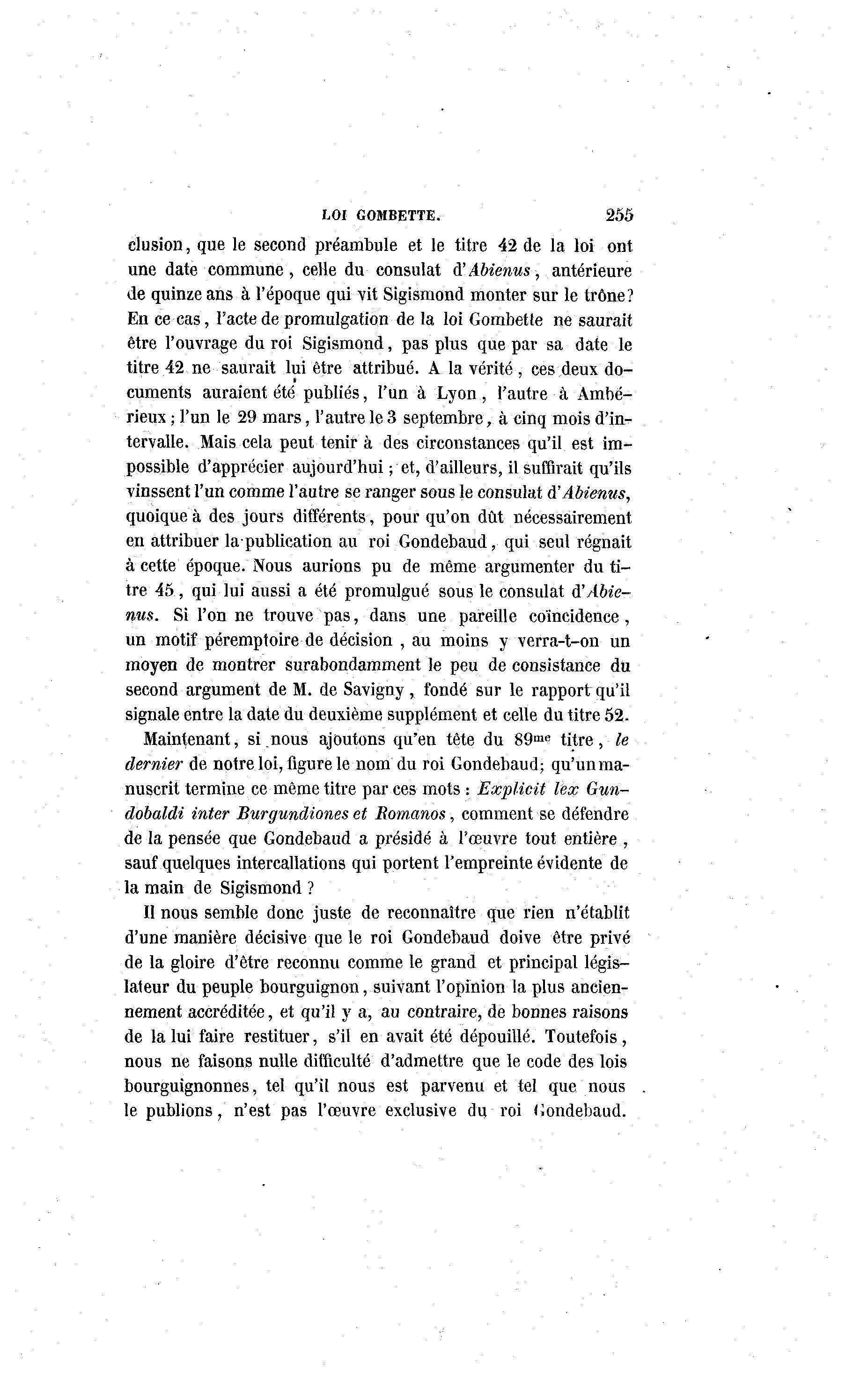 LOI GOMBETTE. 255 clusion, que le second préambule et le titre 42 de la loi ont une date commune, celle du consulat à 'Abienus, antérieure de quinze ans à l'époque qui vit Sigismond monter sur le trône? En ce cas, l'acte de promulgation de la loi Gombette ne saurait être l'ouvrage du roi Sigismond, pas plus que par sa date le titre 42 ne saurait lui être attribué. A la vérité , ces deux do- cuments auraient été publiés, l'un à Lyon, l'autre à Ambé- rieux ; l'un le 29 mars, l'autre le 3 septembre, à einq mois d'in- tervalle. Mais cela peut tenir à des circonstances qu'il est im- possible d'apprécier aujourd'hui ; et, d'ailleurs, il suffirait qu'ils vinssent l'un comme l'autre se ranger sous le consulat A'Abienus, quoique à des jours différents, pour qu'on dût nécessairement en attribuer la-publication au roi Gondebaud, qui seul régnait à cette époque. Nous aurions pu de même argumenter du ti- tre 4 5 , qui lui aussi a été promulgué sous le consulat à 'Abie- nus. Si l'on ne trouve pas, dans une pareille coïncidence, un motif péremptoire de décision , au moins y verra-t-on un moyen de montrer surabondamment le peu de consistance du second argument de M. de Savigny, fondé sur le rapport qu'il signale entre la date du deuxième supplément et celle du titre 52- Maintenant, si nous ajoutons qu'en tête du 89 me titre, le dernier de notre loi, figure le nom du roi Gondebaud; qu'un ma- nuscrit termine ce même titre par ces mots : Explicit lex Gun- dobaldi inter Burgundiones et Romanos, comment se défendre de la pensée que Gondebaud a présidé à l'œuvre tout entière , sauf quelques intercallations qui portent l'empreinte évidente de la main de Sigismond ? Il nous semble donc juste de reconnaître que rien n'établit d'une manière décisive que le roi Gondebaud doive être privé de la gloire d'être reconnu comme le grand et principal légis- lateur du peuple bourguignon, suivant l'opinion la plus ancien- nement accréditée, et qu'il y a, au contraire, de bonnes raisons de la lui faire restituer, s'il en avait été dépouillé. Toutefois, nous ne faisons nulle difficulté d'admettre que le code des lois bourguignonnes, tel qu'il nous est parvenu et tel que nous le publions, n'est pas l'œuvre exclusive du roi Gondebaud.
