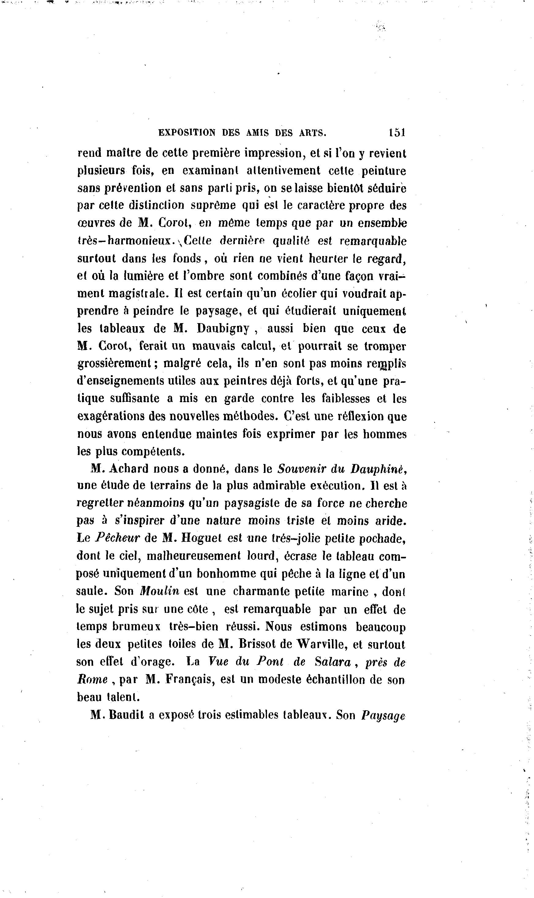 EXPOSITION DES AMIS DES ARTS. 151 rend maître de cette première impression, et si l'on y revient plusieurs fois, en examinant attentivement cette peinture sans prévention et sans parti pris, on se laisse bientôt séduire par celte distinction suprême qui est le caractère propre des œuvres de M. Corot, en même temps que par un ensemble très-harmonieux. \Cet(e dernièro qualité est remarquable surtout dans les fonds, où rien ne vient heurter le regard, et où la lumière et l'ombre sont combinés d'une façon vrai- ment magistrale. II est certain qu'un écolier qui voudrait ap- prendre à peindre le paysage, et qui étudierait uniquement les tableaux de M. Daubigny , aussi bien que ceux de M. Corot, ferait un mauvais calcul, et pourrait se tromper grossièrement ; malgré cela, ils n'en sont pas moins remplis d'enseignements utiles aux peintres déjà forts, et qu'une pra- tique suffisante a mis en garde contre les faiblesses et les exagérations des nouvelles méthodes. C'est une réflexion que nous avons entendue maintes fois exprimer par les hommes les plus compétents. M. Achard nous a donné, dans le Souvenir du Dauphinè, une étude de terrains de la plus admirable exécution. Il est à regretter néanmoins qu'un paysagiste de sa force ne cherche pas à s'inspirer d'une nature moins triste et moins aride. Le Pêcheur de M. Hoguet est une très—jolie petite pochade, dont le ciel, malheureusement lourd, écrase le tableau com- posé uniquement d'un bonhomme qui pêche à la ligne et d'un saule. Son Moulin est une charmante petite marine , dont le sujet pris sur une côte , est remarquable par un eflêt de temps brumeux très-bien réussi. Nous estimons beaucoup les deux petites toiles de M. Brissot de Warville, et surtout son effet d'orage. La Vue du Pont de Salara , près de Rome , par M. Français, est un modeste échantillon de son beau talent. M. Baudit a exposé trois estimables tableaux. Son Paysage