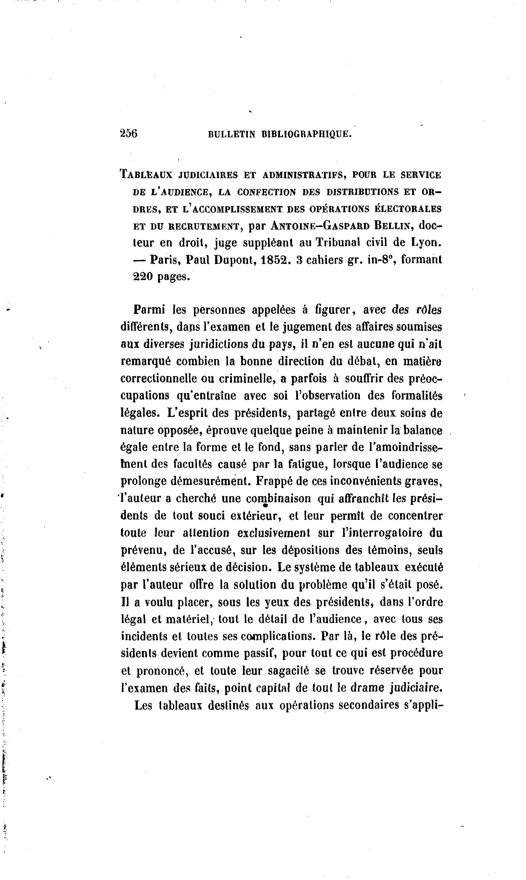 256 BULLETIN BIBLIOGRAPHIQUE. TABLEAUX JUDICIAIRES ET ADMINISTRATIFS, POUR LE SERVICE DE L'AUDIENCE, LA CONFECTION DES DISTRIBUTIONS ET OR- DRES, ET L'ACCOMPLISSEMENT DES OPÉRATIONS ÉLECTORALES ET DU RECRUTEMF.NT, par ANTOINE-GASPARD BELLIN, doC- leur en droit, juge suppléant au Tribunal civil de Lyon. — Paris, Paul Dupont, 1852. 3 cahiers gr. in-8°, formant 220 pages. Parmi les personnes appelées â figurer, avec des rôles différents, dans l'examen et le jugement des affaires soumises aux diverses juridictions du pays, il n'en est aucune qui n'ait remarqué combien la bonne direction du débat, en matière correctionnelle ou criminelle, a parfois à souffrir des préoc- cupations qu'entraîne avec soi l'observation des formalités légales. L'esprit des présidents, partagé entre deux soins de nature opposée, éprouve quelque peine à maintenir la balance égale entre la forme et le fond, sans parler de l'amoindrisse- ment des facultés causé par la fatigue, lorsque l'audience se prolonge démesurément. Frappé de ces inconvénients graves, l'auteur a cherché une combinaison qui affranchît les prési- dents de tout souci extérieur, et leur permît de concentrer toute leur attention exclusivement sur l'interrogatoire du prévenu, de l'accusé, sur les dépositions des témoins, seuls éléments sérieux de décision. Le système de tableaux exécuté par l'auteur offre la solution du problème qu'il s'était posé. Il a voulu placer, sous les yeux des présidents, dans l'ordre légal et matériel, tout le détail de l'audience, avec tous ses incidents et toutes ses complications. Par là , le rôle des pré- sidents devient comme passif, pour tout ce qui est procédure et prononcé, et toute leur sagacité se trouve réservée pour l'examen des faits, point capital de tout le drame judiciaire. Les tableaux destinés aux opérations secondaires s'appli-