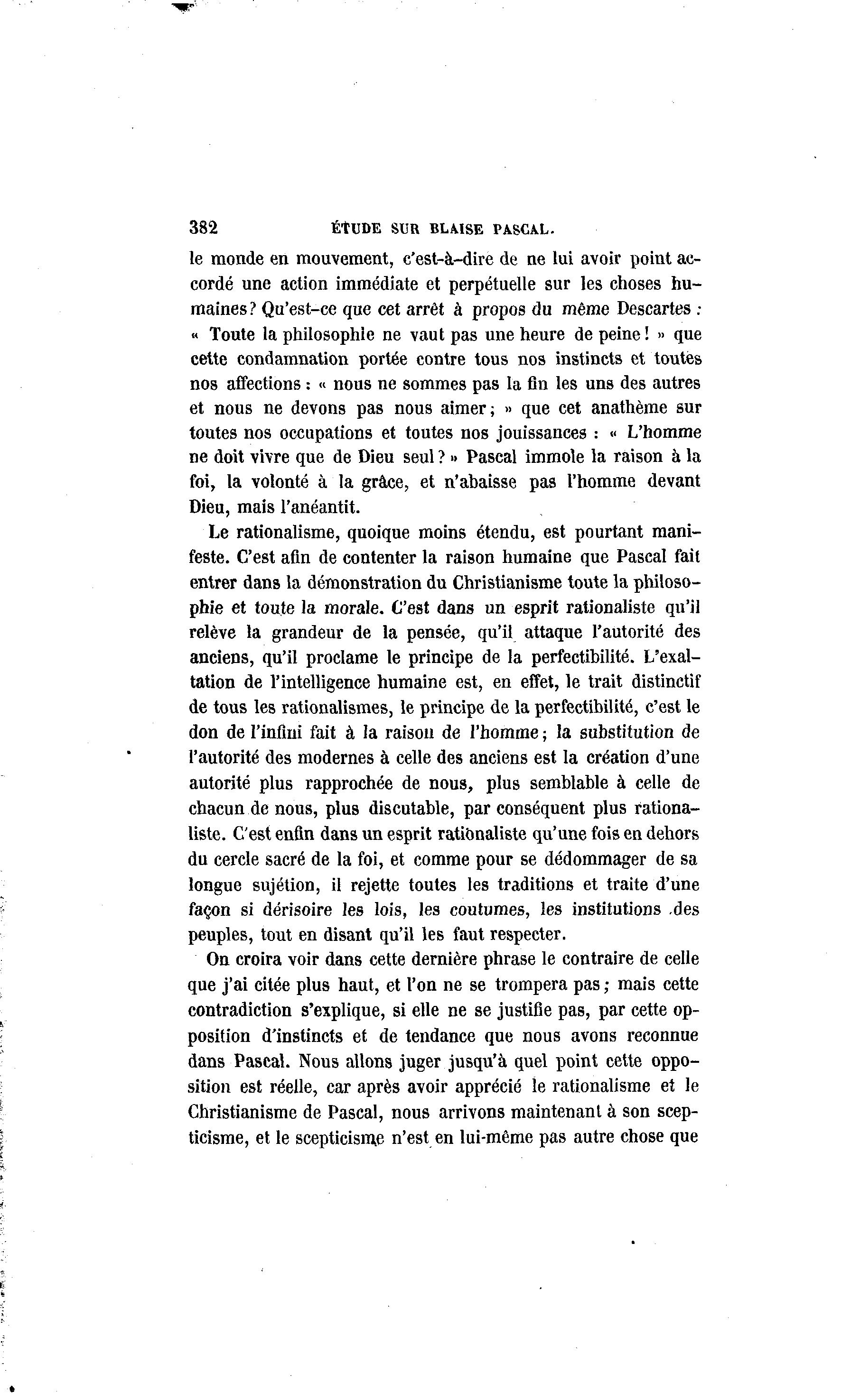 382 ÉtUDE SUR BLAISE PASCAL. le monde en mouvement, c'est-à -dire de ne lui avoir point ac- cordé une action immédiate et perpétuelle sur les choses hu- maines ? Qu'est-ce que cet arrêt à propos du même Descartes : « Toute la philosophie ne vaut pas une heure de peine! » que cette condamnation portée contre tous nos instincts et toutes nos affections : « nous ne sommes pas la fin les uns des autres et nous ne devons pas nous aimer; » que cet anathème sur toutes nos occupations et toutes nos jouissances : « L'homme ne doit vivre que de Dieu seul ? » Pascal immole la raison à la foi, la volonté à la grâce, et n'abaisse pas l'homme devant Dieu, mais l'anéantit. Le rationalisme, quoique moins étendu, est pourtant mani- feste. C'est afin de contenter la raison humaine que Pascal fait entrer dans la démonstration du Christianisme toute la philoso- phie et toute la morale. C'est dans un esprit rationaliste qu'il relève la grandeur de la pensée, qu'il attaque l'autorité des anciens, qu'il proclame le principe de la perfectibilité. L'exal- tation de l'intelligence humaine est, en effet, le trait distinctif de tous les rationalismes, le principe de la perfectibilité, c'est le don de l'infini fait à la raison de l'homme ; la substitution de l'autorité des modernes à celle des anciens est la création d'une autorité plus rapprochée de nous, plus semblable à celle de chacun de nous, plus discutable, par conséquent plus rationa- liste. C'est enfin dans un esprit rationaliste qu'une fois en dehors du cercle sacré de la foi, et comme pour se dédommager de sa longue sujétion, il rejette toutes les traditions et traite d'une façon si dérisoire les lois, les coutumes, les institutions .des peuples, tout en disant qu'il les faut respecter. On croira voir dans cette dernière phrase le contraire de celle que j'ai citée plus haut, et l'on ne se trompera pas ; mais cette contradiction s'explique, si elle ne se justifie pas, par cette op- position d'instincts et de tendance que nous avons reconnue dans Pascal. Nous allons juger jusqu'à quel point cette oppo- sition est réelle, car après avoir apprécié le rationalisme et le Christianisme de Pascal, nous arrivons maintenant à son scep- ticisme, et le scepticisme n'est en lui-même pas autre chose que