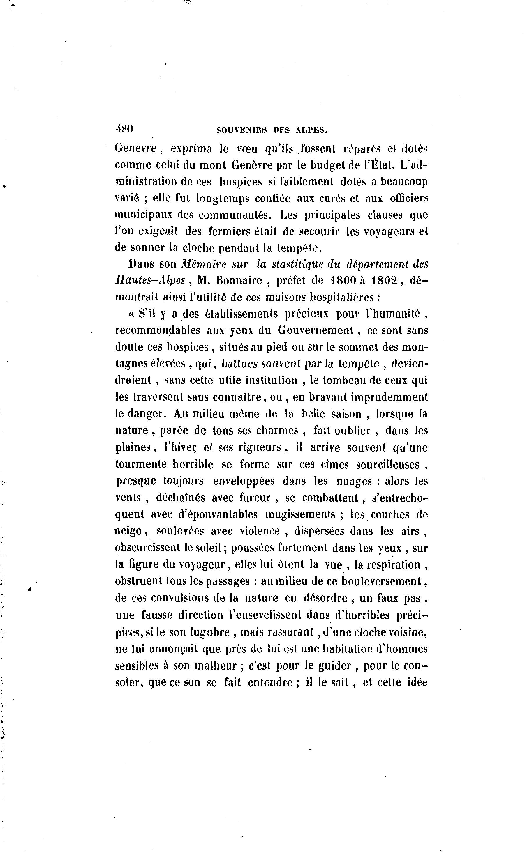 480 SOUVENIRS DES ALPES. Genèvre , exprima le vœu qu'ils .fussent réparés el dotés comme celui du mont Genèvre par le budget de l'État. L'ad- ministration de ces hospices si faiblement dotés a beaucoup varié ; elle fut longtemps confiée aux curés et aux officiers municipaux des communautés. Les principales clauses que l'on exigeait des fermiers était de secourir les voyageurs et de sonner la cloche pendant la tempête. Dans son Mémoire sur la stastiïique du département des Hautes-Alpes , M. Bonnaire , préfet de 1800 à 1802, dé- montrait ainsi l'utilité de ces maisons hospitalières : « S'il y a des établissements précieux pour l'humanité , recommandables aux yeux du Gouvernement , ce sont sans doute ces hospices, situés au pied ou sur le sommet des mon- tagnes élevées , qui, battues souvent parla tempête , devien- draient , sans celte utile institution , le tombeau de ceux qui les traversent sans connaître, ou , en bravant imprudemment le danger. Au milieu môme de la belle saison , lorsque la nature , parée de lous ses charmes , fait oublier , dans les plaines, l'hiver, et ses rigueurs, il arrive souvent qu'une tourmente horrible se forme sur ces cîmes sourcilleuses , presque toujours enveloppées dans les nuages : alors les vents , déchaînés avec fureur , se combattent, s'entrecho- quent avec d'épouvantables mugissements; les couches de neige, soulevées avec violence , dispersées dans les airs , obscurcissent le soleil; poussées fortement dans les yeux , sur la figure du voyageur, elles lui ôtent la vue , la respiration , obstruent lous les passages : au milieu de ce bouleversement, de ces convulsions de la nature en désordre , un faux pas , une fausse direction l'ensevelissent dans d'horribles préci- pices, si le son lugubre , mais rassurant, d'tine cloche voisine, ne lui annonçait que près de lui est une habilation d'hommes sensibles à son malheur ; c'est pour le guider, pour le con- soler, que ce son se fait entendre ; il le sait , et cette idée
