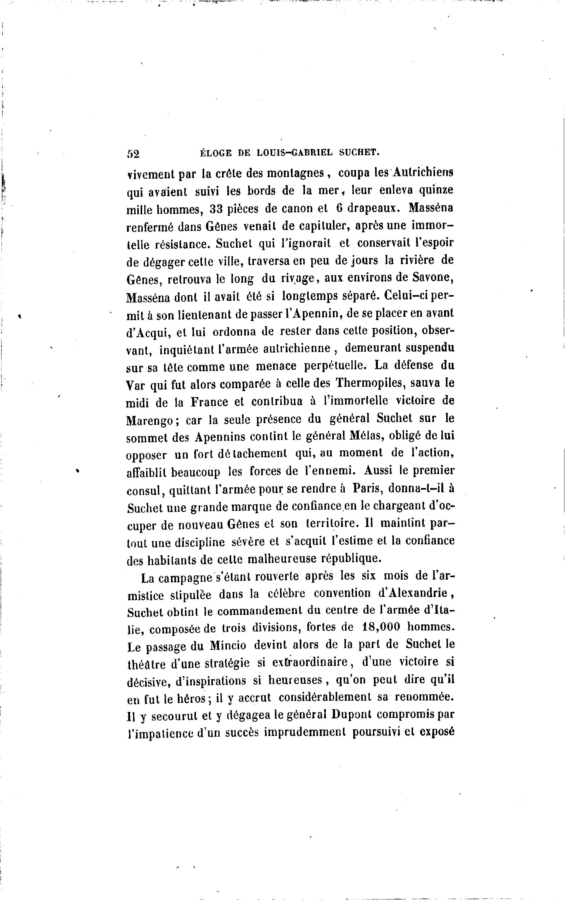52 ÉLOGE DE LOUIS-GABRIEL SUCHET. vivement par la crête des montagnes, coupa les Autrichiens qui avaient suivi les bords de la mer, leur enleva quinze mille hommes, 33 pièces de canon et 6 drapeaux. Masséna renfermé dans Gênes venait de capituler, après une immor- telle résistance. Suchet qui l'ignorait et conservait l'espoir de dégager cette ville, traversa en peu de jours la rivière de Gênes, retrouva le long du rivage, aux environs de Savone, Masséna dont il avait été si longtemps séparé. Celui-ci per- mit à son lieutenant de passer l'Apennin, de se placer en avant d'Acqui, et lui ordonna de rester dans cette position, obser- vant, inquiétant l'armée autrichienne , demeurant suspendu sur sa tête comme une menace perpétuelle. La défense du Var qui fut alors comparée à celle des Thermopiles, sauva le midi de la France et contribua à l'immortelle victoire de Marengo; car la seule présence du général Suchet sur le sommet des Apennins contint le général Mêlas, obligé de lui opposer un fort détachement qui, au moment de l'action, affaiblit beaucoup les forces de l'ennemi. Aussi le premier consul, quittant l'armée pour se rendre à Paris, donna-t-il à Suchet une grande marque de confianceen le chargeant d'oc- cuper de nouveau Gênes et son territoire. 11 maintint par- tout une discipline sévère et s'acquit l'estime et la confiance des habitants de celte malheureuse république. La campagne s'étant rouverte après les six mois de l'ar- mistice stipulée dans la célèbre convention d'Alexandrie, Suchet obtint le commandement du centre de l'armée d'Ita- lie, composée de trois divisions, fortes de 18,000 hommes. Le passage du Mincio devint alors de la part de Suchet le théâtre d'une stratégie si extraordinaire, d'une victoire si décisive, d'inspirations si heureuses , qu'on peut dire qu'il en fut le héros; il y accrut considérablement sa renommée. Il y secourut et y dégagea le général Dupont compromis par l'impatience d'un succès imprudemment poursuivi et exposé