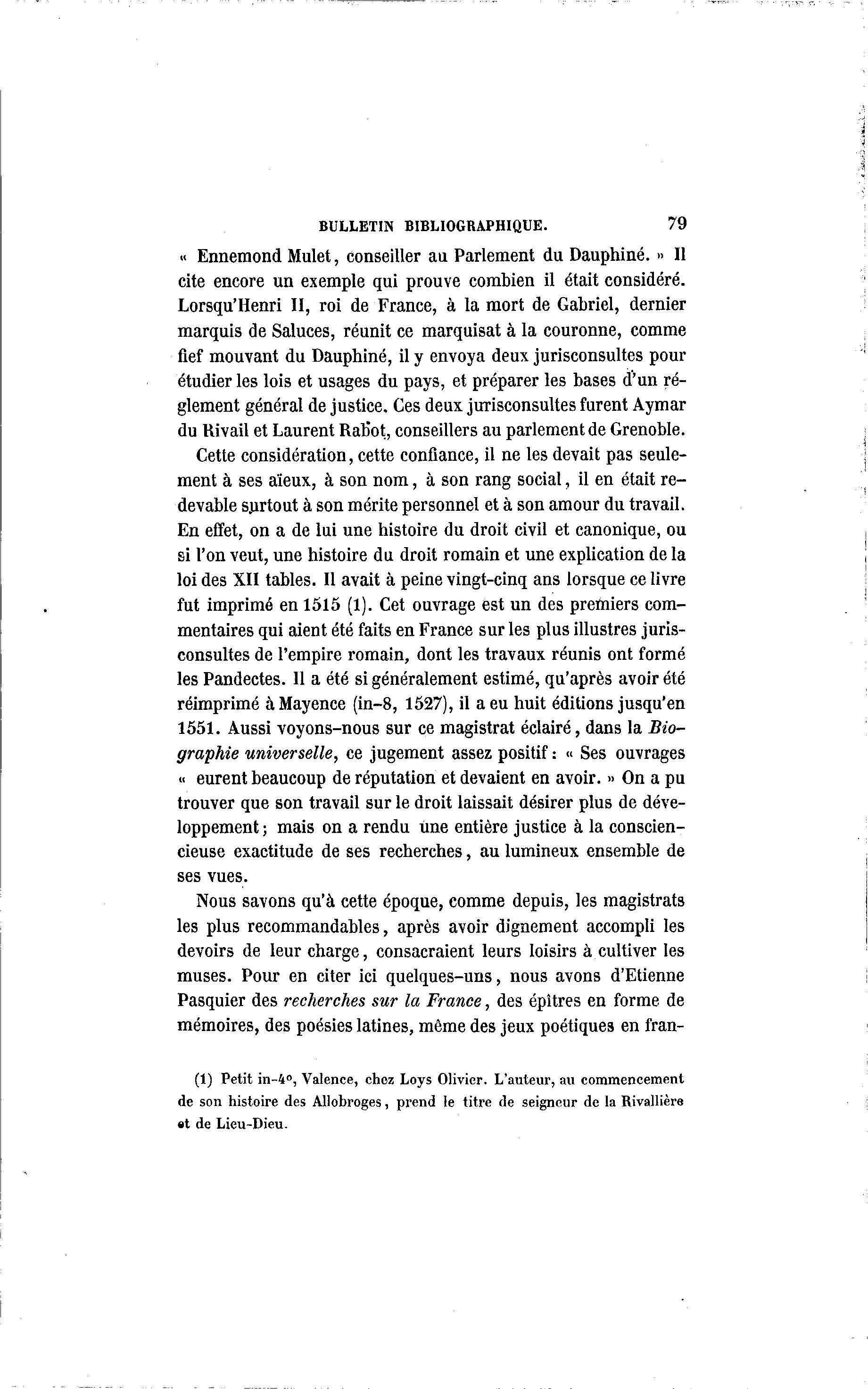 BULLETIN BIBLIOGRAPHIQUE. 79 « Ennemond Mulet, conseiller au Parlement du Dauphiné. » Il cite encore un exemple qui prouve combien il était considéré. Lorsqu'Henri II, roi de France, à la mort de Gabriel, dernier marquis de Saluées, réunit ce marquisat à la couronne, comme fief mouvant du Dauphiné, il y envoya deux jurisconsultes pour étudier les lois et usages du pays, et préparer les bases d'un rè- glement général de justice. Ces deux jurisconsultes furent Aymar du Rivail et Laurent RaHot, conseillers au parlement de Grenoble. Cette considération, cette confiance, il ne les devait pas seule- ment à ses aïeux, à son nom, à son rang social, il en était re- devable surtout à son mérite personnel et à son amour du travail. En effet, on a de lui une histoire du droit civil et canonique, ou si l'on veut, une histoire du droit romain et une explication de la loi des XII tables. Il avait à peine vingt-cinq ans lorsque ce livre fut imprimé en 1515 (1). Cet ouvrage est un des premiers com- mentaires qui aient été faits en France sur les plus illustres juris- consultes de l'empire romain, dont les travaux réunis ont formé les Pandectes. 11 a été si généralement estimé, qu'après avoir été réimprimé à Mayence (in-8, 1527), il a eu huit éditions jusqu'en 1551. Aussi voyons-nous sur ce magistrat éclairé, dans la Bio- graphie universelle, ce jugement assez positif : « Ses ouvrages « eurent beaucoup de réputation et devaient en avoir. » On a pu trouver que son travail sur le droit laissait désirer plus de déve- loppement; mais on a rendu une entière justice à la conscien- cieuse exactitude de ses recherches, au lumineux ensemble de ses vues. Nous savons qu'à cette époque, comme depuis, les magistrats les plus recommandables, après avoir dignement accompli les devoirs de leur charge, consacraient leurs loisirs à cultiver les muses. Pour en citer ici quelques-uns, nous avons d'Etienne Pasquier des recherches sur la France, des épîtres en forme de mémoires, des poésies latines, même des jeux poétiques en fran- (1) Petit in-4°, Valence, chez Loys Olivier. L'auteur, au commencement de son histoire des Allobroges, prend le titre de seigneur de la Rivallière «t de Lieu-Dieu.
