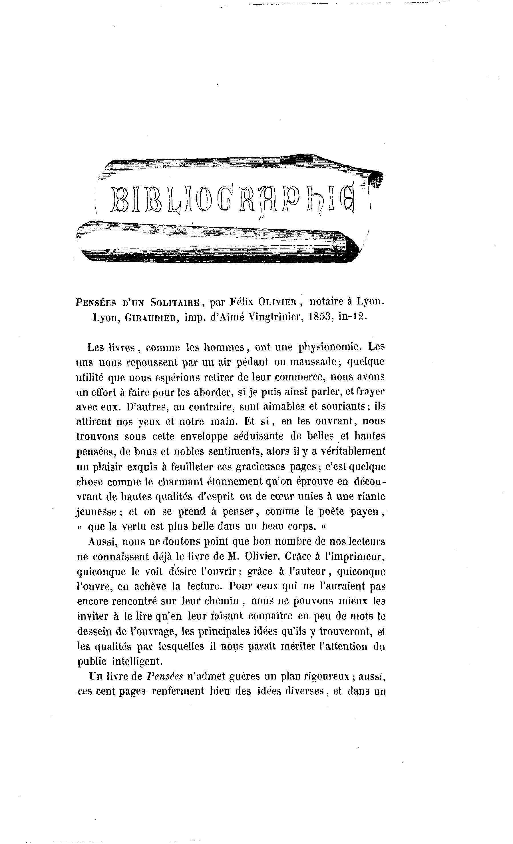 PENSÉES D'UN SOLITAIRE, par Félix OLIVIER , notaire à Lyon.
