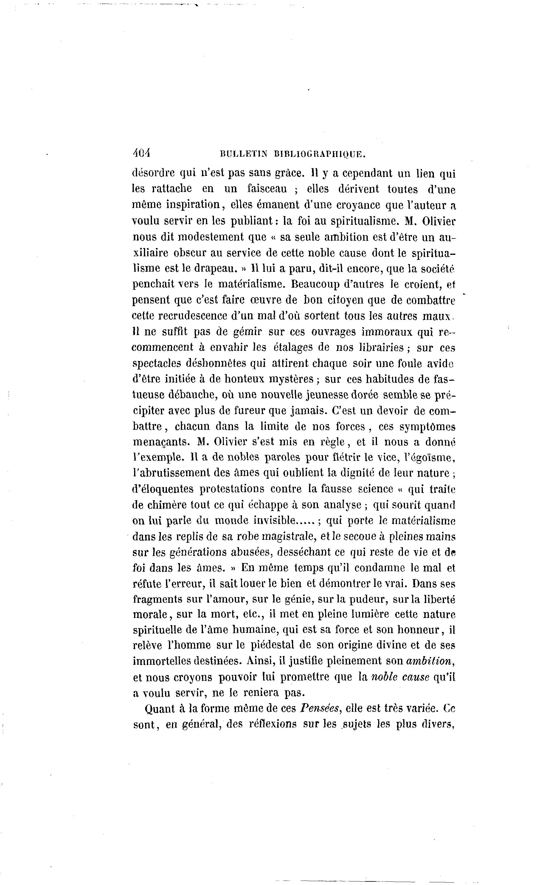 404 BULLETIN BIBLIOGRAPHIQUE. désordre qui n'est pas sans grâce. H y a cependant un lien qui les rattache en un faisceau ; elles dérivent toutes d'une même inspiration, elles émanent d'une croyance que l'auteur a voulu servir en les publiant : la foi au spiritualisme. M. Olivier nous dit modestement que « sa seule ambition est d'être un au- xiliaire obscur au service de cette noble cause dont le spiritua- lisme est le drapeau. » 11 lui a paru, dit-il encore, que la société penchait vers le matérialisme. Beaucoup d'autres le croient, et pensent que c'est faire œuvre de bon citoyen que de combattre cette recrudescence d'un mal d'où sortent tous les autres maux. 11 ne suffit pas de gémir sur ces ouvrages immoraux qui re- commencent à envahir les étalages de nos librairies ; sur ces spectacles déshonnêtes qui attirent chaque soir une foule avide d'être initiée à de honteux mystères ; sur ces habitudes de fas- tueuse débauche, où une nouvelle jeunesse dorée semble se pré- cipiter avec plus de fureur que jamais. C'est un devoir de com- battre , chacun dans la limite de nos forces , ces symptômes menaçants. M. Olivier s'est mis en règle, et il nous a donné l'exemple. 11 a de nobles paroles pour flétrir le vice, l'égoïsme, l'abrutissement des âmes qui oublient la dignité de leur nature ; d'éloquentes protestations contre la fausse science « qui traite de chimère tout ce qui échappe à son analyse ; qui sourit quand on lui parle du monde invisible ; qui porte le matérialisme dans les replis de sa robe magistrale, et le secoue à pleines mains sur les générations abusées, desséchant ce qui reste de vie et de foi dans les âmes. » En même temps qu'il condamne le mal et réfute l'erreur, il sait louer le bien et démontrer le vrai. Dans ses fragments sur l'amour, sur le génie, sur la pudeur, sur la liberté morale, sur la mort, etc., il met en pleine lumière cette nature spirituelle de l'âme humaine, qui est sa force et son honneur, il relève l'homme sur le piédestal de son origine divine et de ses immortelles destinées. Ainsi, il justifie pleinement son ambition, et nous croyons pouvoir lui promettre que la noble cause qu'il a voulu servir, ne le reniera pas. Quant à la forme même de ces Pensées, elle est très variée. Ce sont, en général, des réflexions sur les sujets les plus divers,