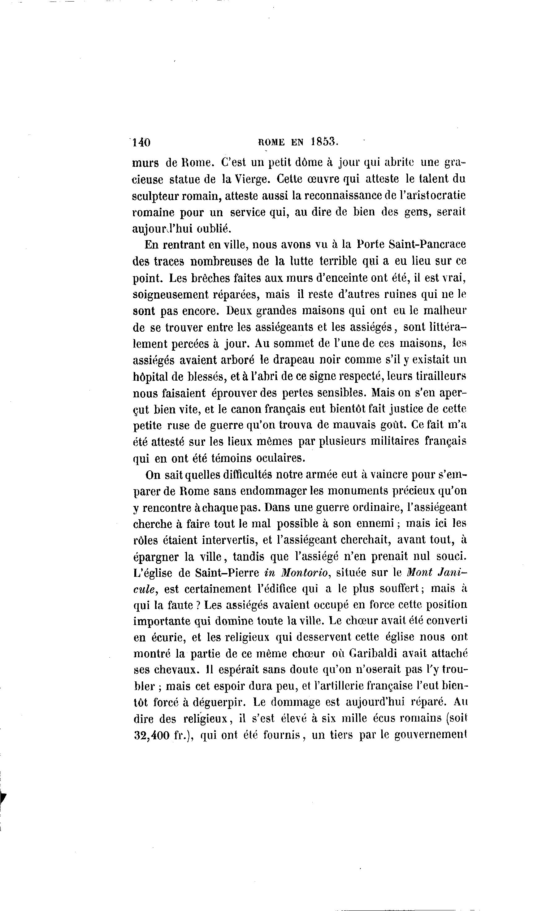 140 «OME EN 1853. murs de Rome. C'est un petit dôme à jour qui abrite une gra- cieuse statue de la Vierge. Cette œuvre qui atteste le talent du sculpteur romain, atteste aussi la reconnaissance de l'aristocratie romaine pour un service qui, au dire de bien des gens, serait aujourvl'hui oublié. En rentrant en ville, nous avons vu à la Porte Saint-Pancrace des traces nombreuses de la lutte terrible qui a eu lieu sur ce- point. Les brèches faites aux murs d'enceinte ont été, il est vrai, soigneusement réparées, mais il reste d'autres ruines qui ne le sont pas encore. Deux grandes maisons qui ont eu le malheur de se trouver entre les assiégeants et les assiégés, sont littéra- lement percées à jour. Au sommet de l'une de ces maisons, les assiégés avaient arboré le drapeau noir comme s'il y existait un hôpital de blessés, et à l'abri de ce signe respecté, leurs tirailleurs nous faisaient éprouver des pertes sensibles. Mais on s'en aper- çut bien vite, et le canon français eut bientôt fait justice de cette petite ruse de guerre qu'on trouva de mauvais goût. Ce fait m'a été attesté sur les lieux mêmes par plusieurs militaires français qui en ont été témoins oculaires. On sait quelles difficultés notre armée eut à vaincre pour s'em- parer de Rome sans endommager les monuments précieux qu'on y rencontre à chaque pas. Dans une guerre ordinaire, l'assiégeant cherche à faire tout le mal possible à son ennemi ; mais ici les rôles étaient intervertis, et l'assiégeant cherchait, avant tout, à épargner la ville, tandis que l'assiégé n'en prenait nul souci. L'église de Saint-Pierre in Montorio, située sur le Mont Jani- cule, est certainement l'édifice qui a le plus souffert; mais à qui la faute ? Les assiégés avaient occupé en force cette position importante qui domine toute la ville. Le chœur avait été converti en écurie, et les religieux qui desservent cette église nous ont montré la partie de ce même chœur où Garibaldi avait attaché ses chevaux. 11 espérait sans doute qu'on n'oserait pas l'y trou- bler ; mais cet espoir dura peu, et l'artillerie française l'eut bien- tôt forcé à déguerpir. Le dommage est aujourd'hui réparé. Au dire des religieux, il s'est élevé à six mille écus romains (soit 32,400 fr.), qui ont été fournis, un tiers par le gouvernement