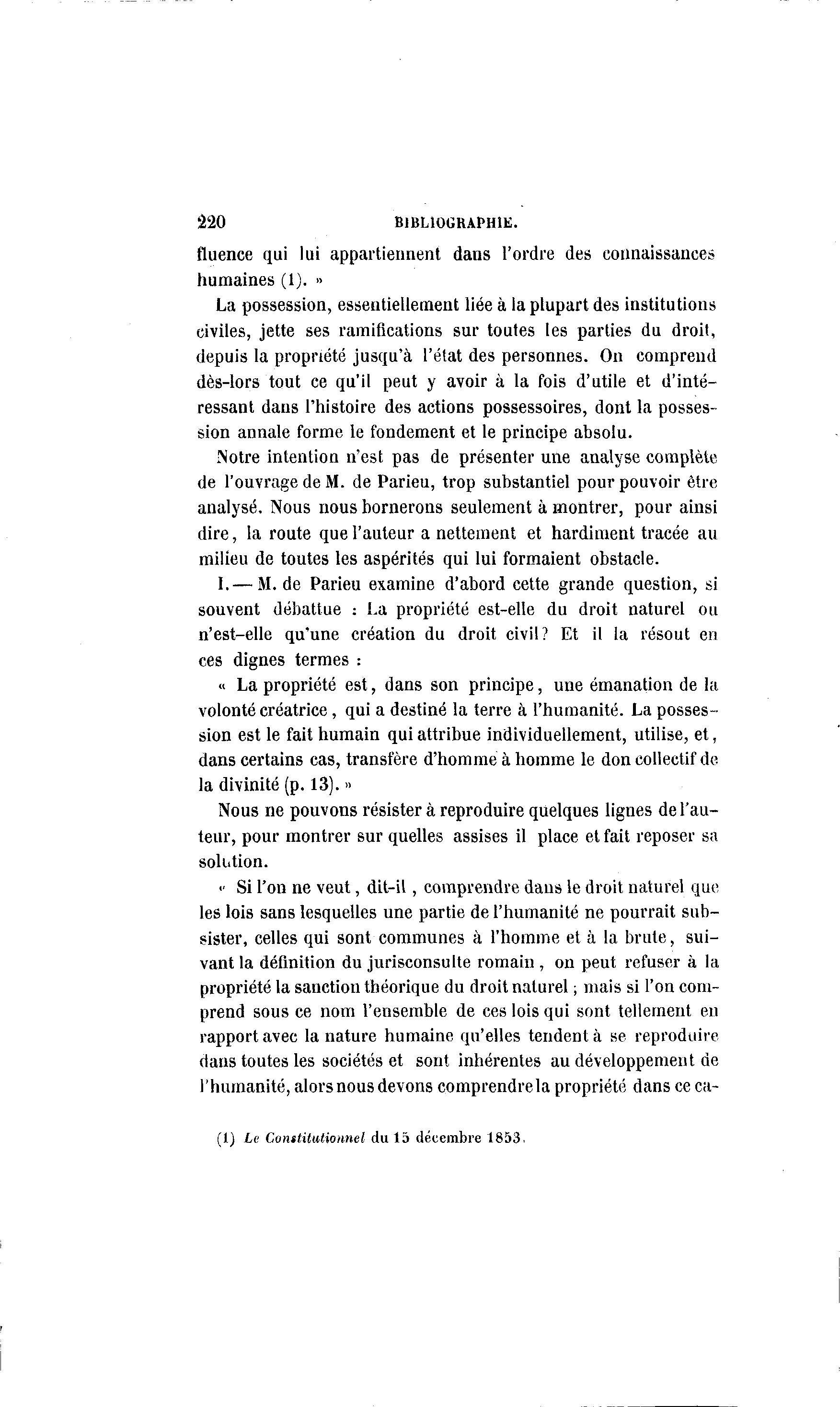 220 BIBLIOGRAPHIE. fluence qui lui appartiennent dans l'ordre des connaissances humaines (1). » La possession, essentiellement liée à la plupart des institutions civiles, jette ses ramifications sur toutes les parties du droit, depuis la propriété jusqu'à l'état des personnes. On comprend dès-lors tout ce qu'il peut y avoir à la fois d'utile et d'inté- ressant dans l'histoire des actions possessoires, dont la posses- sion annale forme le fondement et le principe absolu. Notre intention n'est pas de présenter une analyse complète de l'ouvrage de M. de Parieu, trop substantiel pour pouvoir être analysé. Nous nous bornerons seulement à montrer, pour ainsi dire, la route que l'auteur a nettement et hardiment tracée au milieu de toutes les aspérités qui lui formaient obstacle. I. — M. de Parieu examine d'abord cette grande question, si souvent débattue : La propriété est-elle du droit naturel ou n'est-elle qu'une création du droit civil? Et il la résout en ces dignes termes : « La propriété est, dans son principe, une émanation de la volonté créatrice, qui a destiné la terre à l'humanité. La posses- sion est le fait humain qui attribue individuellement, utilise, et, dans certains cas, transfère d'homme à homme le don collectif de la divinité (p. 13). » Nous ne pouvons résister à reproduire quelques lignes de l'au- teur, pour montrer sur quelles assises il place et fait reposer sa solution. " Si l'on ne veut, dit-il, comprendre dans le droit naturel que les lois sans lesquelles une partie de l'humanité ne pourrait sub- sister, celles qui sont communes à l'homme et à la brute, sui- vant la définition du jurisconsulte romain , on peut refuser à la propriété la sanction théorique du droit naturel ; mais si l'on com- prend sous ce nom l'ensemble de ces lois qui sont tellement eu rapport avec la nature humaine qu'elles tendent à se reproduire dans toutes les sociétés et sont inhérentes au développement de rhumanité, alors nous devons comprendrela propriété dans ce ca- (1) Le Constitutionnel du 15 décembre 1853.