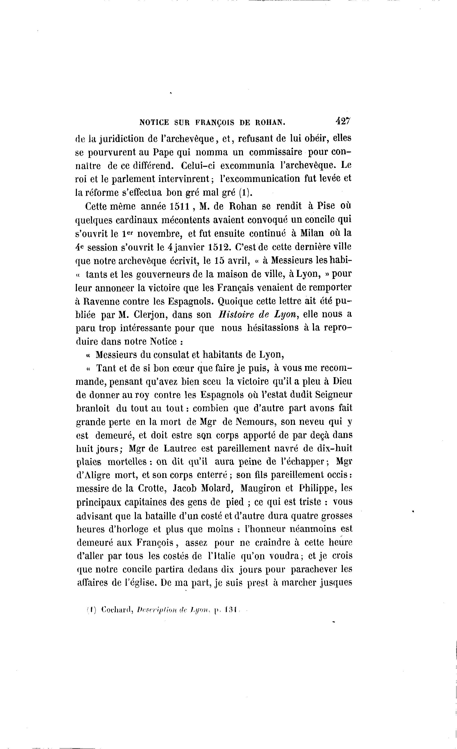 NOTICE SUR FRANÇOIS DE ROUAN. 427 de la juridiction de l'archevêque, et, refusant de lui obéir, elles se pourvurent au Pape qui nomma un commissaire pour con- naître de ce différend. Celui-ci excommunia l'archevêque. Le roi et le parlement intervinrent ; l'excommunication fut levée et la réforme s'effectua bon gré mal gré (1). Cette même année 1511 , M. de Rohan se rendit à Pise où quelques cardinaux mécontents avaient convoqué un concile qui s'ouvrit le 1 er novembre, et fut ensuite continué à Milan où la 4e session s'ouvrit le 4 janvier 1512. C'est de cette dernière ville que notre archevêque écrivit, le 15 avril, « à Messieurs leshabi- « tants et les gouverneurs de la maison de ville, à Lyon, » pour leur annoncer la victoire que les Français venaient de remporter à Ravenne contre les Espagnols. Quoique cette lettre ait été pu- bliée par M. Clerjon, dans son Histoire de Lyon, elle nous a paru trop intéressante pour que nous hésitassions à la repro- duire dans notre Notice : « Messieurs du consulat et habitants de Lyon, •• Tant et de si bon cœur que faire je puis, à vous me recom- mande, pensant qu'avez bien sceu la victoire qu'il a pieu à Dieu de donner au roy contre les Espagnols où Vestat dudit Seigneur branloit du tout au tout : combien que d'autre part avons fait grande perte en la mort de Mgr de Nemours, son neveu qui y est demeuré, et doit estre son corps apporté de par deçà dans huit jours; Mgr de Lautrec est pareillement navré de dix-huit plaies mortelles : on dit qu'il aura peine de l'échapper ; Mgr d'Aligre mort, et son corps enterré ; son fils pareillement occis : messire de la Crotte, Jacob Molard, Maugiron et Philippe, les principaux capitaines des gens de pied ; ce qui est triste : vous advisant que la bataille d'un costé et d'autre dura quatre grosses heures d'horloge et plus que moins : l'honneur néanmoins est demeuré aux François, assez pour ne craindre à cette heure d'aller par tous les costés de l'Italie qu'on voudra; et je crois que notre concile partira dedans dix jours pour parachever les affaires de l'église. De ma part, je suis prest à marcher jusques ' I ) Coi'hard, I>. (31