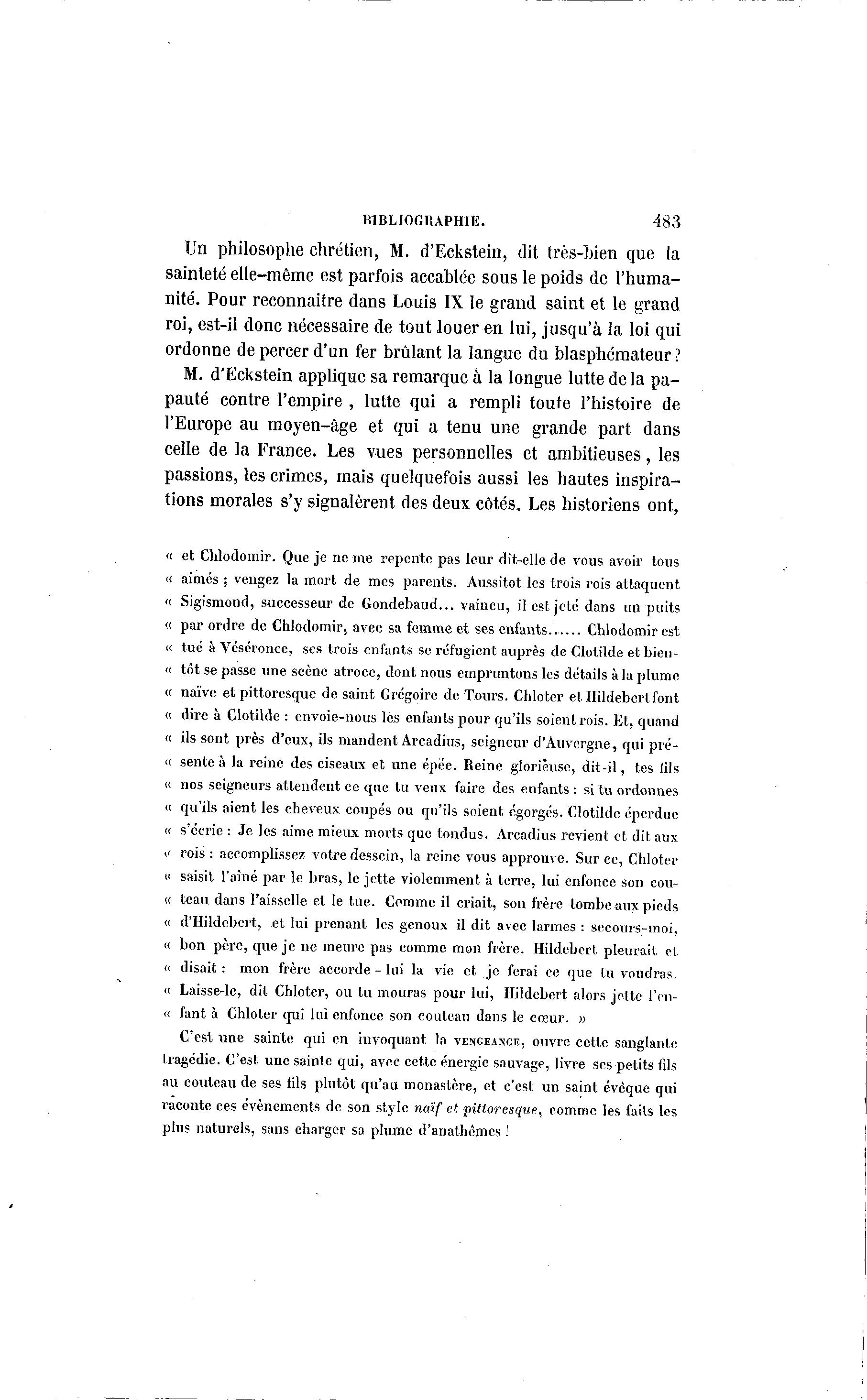 BIBLIOGRAPHIE. 483 Un philosophe chrétien, M. d'Eckstein, dit très-Lien que la sainteté elle-même est parfois accablée sous le poids de l'huma- nité. Pour reconnaître dans Louis IX le grand saint et le grand roi, est-il donc nécessaire de tout louer en lui, jusqu'à la loi qui ordonne de percer d'un fer brûlant la langue du blasphémateur? M. d'Eckstein applique sa remarque à la longue lutte delà pa- pauté contre l'empire , lutte qui a rempli toute l'histoire de l'Europe au moyen-âge et qui a tenu une grande part dans celle de la France. Les vues personnelles et ambitieuses, les passions, les crimes, mais quelquefois aussi les hautes inspira- tions morales s'y signalèrent des deux côtés. Les historiens ont, (c et Chlodomir. Que je ne me repente pas leur dit-elle de vous avoir tous « aimes ; vengez la mort de mes parents. Aussitôt les trois rois attaquent « Sigismond, successeur de Gondebaud... vaincu, il est jeté dans un puits « par ordre de Chlodomir, avec sa femme et ses enfants Chlodomir est « tué à Véscronce, ses trois enfants se réfugient auprès de Clotilde et bien- < tôt se passe une scène atroce, dont nous empruntons les détails à la plume c « naïve et pittoresque de saint Grégoire de Tours. Chloter et, Hildebertfont < dire à Clotilde : envoie-nous les enfants pour qu'ils soient rois. Et, quand ( « ils sont près d'eux, ils mandent Arcadius, seigneur d'Auvergne, qui pré- ci sente à la reine des ciseaux et une épéc. Reine glorieuse, dit-il, tes lils « nos seigneurs attendent ce que tu veux faire des enfants : si tu ordonnes « qu'ils aient les cheveux coupés ou qu'ils soient égorgés. Clotilde éperdue « s'écrie : Je les aime mieux morts que tondus. Arcadius revient et dit aux « rois : accomplissez votre dessein, la reine vous approuve. Sur ce, Chloter « saisit l'aîné par le bras, le jette violemment à terre, lui enfonce son cou- « teau dans l'aisselle et le tue. Comme il criait, son frère tombeaux pieds « d'Hildebert, et lui prenant les genoux il dit avec larmes : secours-moi, « bon père, que je ne meure pas comme mon frère. Hildebert pleurait et « disait : mon frère accorde - lui la vie et je ferai ce que lu voudras. « Laisse-le, dit Chloter, ou tu mouras pour lui, Hildebert alors jette l'en- « fant à Chloter qui lui enfonce son couteau dans le cœur. » C'est une sainte qui en invoquant la VENGEANCE, ouvre cette sanglante tragédie. C'est une sainte qui, avec cette énergie sauvage, livre ses petits fils au couteau de ses fils plutôt qu'au monastère, et c'est un saint évèque qui raconte ces événements de son style naïf et pittoresque, comme les faits les plus naturels, sans charger sa plume d'analhêmes !