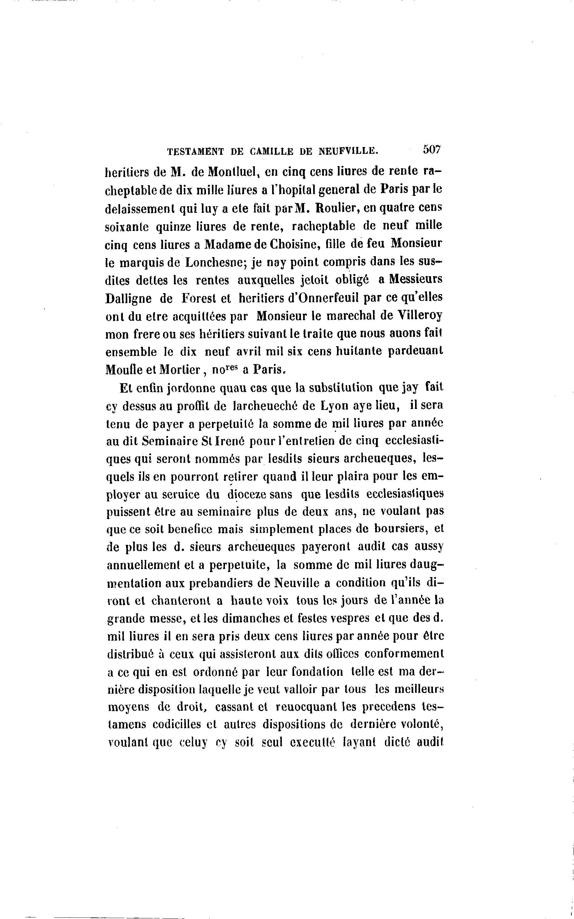 TESTAMENT DE CAMILLE DE NEUFV1LLE. 507 héritiers de M. de Monlluel, en cinq cens liures de renie ra- cheptable de dix mille liures a l'hôpital gênerai de Paris par le délaissement qui luy a ete fait par M. Roulier, en quatre cens soixante quinze liures de rente, racheptable de neuf mille cinq cens liures a Madame de Choisine, fille de feu Monsieur le marquis de Lonchesne; je nay point compris dans les sus- dites dettes les rentes auxquelles jetoit obligé a Messieurs Dalligne de Forest et héritiers d'Onnerfeuil par ce qu'elles ont du être acquittées par Monsieur le maréchal de Villeroy mon frère ou ses héritiers suivant le traite que nous auons fait ensemble le dix neuf avril mil six cens huilante pardeuanl Moufle et Mortier, nores a Paris, Et enfin jordonne quau cas que la substitution que jay fait cy dessus au proffil de larcheueché de Lyon aye lieu, il sera tenu de payer a perpétuité la somme de mil liures par année au dit Séminaire Stlrené pour l'entretien de cinq ecclésiasti- ques qui seront nommés par lesdits sieurs archeueques, les- quels ils en pourront retirer quand il leur plaira pour les em- ployer au seruice du dioceze sans que lesdils ecclésiastiques puissent être au séminaire plus de deux ans, ne voulant pas que ce soit bénéfice mais simplement places de boursiers, et de plus les d. sieurs archeueques payeront audit cas aussy annuellement et a perpétuité, la somme de mil liures daug- mentalion aux prebandiers de Neuville a condition qu'ils di- ront et chanteront a haute voix tous les jours de l'année la grande messe, elles dimanches et fesles vespres et que desd. mil liures il en sera pris deux cens liures par année pour êlrc distribué à ceux qui assisteront aux dits offices conformément a ce qui en est ordonné par leur fondation telle est ma der- nière disposition laquelle je veut valloir par tous les meilleurs moyens de droit, cassant et reuocquanl les precedens les- tamens codicilles el autres dispositions de dernière volonté, voulant que celuy cy soit seul execullé (ayant dicté audit