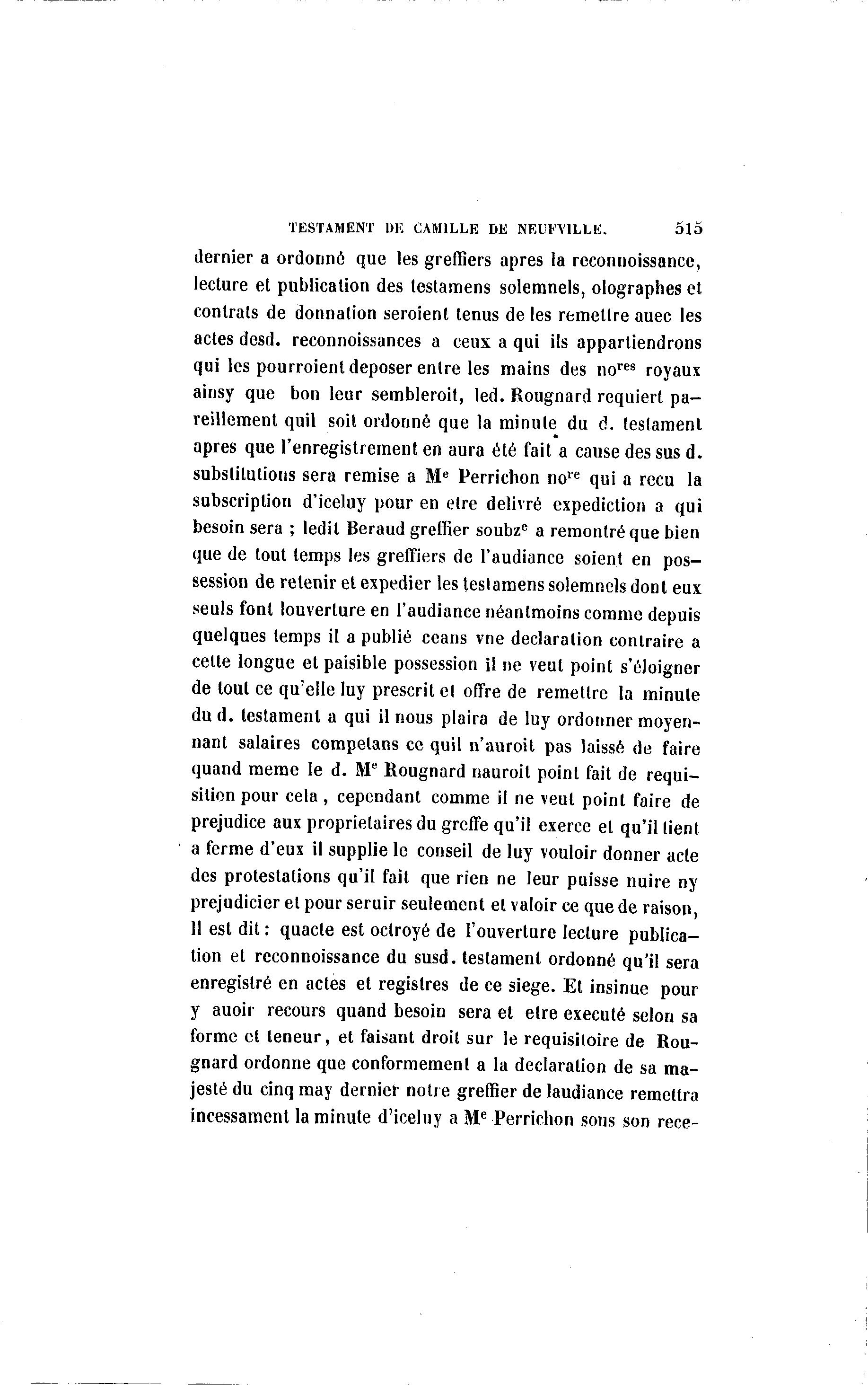 TESTAMENT DE CAMILLE DE NEUFV1LLE. 515 dernier a ordonné que les greffiers après la reconnoissance, lecture et publication des testamens solemnels, olographes et contrats de donnation seroient tenus de les remettre auec les actes desd. reconnoissances a ceux a qui ils appartiendrons qui les pourroient déposer entre les mains des nores royaux ainsy que bon leur semblerait, led. Rougnard requiert pa- reillement quil soit ordonné que la minute du d. testament après que l'enregistrement en aura été fait a cause des sus d. substitutions sera remise a Me Perrichon nore qui a reçu la subscriptiori d'iceluy pour en être délivré expediction a qui besoin sera ; ledit Beraud greffier soubze a remontré que bien que de tout temps les greffiers de l'audiance soient en pos- session de retenir et expédier les teslamens solemnels dont eux seuls font louverture en l'audiance néanlmoins comme depuis quelques temps il a publié céans vne déclaration contraire a cette longue et paisible possession il ne veut point s'éloigner de tout ce qu'elle Iuy prescrit et offre de remettre la minute du d. testament a qui il nous plaira de luy ordonner moyen- nant salaires competans ce quil n'auroit pas laissé de faire quand même le d. M° Rougnard nauroit point fait de réqui- sition pour cela , cependant comme il ne veut point faire de préjudice aux propriétaires du greffe qu'il exerce et qu'il tient a ferme d'eux il supplie le conseil de luy vouloir donner acte des protestations qu'il fait que rien ne leur puisse nuire ny prejudicier et pour seruir seulement et valoir ce que de raison, 1 est dit : quacte est octroyé de l'ouverture lecture publica- 1 tion et reconnoissance du susd. testament ordonné qu'il sera enregistré en actes et registres de ce siège. Et insinue pour y auoir recours quand besoin sera et être exécuté selon sa forme et teneur, et faisant droit sur le réquisitoire de Rou- gnard ordonne que conformément a la déclaration de sa ma- jesté du cinq may dernier notre greffier de laudiance remettra incessament la minute d'iceluy a Me Perrichon sous son rece-