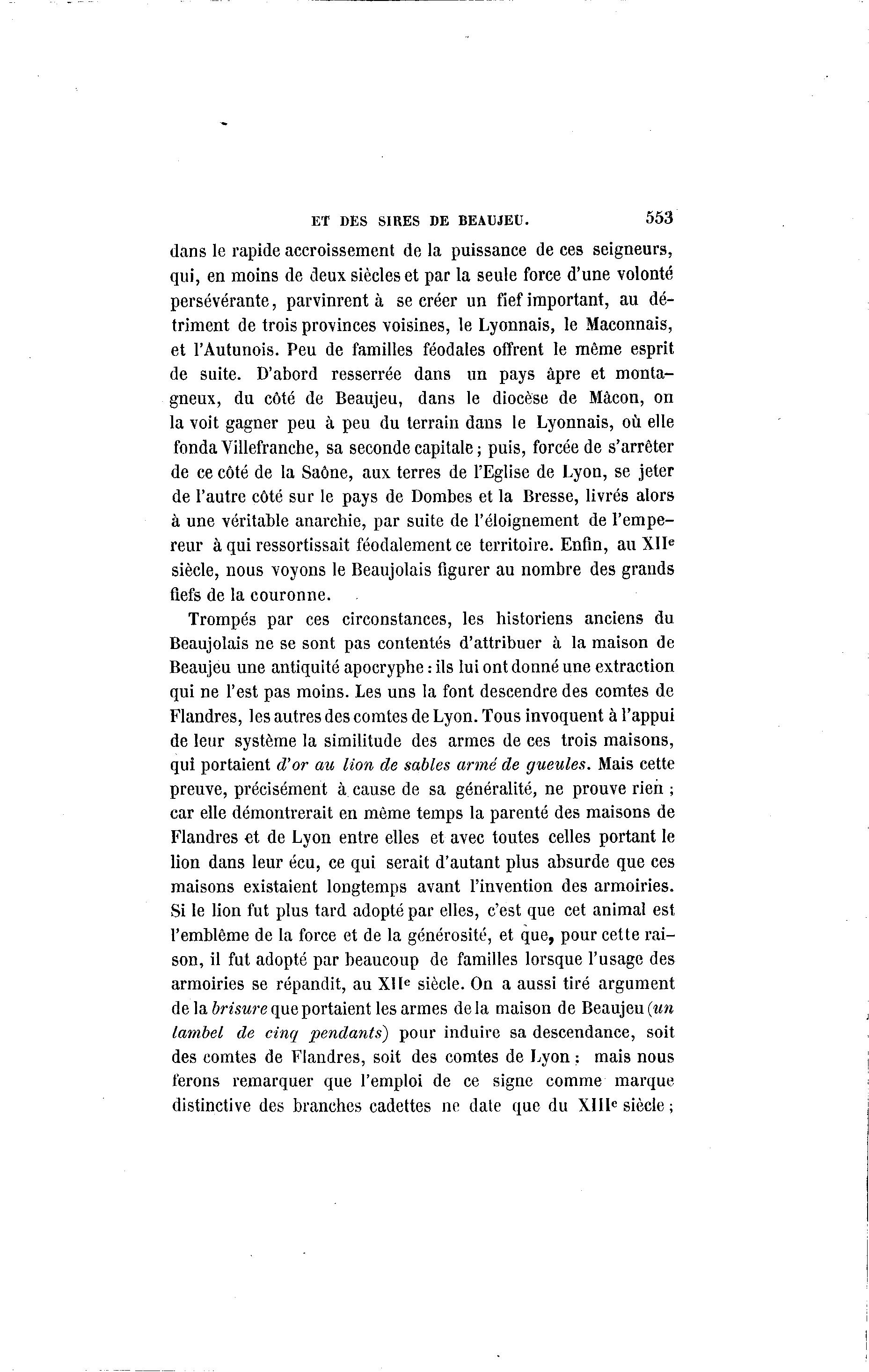 ET DES SIRES DE BEAUJEU. 553 dans le rapide accroissement de la puissance de ces seigneurs, qui, en moins de deux siècles et par la seule force d'une volonté persévérante, parvinrent à se créer un fief important, au dé- triment de trois provinces voisines, le Lyonnais, le Maçonnais, et l'Autunois. Peu de familles féodales offrent le même esprit de suite. D'abord resserrée dans un pays âpre et monta- gneux, du côté de Beaujeu, dans le diocèse de Mâcon, on la voit gagner peu à peu du terrain dans le Lyonnais, où elle fonda Villefranche, sa seconde capitale ; puis, forcée de s'arrêter de ce côté de la Saône, aux terres de l'Eglise de Lyon, se jeter de l'autre côté sur le pays de Dombes et la Bresse, livrés alors à une véritable anarchie, par suite de l'éloignement de l'empe- reur à qui ressortissait féodalement ce territoire. Enfin, au XIIe siècle, nous voyons le Beaujolais figurer au nombre des grands fiefs de la couronne. Trompés par ces circonstances, les historiens anciens du Beaujolais ne se sont pas contentés d'attribuer à la maison de Beaujeu une antiquité apocryphe : ils lui ont donné une extraction qui ne l'est pas moins. Les uns la font descendre des comtes de Flandres, les autres des comtes de Lyon. Tous invoquent à l'appui de leur système la similitude des armes de ces trois maisons, qui portaient d'or au lion de sables armé de gueules. Mais cette preuve, précisément à cause de sa généralité, ne prouve rien ; car elle démontrerait en même temps la parenté des maisons de Flandres et de Lyon entre elles et avec toutes celles portant le lion dans leur écu, ce qui serait d'autant plus absurde que ces maisons existaient longtemps avant l'invention des armoiries. Si le lion fut plus tard adopté par elles, c'est que cet animal est l'emblème de la force et de la générosité, et que, pour cette rai- son, il fut adopté par beaucoup de familles lorsque l'usage des armoiries se répandit, au XIIe siècle. On a aussi tiré argument de la brisure que portaient les armes delà maison de Beaujeu (un lambel de cinq pendants) pour induire sa descendance, soit des comtes de Flandres, soit des comtes de Lyon : mais nous ferons remarquer que l'emploi de ce signe comme marque distinctive des branches cadettes ne date que du XIIIe siècle ;