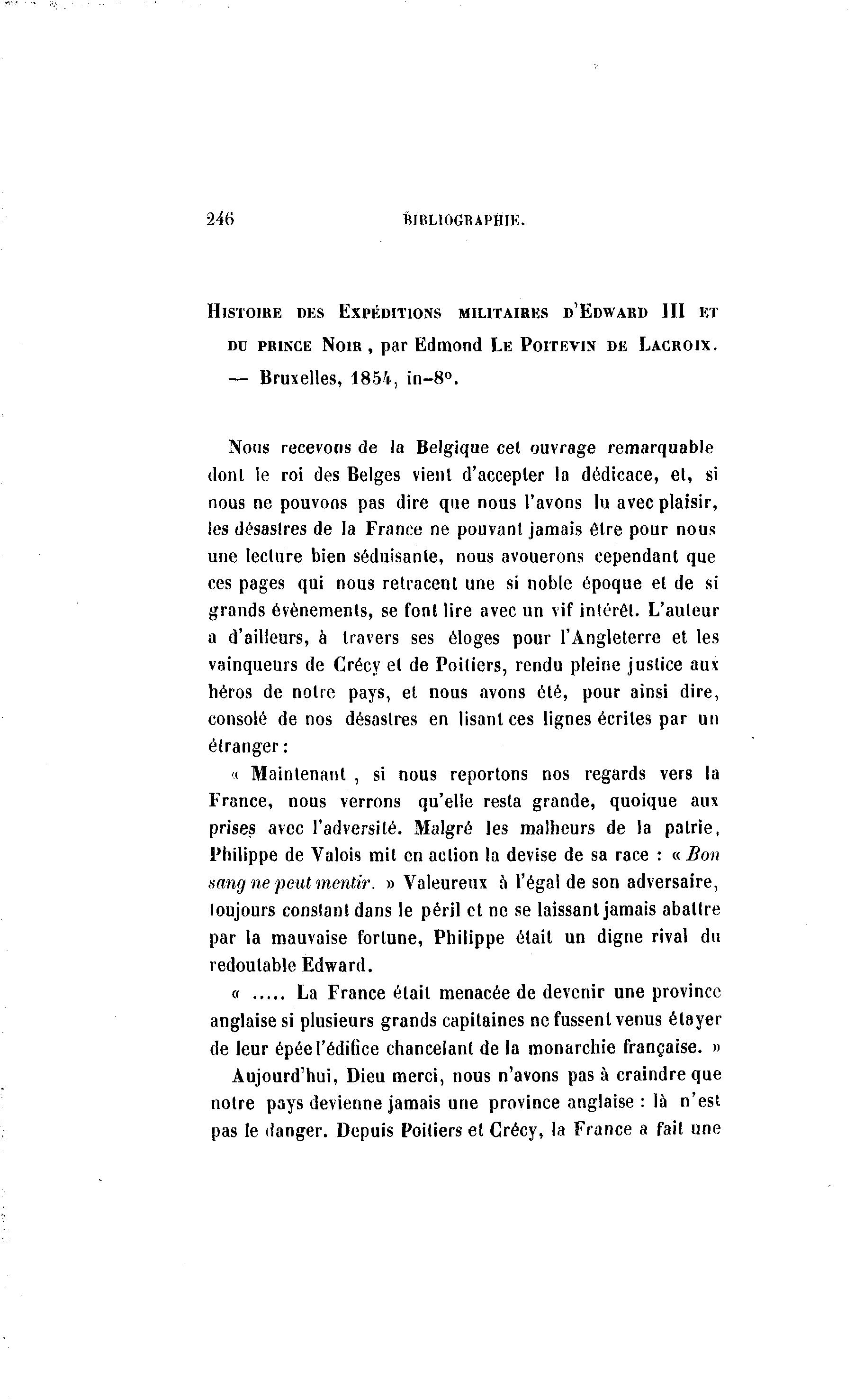 246 BIBLIOGRAPHIE. HISTOIRE DES EXPÉDITIONS MILITAIRES D'EDWARD III ET DU PRINCE NOIR , par Edmond LE POITEVIN DE LACROIX. — Bruxelles, 1854, in-8°. Nous recevons de la Belgique cet ouvrage remarquable dont le roi des Belges vient d'accepter la dédicace, et, si nous ne pouvons pas dire que nous l'avons lu avec plaisir, les désastres de la France ne pouvant jamais être pour nous une lecture bien séduisante, nous avouerons cependant que ces pages qui nous retracent une si noble époque et de si grands événements, se font lire avec un vif intérêt. L'auteur a d'ailleurs, à travers ses éloges pour l'Angleterre et les vainqueurs de Crécy et de Poitiers, rendu pleine justice aux héros de notre pays, et nous avons été, pour ainsi dire, consolé de nos désastres en lisant ces lignes écrites par un étranger: « Maintenant , si nous reportons nos regards vers la France, nous verrons qu'elle resta grande, quoique aux prises avec l'adversité. Malgré les malheurs de la patrie, Philippe de Valois mil en action la devise de sa race : « Bon sang ne peut mentir. » Valeureux h l'égal de son adversaire, toujours constant dans le péril et ne se laissant jamais abattre par la mauvaise fortune, Philippe était un digne rival du redoutable Edward. « La France était menacée de devenir une province anglaise si plusieurs grands capitaines ne fussenl venus étayer de leur épéel'édifice chancelant de la monarchie française. » Aujourd'hui, Dieu merci, nous n'avons pas à craindre que notre pays devienne jamais une province anglaise : là n'est pas le danger. Depuis Poitiers el Crécy, la France a fait une