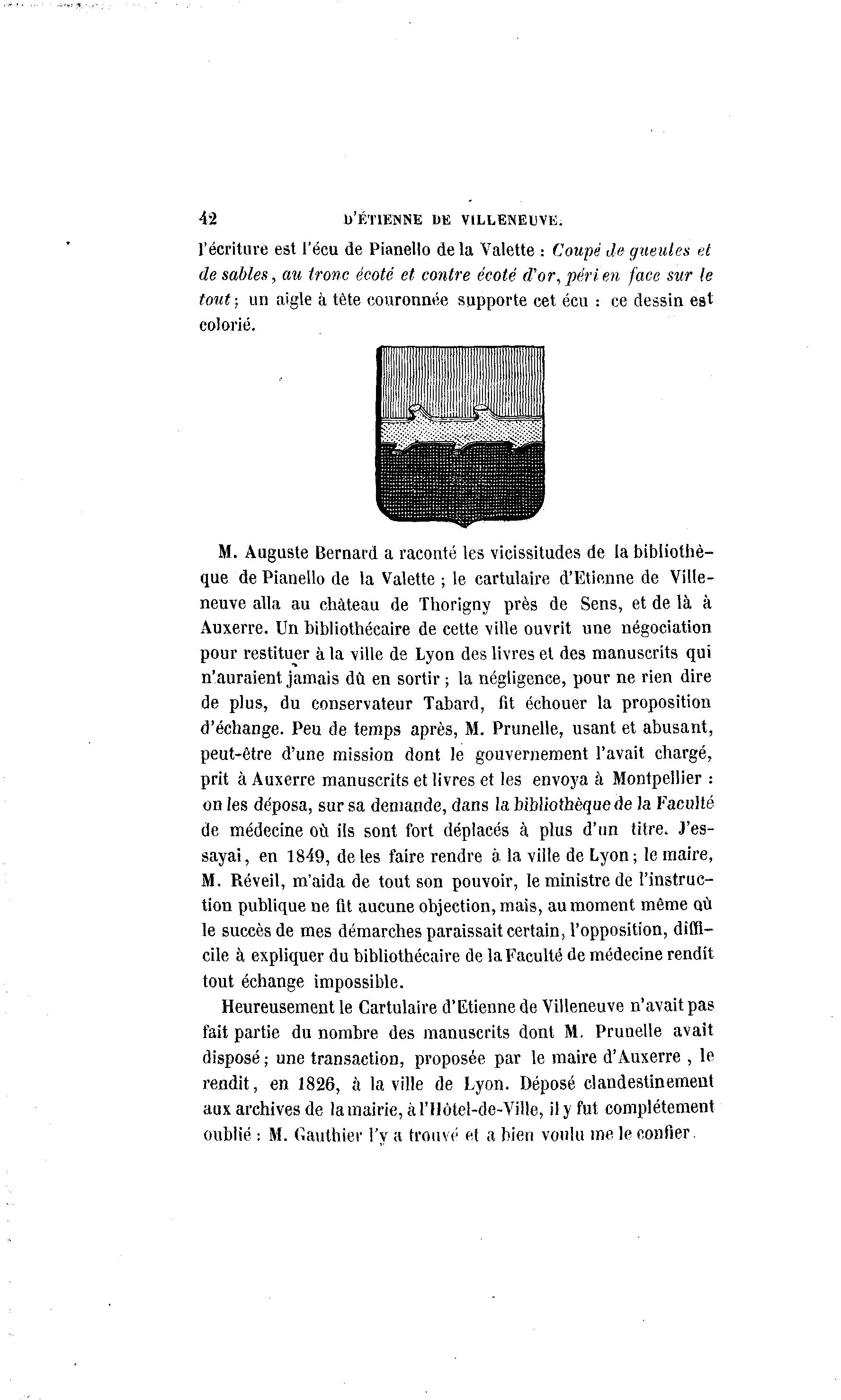 42 b'ÉTIKNNE IJE VILLENEUVE. l'écriture est l'écu de Pianello de la Valette : Coupé de gueules et de sables, au tronc écoté et contre écoté d'or, péri en face sur le tout; un aigle à tête couronnée supporte cet écu : ce dessin est colorié. M. Auguste Bernard a raconté les vicissitudes de la bibliothè- que de Pianello de la Valette ; le cartulaire d'Etienne de Ville- neuve alla au château de Thorigny près de Sens, et de là à Auxerre. Un bibliothécaire de cette ville ouvrit une négociation pour restituer à la ville de Lyon des livres et des manuscrits qui n'auraient jamais dû en sortir ; la négligence, pour ne rien dire de plus, du conservateur Tabard, fit échouer la proposition d'échange. Peu de temps après, M. Prunelle, usant et abusant, peut-être d'une mission dont le gouvernement l'avait chargé, prit à Auxerre manuscrits et livres et les envoya à Montpellier : on les déposa, sur sa demande, dans la bibliothèque de la Faculté de médecine où ils sont fort déplacés à plus d'un titre. J'es- sayai, en 1849, de les faire rendre à la ville de Lyon; le maire, M. Réveil, m'aida de tout son pouvoir, le ministre de l'instruc- tion publique ne fit aucune objection, mais, au moment même QÙ le succès de mes démarches paraissait certain, l'opposition, diffi- cile à expliquer du bibliothécaire de la Faculté de médecine rendit tout échange impossible. Heureusement le Cartulaire d'Etienne de Villeneuve n'avait pas fait partie du nombre des manuscrits dont M. Prunelle avait disposé ; une transaction, proposée par le maire d'Auxerre , le rendit, en 1826, à la ville de Lyon. Déposé clandestinement aux archives de la mairie, à l'Hôtel-de-Ville, il y fut complètement oublié •. M. Gauthier l'y a trouvé et a bien voulu me le confier.