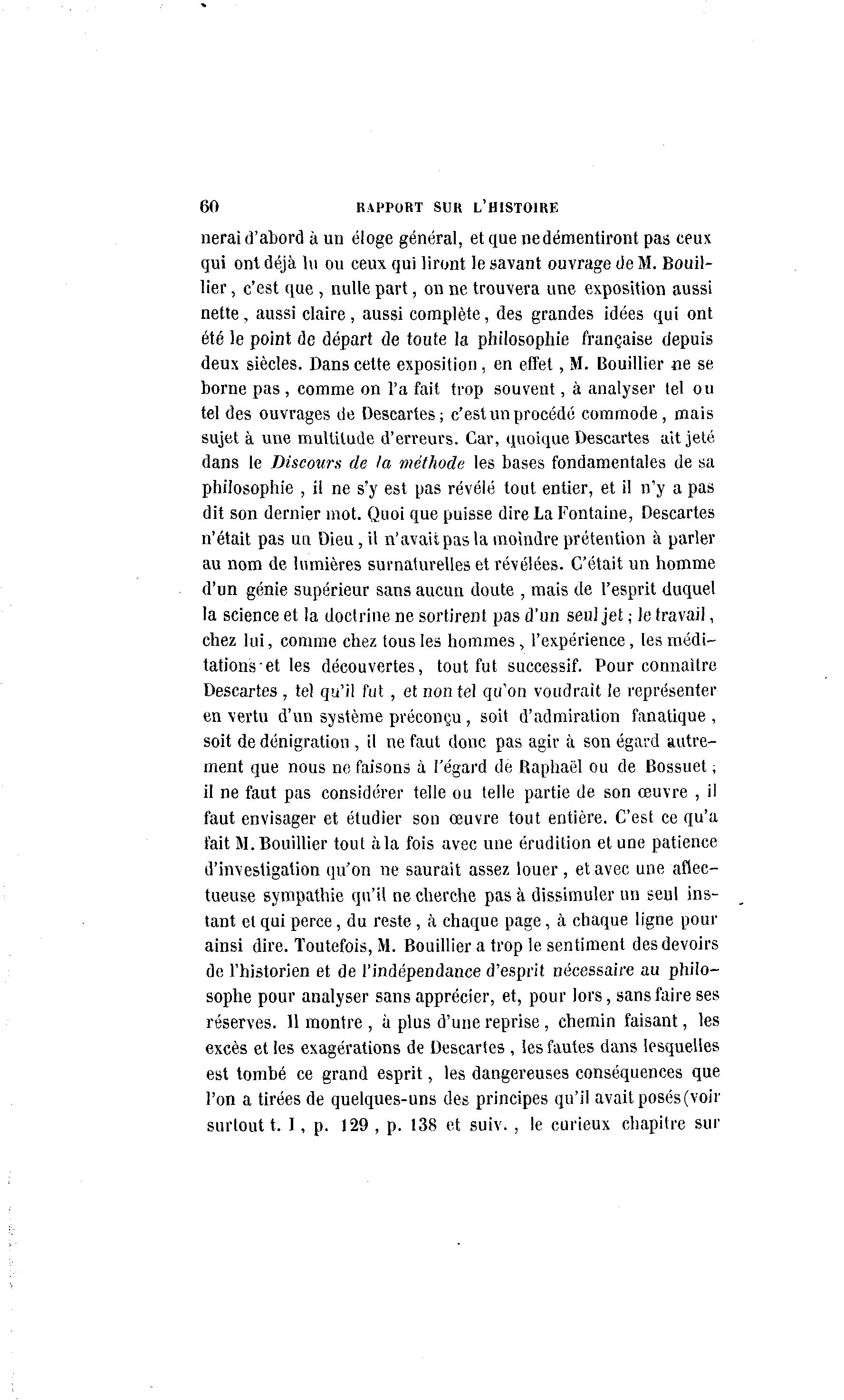 60 RAPPORT SUR L'HISTOIRE nerai d'abord à un éloge général, et que ne démentiront pas ceux qui ont déjà lu ou ceux qui liront le savant ouvrage de M. Bouil- lier, c'est que , nulle part, on ne trouvera une exposition aussi nette , aussi claire , aussi complète, des grandes idées qui ont été le point de départ de toute la philosophie française depuis deux siècles. Dans cette exposition, en effet, M. Bouillier ne se borne pas , comme on l'a fait trop souvent, à analyser tel ou tel des ouvrages de Descartes; c'est un procédé commode, mais sujet à une multitude d'erreurs. Car, quoique Descartes ait jeté dans le Discours de la méthode les bases fondamentales de sa philosophie , il ne s'y est pas révélé tout entier, et il n'y a pas dit son dernier mot. Quoi que puisse dire La Fontaine, Descartes n'était pas un Dieu, il n'avait pas la moindre prétention à parler au nom de lumières surnaturelles et révélées. C'était un homme d'un génie supérieur sans aucun doute , mais de l'esprit duquel la science et la doctrine ne sortirent pas d'un seul jet ,• le travail, chez lui, comme chez tous les hommes, l'expérience, les médi- tations et les découvertes, tout fut successif. Pour connaître Descartes, tel qu'il fut , et non tel qu'on voudrait le représenter en vertu d'un système préconçu, soit d'admiration fanatique , soit de dénigration , il ne faut donc pas agir à son égard autre- ment que nous ne faisons à l'égard de Raphaël ou de Bossuet, il ne faut pas considérer telle ou telle partie de son œuvre , il faut envisager et étudier son œuvre tout entière. C'est ce qu'a fait M. Bouillier tout à la fois avec une érudition et une patience d'investigation qu'on ne saurait assez louer, et avec une aflec- tueuse sympathie qu'il ne cherche pas à dissimuler un seul ins- tant et qui perce, du reste , à chaque page, à chaque ligne pour ainsi dire. Toutefois, M. Bouillier a trop le sentiment des devoirs de l'historien et de l'indépendance d'esprit nécessaire au philo- sophe pour analyser sans apprécier, et, pour lors, sans faire ses réserves. 11 montre , à plus d'une reprise , chemin faisant, les excès et les exagérations de Descartes , les fautes dans lesquelles est tombé ce grand esprit, les dangereuses conséquences que l'on a tirées de quelques-uns des principes qu'il avait posés (voir surtout t. I, p. 129 , p. 138 et suiv. , le curieux chapitre sur
