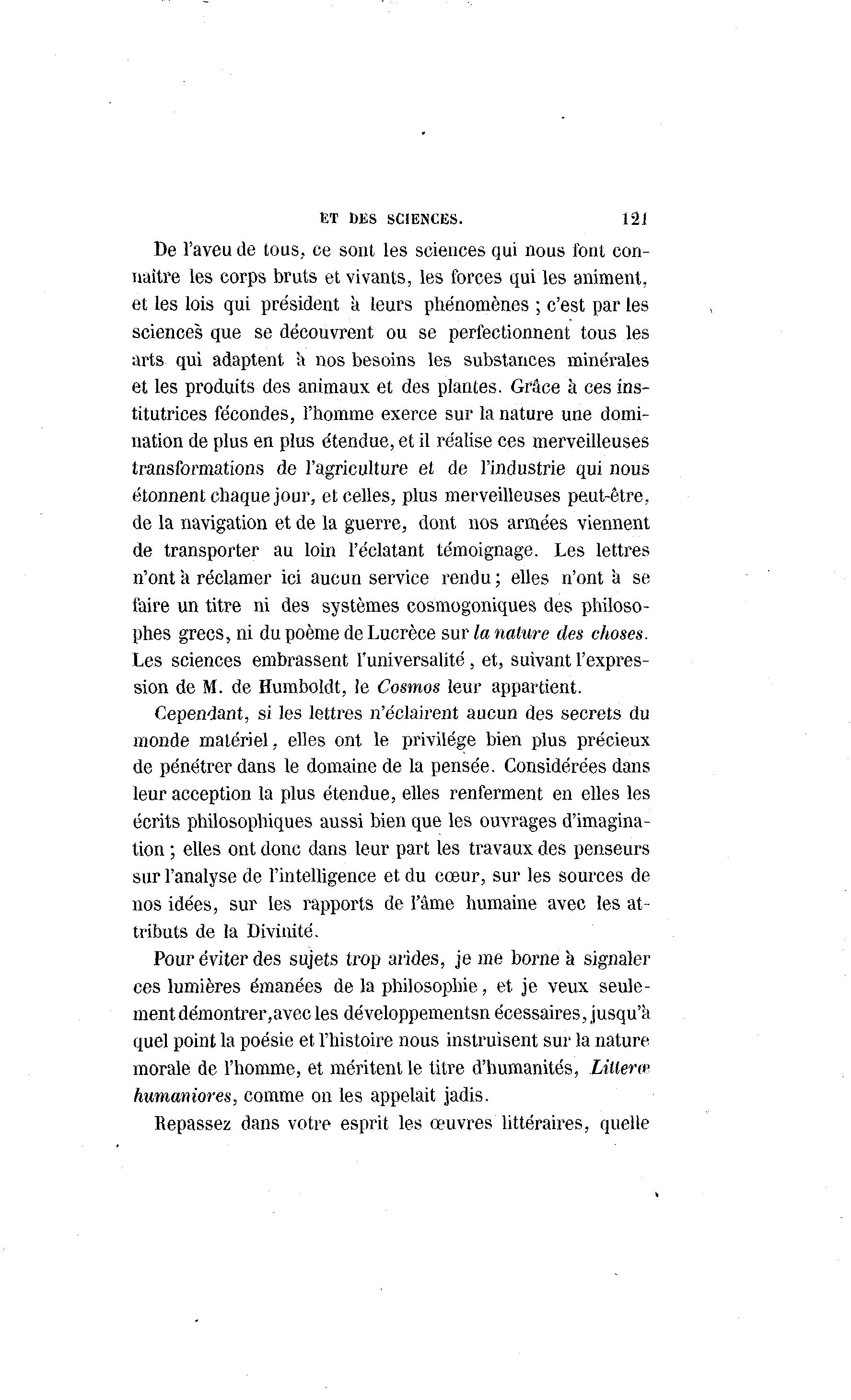 ET t)ES SCIENCES. 121 De l'aveu de tous, ce sont les sciences qui nous font con- naître les corps bruts et vivants, les forces qui les animent, et les lois qui président k leurs phénomènes ; c'est par les sciences que se découvrent ou se perfectionnent tous les arts qui adaptent k nos besoins les substances minérales et les produits des animaux et des plantes. Grâce à ces ins- titutrices fécondes, l'homme exerce sur la nature une domi- nation de plus en plus étendue, et il réalise ces merveilleuses transformations de l'agriculture et de l'industrie qui nous étonnent chaque jour, et celles, plus merveilleuses peut-être, de la navigation et de la guerre, dont nos armées viennent de transporter au loin l'éclatant témoignage. Les lettres n'ont 'a réclamer ici aucun service rendu ; elles n'ont à se faire un titre ni des systèmes cosmogoniques des philoso- phes grecs, ni du poème de Lucrèce sur la nature des choses. Les sciences embrassent l'universalité, et, suivant l'expres- sion de M. de Humboldt, le Cosmos leur appartient. Cependant, si les lettres n'éclairent aucun des secrets du monde matériel, elles ont le privilège bien plus précieux de pénétrer dans le domaine de la pensée. Considérées dans leur acception la plus étendue, elles renferment en elles les écrits philosophiques aussi bien que les ouvrages d'imagina- tion ; elles ont donc dans leur part les travaux des penseurs sur l'analyse de l'intelligence et du cœur, sur les sources de nos idées, sur les rapports de l'âme humaine avec les at- tributs de la Divinité. Pour éviter des sujets trop arides, je me borne à signaler ces lumières émanées de la philosophie, et je veux seule- ment démontrer,avec les développementsn écessaires, jusqu'à quel point la poésie et l'histoire nous instruisent sur la nature morale de l'homme, et méritent le titre d'humanités, Lillerœ humaniores, comme on les appelait jadis. Repassez dans votre esprit les œuvres littéraires, quelle
