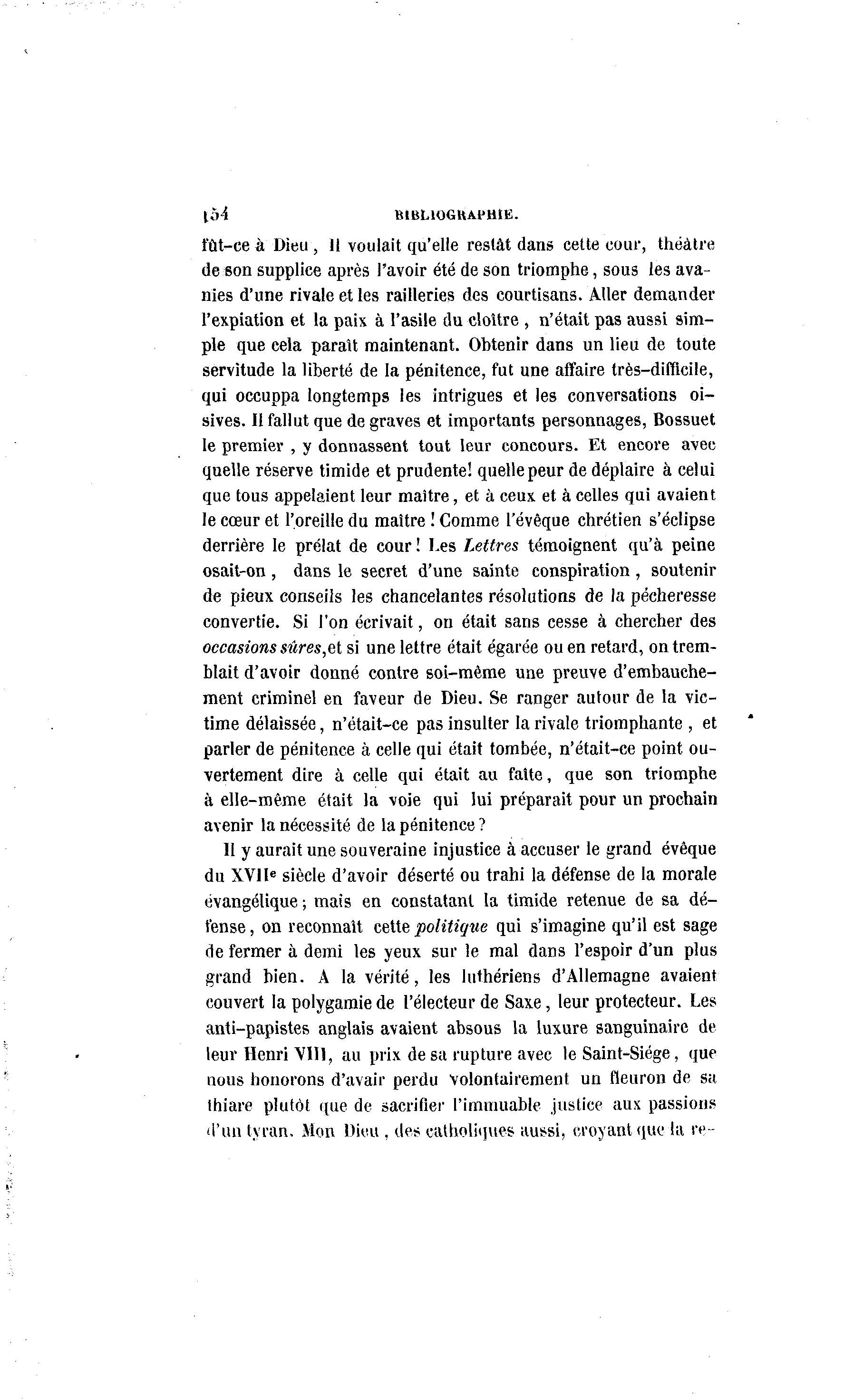 to4 BIBLIOGRAPHIE. fût-ce à Dieu , 11 voulait qu'elle restât dans cette cour, théâtre de son supplice après l'avoir été de son triomphe, sous les ava- nies d'une rivale et les railleries des courtisans. Aller demander l'expiation et la pais à l'asile du cloitre , n'était pas aussi sim- ple que cela paraît maintenant. Obtenir dans un lieu de toute servitude la liberté de la pénitence, fut une affaire très-difficile, qui occuppa longtemps les intrigues et les conversations oi- sives. Il fallut que de graves et importants personnages, Bossuet le premier , y donnassent tout leur concours. Et encore avec quelle réserve timide et prudente! quelle peur de déplaire à celui que tous appelaient leur maître, et à ceux et à celles qui avaient le cœur et l'oreille du maître ! Comme l'évêque chrétien s'éclipse derrière le prélat de cour ! Les Lettres témoignent qu'à peine osait-on , dans le secret d'une sainte conspiration , soutenir de pieux conseils les chancelantes résolutions de la pécheresse convertie. Si l'on écrivait, on était sans cesse à chercher des occasions sûres,et si une lettre était égarée ou en retard, on trem- blait d'avoir donné contre soi-même une preuve d'embauche- ment criminel en faveur de Dieu. Se ranger autour de la vic- time délaissée, n'était-ce pas insulter la rivale triomphante , et parler de pénitence à celle qui était tombée, n'était-ce point ou- vertement dire à celle qui était au faite, que son triomphe à elle-même était la voie qui lui préparait pour un prochain avenir la nécessité de la pénitence ? Il y aurait une souveraine injustice à accuser le grand évêque du XVIIe siècle d'avoir déserté ou trahi la défense de la morale évangélique ; mais en constatant la timide retenue de sa dé- fense, on reconnaît cette politiqtie qui s'imagine qu'il est sage de fermer à demi les yeux sur le mal dans l'espoir d'un plus grand bien. A la vérité, les luthériens d'Allemagne avaient couvert la polygamie de l'électeur de Saxe, leur protecteur. Les anti-papistes anglais avaient absous la luxure sanguinaire de leur Henri "V1I1, au prix de sa rupture avec le Saint-Siège, que nous honorons d'avair perdu volontairement un fleuron de sa thiare plutôt que de sacrifier l'immuable justice aux passions d'un tyran. Mon Dieu , des catholiques aussi, croyant que la re-