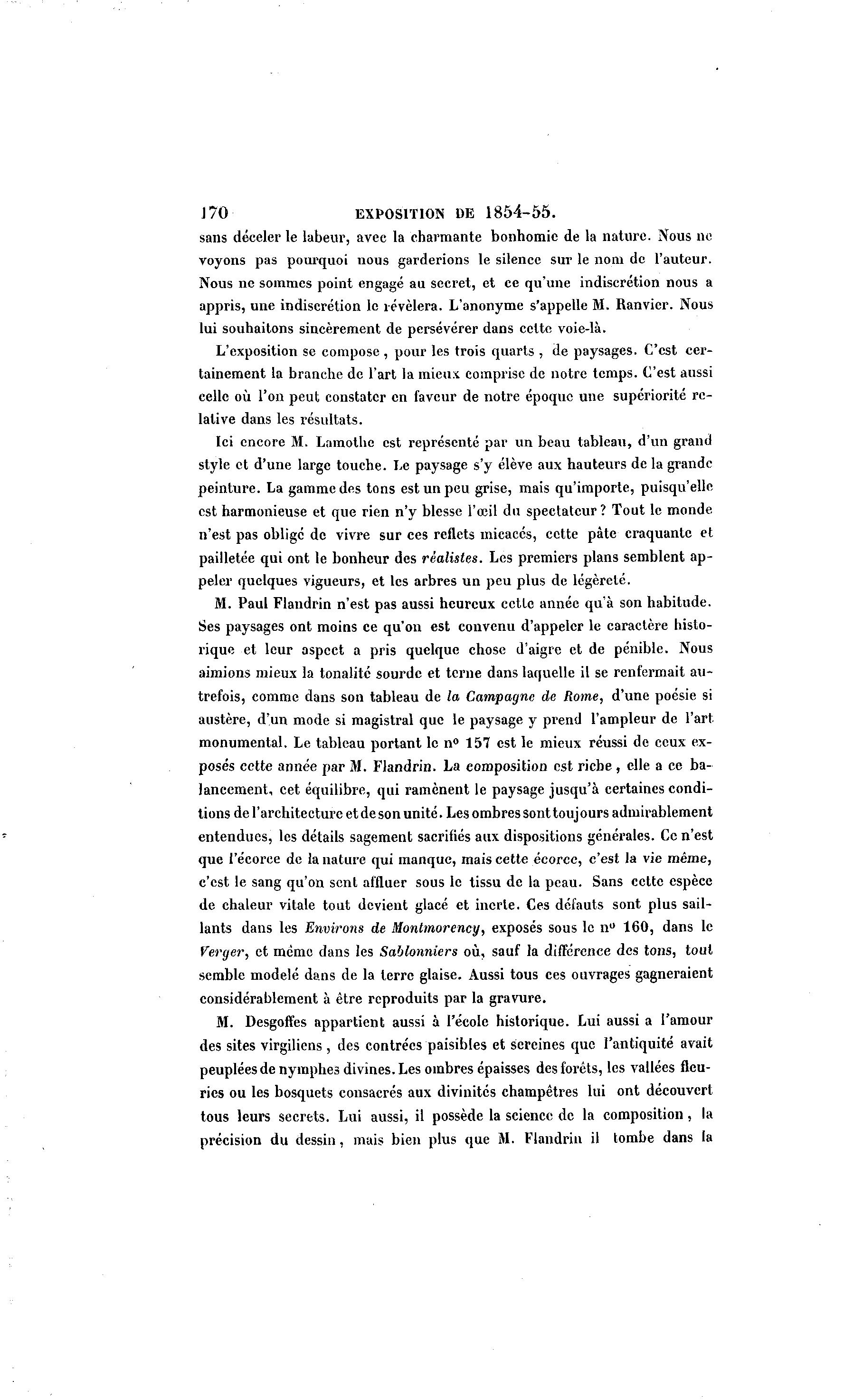 170 EXPOSITION DE 1 8 5 4 - 5 5 . sans déceler le labeur, avec la charmante bonhomie de la nature. Nous no voyons pas pourquoi nous garderions le silence sur le nom de l'auteur. Nous ne sommes point engagé au secret, et ce qu'une indiscrétion nous a appris, une indiscrétion le révélera. L'anonyme s'appelle M. Ranvicr. Nous lui souhaitons sincèrement de persévérer dans celte voie-là . L'exposition se compose , pour les trois quarts , de paysages. C'est cer- tainement la branche de l'art la mieux comprise de notre temps. C'est aussi celle où l'on peut constater en faveur de notre époque une supériorité re- lative dans les résultats. Ici encore M. Lamothe est représenté par un beau tableau, d'un grand style et d'une large touche. Le paysage s'y élève aux hauteurs de la grande peinture. La gamme des tons est un peu grise, mais qu'importe, puisqu'elle est harmonieuse et que rien n'y blesse l'œil du spectateur ? Tout le monde n'est pas oblige de vivre sur ces reflets micacés, cette pâte craquante et pailletée qui ont le bonheur des réalistes. Les premiers plans semblent ap- peler quelques vigueurs, et les arbres un peu plus de légèreté. M. Paul Flandrin n'est pas aussi heureux cette année qu'à son habitude. Ses paysages ont moins ce qu'on est convenu d'appeler le caractère histo- rique et leur aspect a pris quelque chose d'aigre et de pénible. Nous aimions mieux la tonalité sourde et terne dans laquelle il se renfermait au- trefois, comme dans son tableau de la Campagne de Rome, d'une poésie si austère, d'un mode si magistral que le paysage y prend l'ampleur de l'art monumental. Le tableau portant le n° 157 est le mieux réussi de ceux ex- posés cette année par M. Flandrin. La composition est riche, elle a ce ba- lancement, cet équilibre, qui ramènent le paysage jusqu'à certaines condi- tions de l'architecture et de son unité. Les ombres sont toujours admirablement entendues, les détails sagement sacrifiés aux dispositions générales. Ce n'est que l'écoree de la nature qui manque, mais cette écorce, c'est la vie même, c'est le sang qu'on sent affluer sous le tissu de la peau. Sans cette espèce de chaleur vitale tout devient glacé et incrie. Ces défauts sont plus sail- lants dans les Environs de Montmorency, exposés sous le n° 160, dans le Verger, et mémo dans les Sablonniers où, sauf la différence des tons, tout semble modelé dans de la terre glaise. Aussi tous ces ouvrages gagneraient considérablement à être reproduits par la gravure. M. Desgoffes appartient aussi à l'école historique. Lui aussi a l'amour des sites virgiliens, des contrées paisibles et sereines que l'antiquité avait peuplées de nymphes divines. Les ombres épaisses des forêts, les vallées fleu- ries ou les bosquets consacrés aux divinités champêtres lui ont découvert tous leurs secrets. Lui aussi, il possède la science de la composition, la précision du dessin, mais bien plus que M. Flandrin il tombe dans la
