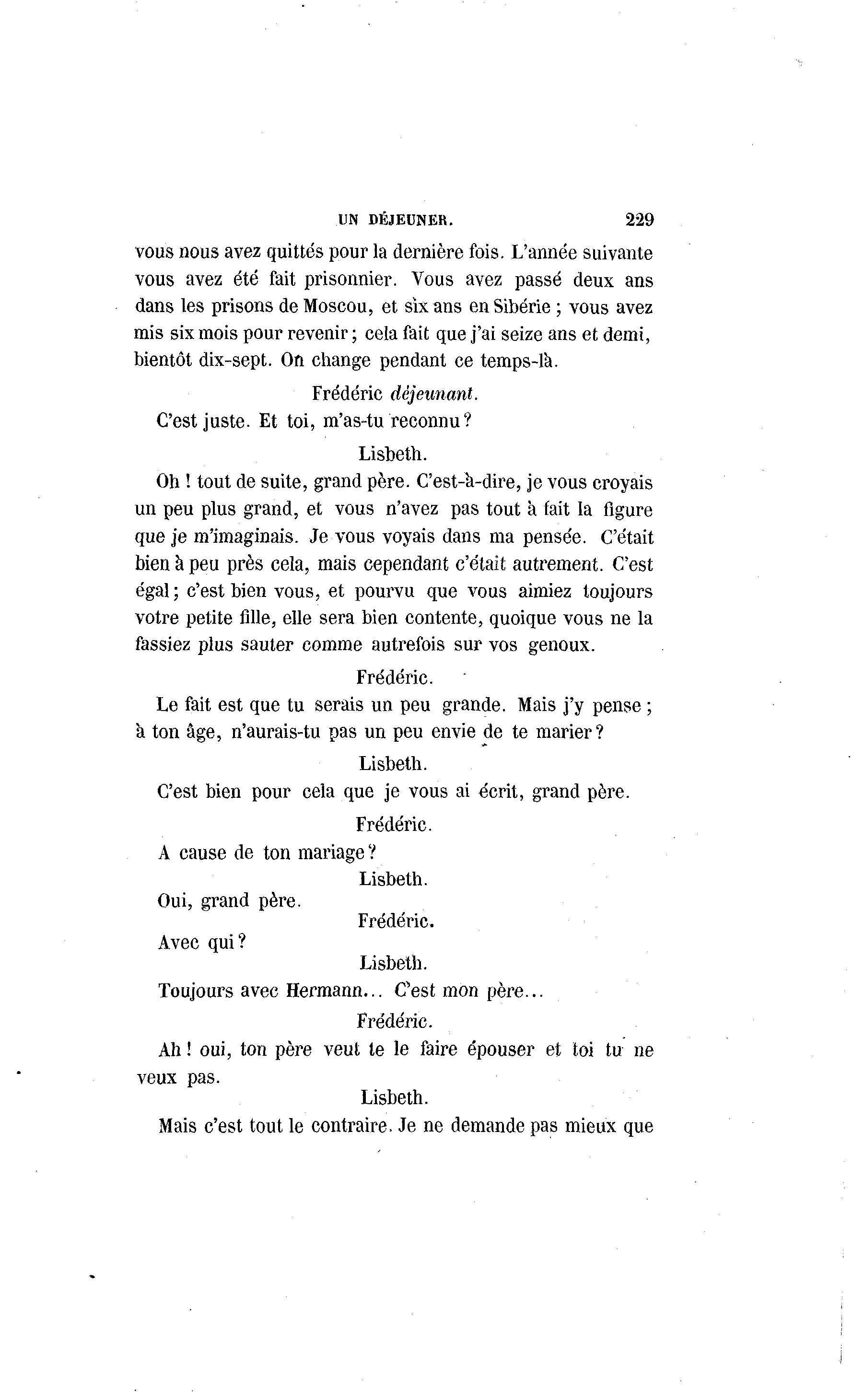 UN DÉJEUNER. 229 vous nous avez quittés pour la dernière fois. L'année suivante vous avez été fait prisonnier. Vous avez passé deux ans dans les prisons de Moscou, et six ans en Sibérie ; vous avez mis six mois pour revenir ; cela fait que j'ai seize ans et demi, bientôt dix-sept. On change pendant ce temps-la. Frédéric déjeunant. C'est juste. Et toi, m'as-tu reconnu ? Lisbeth. Oh ! tout de suite, grand père. C'est-à -dire, je vous croyais un peu plus grand, et vous n'avez pas tout à fait la figure que je m'imaginais. Je vous voyais dans ma pensée. C'était bien à peu près cela, mais cependant c'était autrement. C'est égal; c'est bien vous, et pourvu que vous aimiez toujours votre petite fille, elle sera bien contente, quoique vous ne la fassiez plus sauter comme autrefois sur vos genoux. Frédéric. Le fait est que tu serais un peu grande. Mais j'y pense ; a ton âge, n'aurais-tu pas un peu envie de te marier? Lisbeth. C'est bien pour cela que je vous ai écrit, grand père. Frédéric. A cause de ton mariage? Lisbeth. Oui, grand père. Frédéric. Avec qui? Lisbeth. Toujours avec Hermann... C'est mon père... Frédéric. Ah ! oui, ton père veut te le faire épouser et toi tu ne veux pas. Lisbeth. Mais c'est tout le contraire. Je ne demande pas mieux que