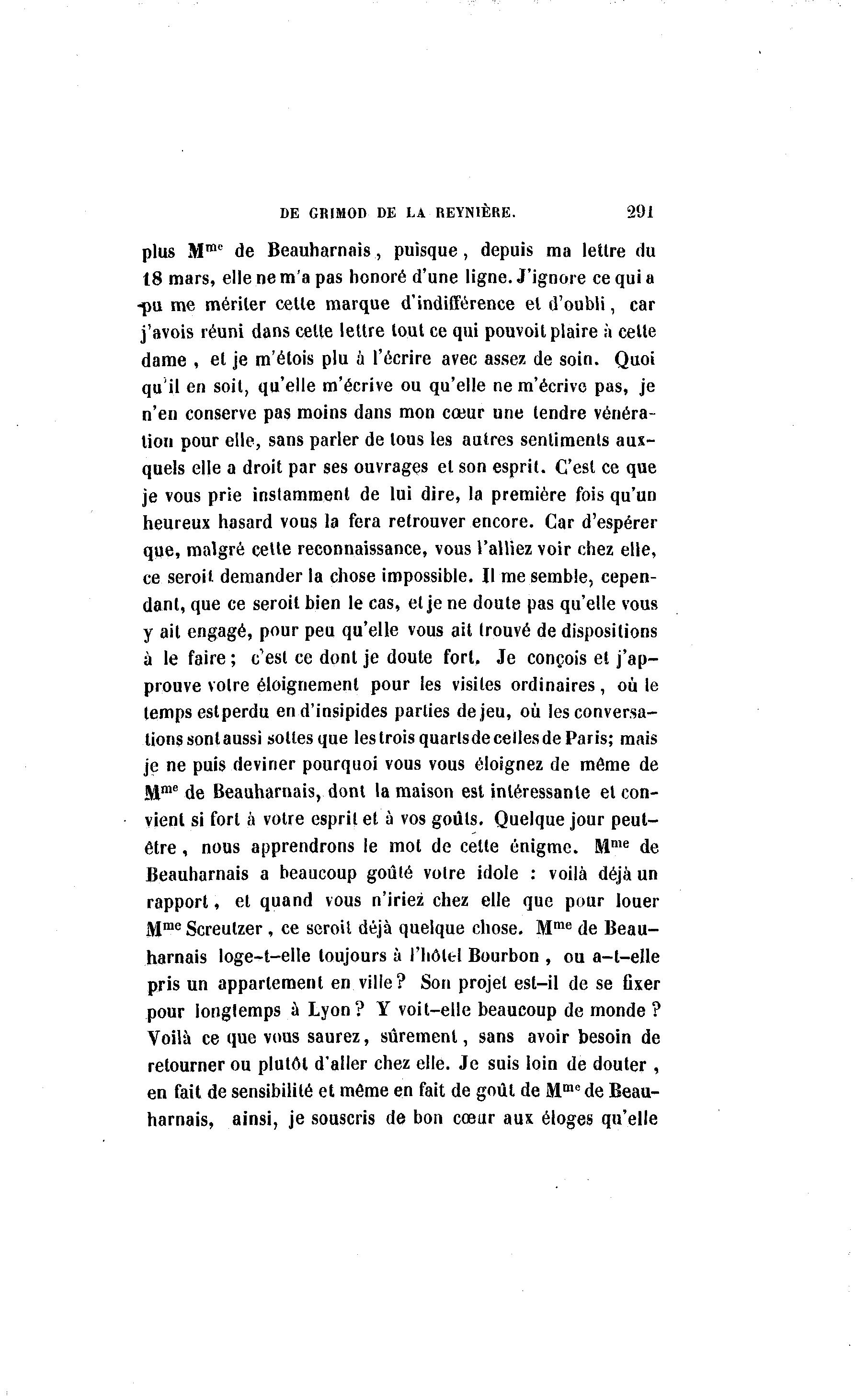 DE GRIM0D DE LA REYN1ÈRE. 291 plus Mme de Beauharnais, puisque , depuis ma lettre du 18 mars, elle ne m'a pas honoré d'une ligne. J'ignore ce qui a -pu me mériler celle marque d'indifférence el d'oubli, car j'avois réuni dans celle leltre tout ce qui pouvoit plaire à celte dame , el je m'étois plu à l'écrire avec assez de soin. Quoi qu'il en soit, qu'elle m'écrive ou qu'elle ne m'écrive pas, je n'en conserve pas moins dans mon cœur une tendre vénéra- tion pour elle, sans parler de tous les autres sentiments aux- quels elle a droit par ses ouvrages el son esprit. C'est ce que je vous prie instamment de lui dire, la première fois qu'un heureux hasard vous la fera retrouver encore. Car d'espérer que, malgré celte reconnaissance, vous l'alliez voir chez elle, ce seroil demander la chose impossible. Il me semble, cepen- dant, que ce seroit bien le cas, el je ne doute pas qu'elle vous y ait engagé, pour peu qu'elle vous ait trouvé de dispositions à le faire ; c'est ce dont je doute fort. Je conçois et j'ap- prouve votre éloignement pour les visites ordinaires, où le temps est perdu en d'insipides parties de jeu, où les conversa- tions sont aussi sottes que les trois quarlsde celles de Paris; mais je ne puis deviner pourquoi vous vous éloignez de môme de Mme de Beauharnais, dont la maison est intéressante et con- vient si fort à votre esprit et à vos goûts. Quelque jour peut- être , nous apprendrons le mot de cette énigme. Mme de Beauharnais a beaucoup goûté votre idole : voilà déjà un rapport, et quand vous n'iriez chez elle que pour louer Mme Screulzer , ce seroit déjà quelque chose. Mme de Beau- harnais loge-t-elle toujours à l'hôtel Bourbon , ou a-l-elle pris un appartement en ville? Son projet est-il de se fixer pour longtemps à Lyon? Y voit-elle beaucoup de monde ? Voilà ce que vous saurez, sûrement, sans avoir besoin de retourner ou plutôt d'aller chez elle. Je suis loin de douter , en fait de sensibilité et même en fait de goût de Mme de Beau- harnais, ainsi, je souscris de bon cœur aux éloges qu'elle