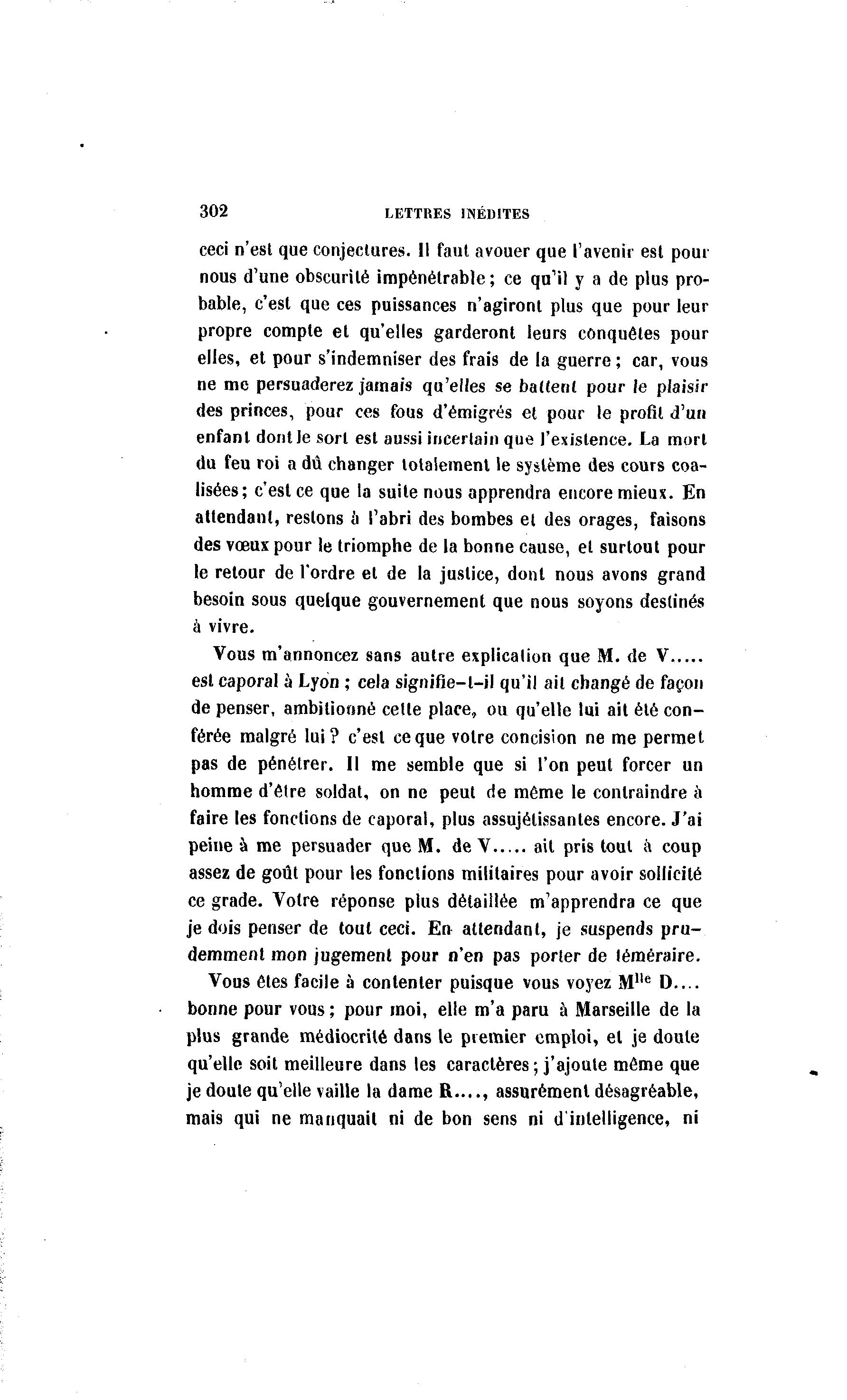 302 LETTRES INÉDITES ceci n'est que conjectures. 11 faut avouer que l'avenir est pour nous d'une obscurité impénétrable ; ce qu'il y a de plus pro- bable, c'est que ces puissances n'agiront plus que pour leur propre compte et qu'elles garderont leurs conquêtes pour elles, et pour s'indemniser des frais de la guerre ; car, vous ne me persuaderez jamais qu'elles se battent pour le plaisir des princes, pour ces fous d'émigrés et pour le profil d'un enfant dont Je sort est aussi incertain que l'existence. La mort du feu roi a dû changer totalement le système des cours coa- lisées; c'est ce que la suite nous apprendra encore mieux. En attendant, restons à l'abri des bombes et des orages, faisons des vœux pour le triomphe de la bonne cause, et surtout pour le retour de l'ordre et de la justice, dont nous avons grand besoin sous quelque gouvernement que nous soyons destinés à vivre. Vous m'annoncez sans autre explication que M. de V est caporal à Lyon ; cela signifie—l—il qu'il ait changé de façon de penser, ambitionné cette place, ou qu'elle lui ait été con- férée malgré lui? c'est ce que votre concision ne me permet pas de pénétrer. Il me semble que si l'on peut forcer un homme d'être soldat, on ne peut de même le contraindre à faire les fondions de caporal, plus assujétissantes encore. J'ai peine à me persuader que M. de V ait pris tout à coup assez de goût pour les fonctions militaires pour avoir sollicité ce grade. Votre réponse plus détaillée m'apprendra ce que je dois penser de tout ceci. Eu attendant, je suspends pru- demment mon jugement pour n'en pas porter de téméraire. Vous êtes facile à contenter puisque vous voyez MIle D.... bonne pour vous ; pour moi, elle m'a paru à Marseille de la plus grande médiocrité dans le premier emploi, et je doute qu'elle soit meilleure dans les caractères ; j'ajoute même que je doute qu'elle vaille la dame R...., assurément désagréable, mais qui ne manquait ni de bon sens ni d intelligence, ni