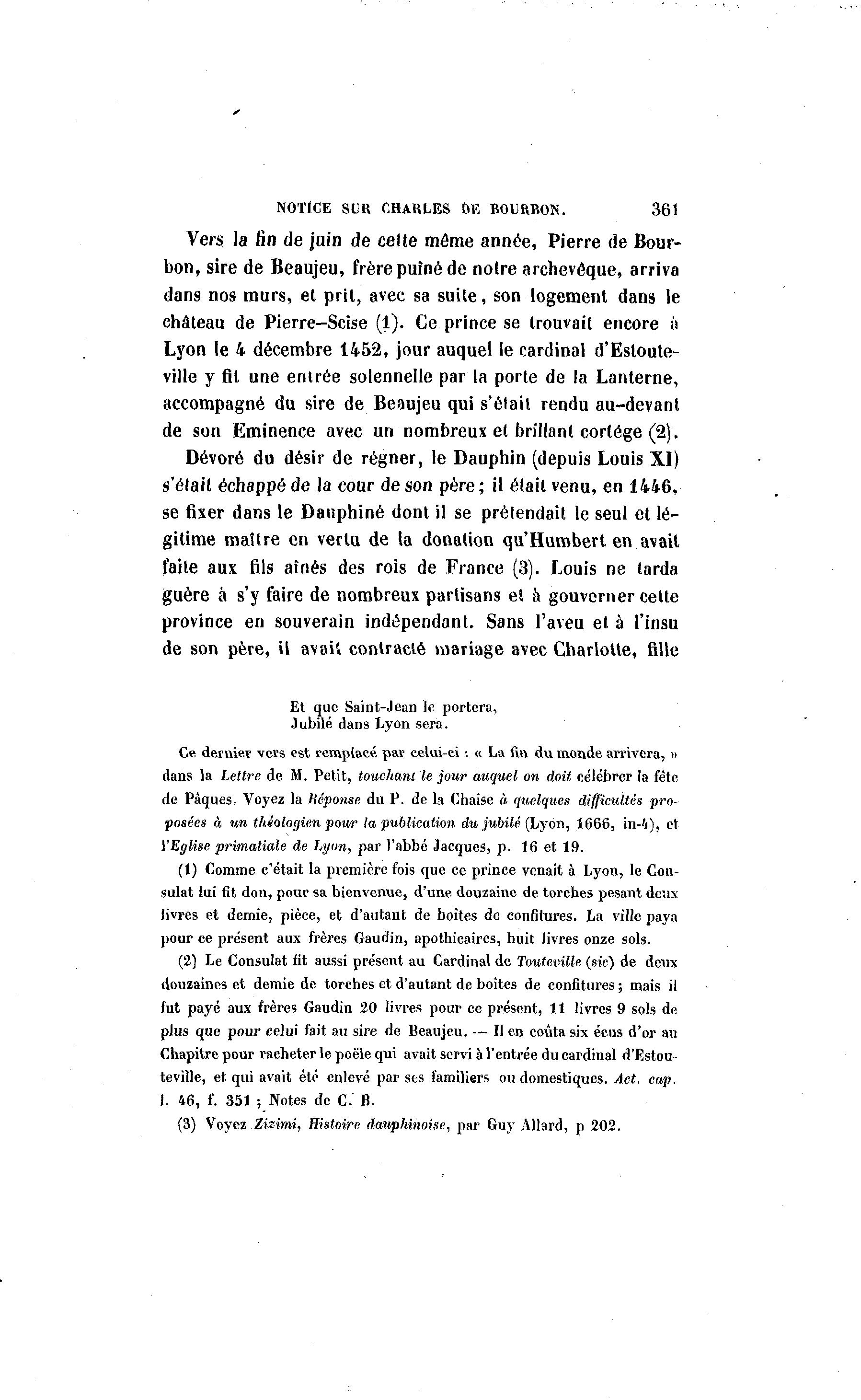 NOTICE SUR CHARLES DE BOURBON. 361 Vers la fin de juin de celte même année, Pierre de Bour- bon, sire de Beaujeu, frère puîné de notre archevêque, arriva dans nos murs, et prit, avec sa suite, son logement dans le château de Pierre-Scise (1). Ce prince se trouvait encore h Lyon le 4 décembre 1452, jour auquel le cardinal d'Estoute- ville y fil une entrée solennelle par la porte de la Lanterne, accompagné du sire de Beaujeu qui s'élail rendu au-devant de son Eminence avec un nombreux et brillant cortège (2). Dévoré du désir de régner, le Dauphin (depuis Louis XI) s'était échappé de la cour de son père; il était venu, en 1446, se fixer dans le Dauphiné dont il se prétendait le seul et lé- gitime maîlre en vertu de la donation qu'Humbert en avait faite aux fils aînés des rois de France (3). Louis ne tarda guère à s'y faire de nombreux partisans et à gouverner cette province en souverain indépendant. Sans l'aveu et à l'insu de son père, il avait contracté mariage avec Charlotte, fille Et que Saint-Jean le portera, Jubilé dans Lyon sera. Ce dernier vers est remplacé par celui-ci : « La fin du monde arrivera, » dans la Lettre de M. Petit, touchant le jour auquel on doit célébrer la fête de Pâques, Voyez la Uéponsc du P. de la Chaise à quelques difficultés pro- posées à un théologien pour la publication du jubilé (Lyon, 1666, in-4), et YEglise primatiale de Lyon, par l'abbé Jacques, p. 16 et 19. (1) Comme c'était la première fois que ce prince venait à Lyon, le Con- sulat lui fit don, pour sa bienvenue, d'une douzaine de torches pesant deux livres et demie, pièce, et d'autant de boîtes do confitures. La ville paya pour ce présent aux frères Gaudin, apothicaires, huit livres onze sols. (2) Le Consulat fit aussi présent au Cardinal de Touteville (sic) de deux douzaines et demie de torches et d'autant de boîtes de confitures ; mais il fut payé aux frères Gaudin 20 livres pour ce présent, 11 livres 9 sols de plus que pour celui fait au sire de Beaujeu. — Il en coûta six écus d'or au Chapitre pour racheter le poêle qui avait servi à l'entrée du cardinal d'Estou- teville, et qui avait été enlevé par ses familiers ou domestiques. Act. cap. 1. 46, f. 351 ; Notes de C. B. (3) Voyez Zizimi, Histoire dauphinoise, par Guy Allard, p 202.