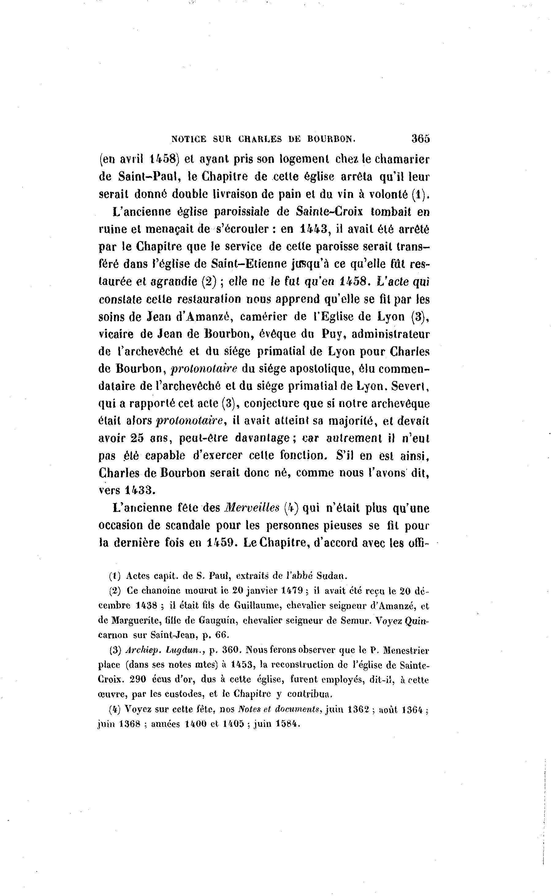 NOTICE SUR CHARLES DE BOURBON. 365 (en avril 1458) et ayant pris son logement chez le chamarier de Saint-Paul, le Chapitre de celle église arrêta qu'il leur serait donné double livraison de pain et du vin à volonté (1). L'ancienne église paroissiale de Sainte-Croix tombait en ruine et menaçait de s'écrouler : en 1443, il avait été arrêté par le Chapitre que le service de cette paroisse serait trans- féré dans l'église de Saint-Etienne jusqu'à ce qu'elle fût res- taurée et agrandie (2) ; elle ne le fut qu'en 1458. L'acte qui constate celte restauration nous apprend qu'elle se fit par les soins de Jean d'Amanzè, camérier de l'Eglise de Lyon (3), vicaire de Jean de Bourbon, évêque du Puy, administrateur de l'archevêché et du siège primalial de Lyon pour Charles de Bourbon, protonotaire du siège apostolique, élu commen- dataire de l'archevêché et du siège primatial de Lyon. Severt, qui a rapporté cet acte (3), conjecture que si notre archevêque était alors protonotaire, il avait atteint sa majorité, et devait avoir 25 ans, peut-être davantage; car autrement il n'eut pas été capable d'exercer celle fonction. S'il en est ainsi, Charles de Bourbon serait donc né, comme nous l'avons dit, vers 1433. L'ancienne fête des Merveilles (4) qui n'élait plus qu'une occasion de scandale pour les personnes pieuses se fil pour la dernière fois en 1459. Le Chapitre, d'accord avec les offi- (1) Actes capit. de S. Paul, extraits de l'abbé Sudan. (2) Ce chanoine mourut io 20 janvier 1479 ; il avait été reçu le 20 dé- cembre 1438 ; il était fils de Guillaume, chevalier seigneur d'Amanzè, et de Marguerite, fille de Gauguin, chevalier seigneur de Semur. Voyez Quin- camon sur Saint-Jean, p. 66. (3) Archiep. Lugdun., p. 360. Nous ferons observer que le P. Menestrier place (dans ses notes mtes) à 1453, la reconstruction de l'église de Sainte- Croix. 290 ccus d'or, dus à cette église, furent employés, dit-il, à cette œuvre, par les custodes, et le Chapitre y contribua. (4) Voyez sur cette fête, nos Notes et documents, juin 1362 ; août 1364 ; juin 1368 ; années 1400 et 1405 ; juin 1584.