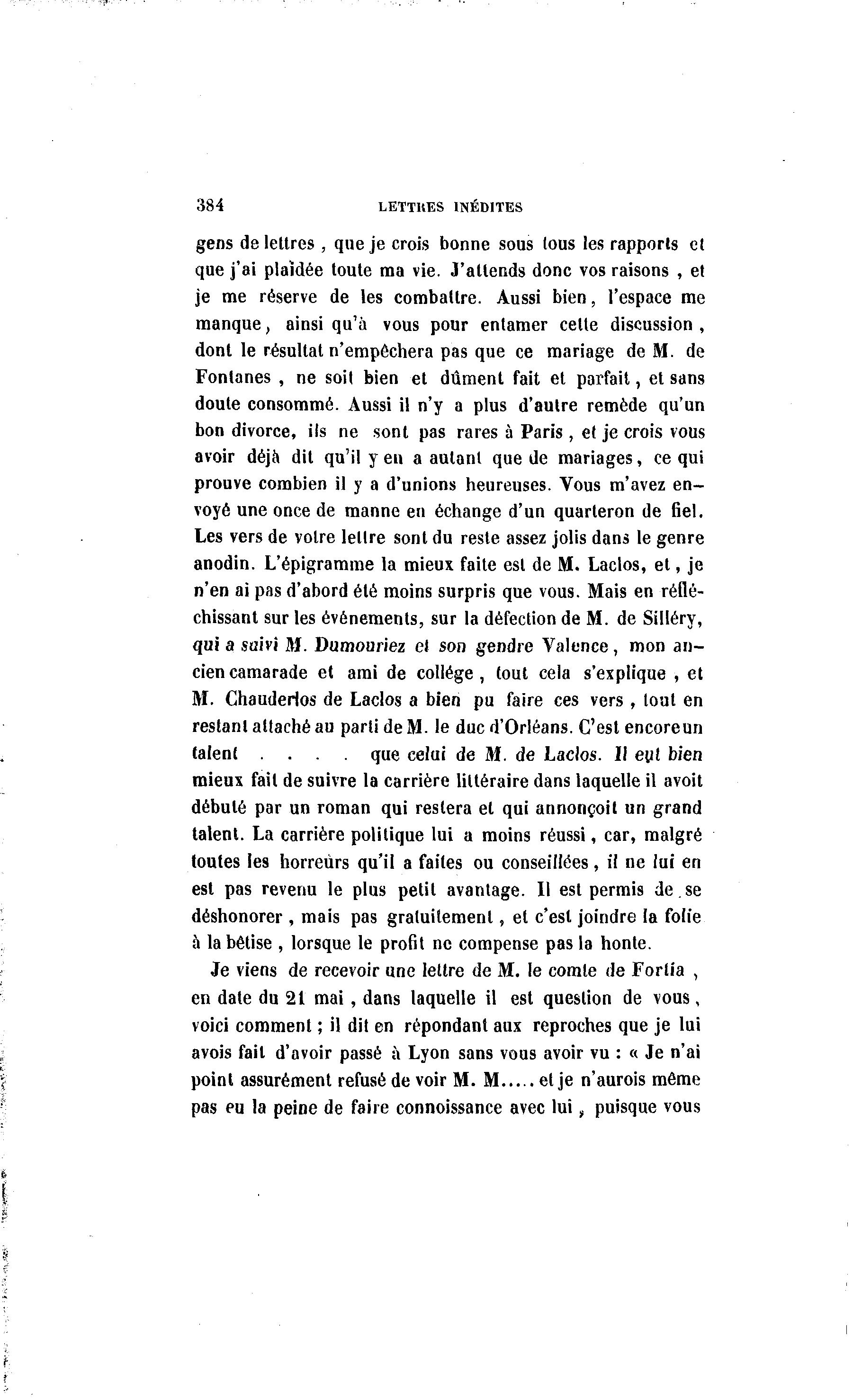 384 LETTRES INÉDITES gens de lettres , que je crois bonne sous tous les rapports et que j'ai plaïdée toute ma vie. J'attends donc vos raisons , et je me réserve de les combattre. Aussi bien, l'espace me manque, ainsi qu'à vous pour entamer celte discussion , dont le résultat n'empêchera pas que ce mariage de M. de Fonlanes , ne soit bien et dûment fait et parfait, et sans doute consommé. Aussi il n'y a plus d'autre remède qu'un bon divorce, ils ne sont pas rares à Paris , et je crois vous avoir déjà dit qu'il y en a autant que de mariages, ce qui prouve combien il y a d'unions heureuses. Vous m'avez en- voyé une once de manne en échange d'un quarteron de fiel. Les vers de votre lettre sont du reste assez jolis dans le genre anodin. L'épigramme la mieux faite est de M. Laclos, et, je n'en ai pas d'abord été moins surpris que vous. Mais en réflé- chissant sur les événements, sur la défection de M. de Silléry, qui a suivi M. Dumouriez et son gendre Valence, mon an- cien camarade et ami de collège, tout cela s'explique , et M. Chauderlos de Laclos a bien pu faire ces vers , tout en restant attaché au parti de M. le duc d'Orléans. C'est encoreun talent . . . . que celui de M. de Laclos. Il evl bien mieux fait de suivre la carrière littéraire dans laquelle il avoit débuté par un roman qui restera et qui annonçoit un grand talent. La carrière politique lui a moins réussi, car, malgré toutes les horreurs qu'il a faites ou conseillées, il ne lui en est pas revenu le plus petit avantage. Il est permis de.se déshonorer , mais pas gratuitement, et c'est joindre la folie à la bêtise , lorsque le profit ne compense pas la honte. Je viens de recevoir une lettre de M. le comte de Forlia , en date du 21 mai, dans laquelle il est question de vous, voici comment ; il dit en répondant aux reproches que je lui avois fait d'avoir passé à Lyon sans vous avoir vu : « Je n'ai point assurément refusé de voir M. M et je n'aurois même pas eu la peine de faire connoissance avec lui, puisque vous
