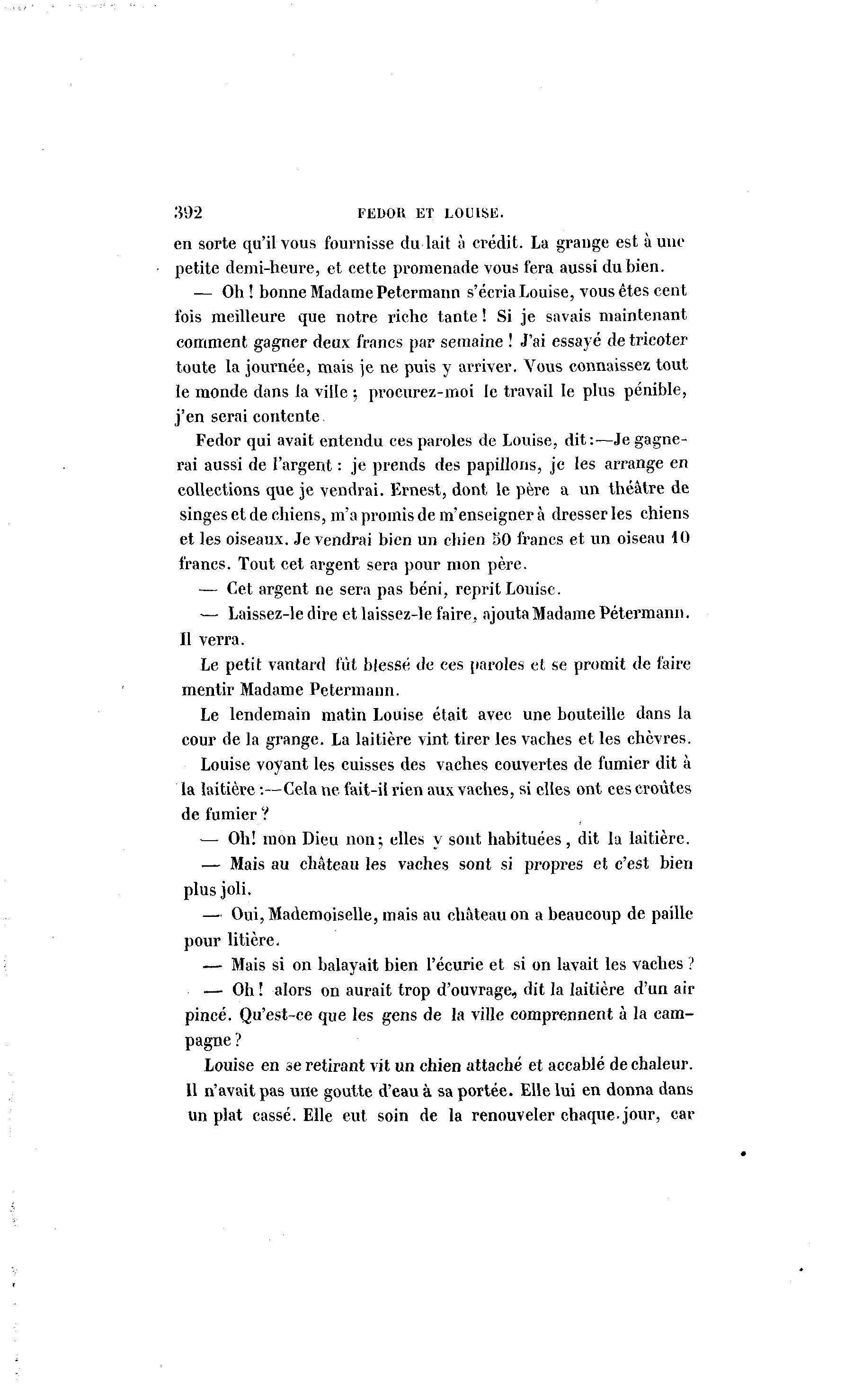 .'?t>2 FEDOK ET LOUISE. en sorte qu'il vous fournisse du lait à crédit. La grange est aune petite demi-heure, et cette promenade vous fera aussi du bien. — Oh ! bonne Madame Petermann s'écria Louise, vous êtes cent ibis meilleure que notre riche tante ! Si je savais maintenant comment gagner deux francs par semaine ! J'ai essayé de tricoter toute la journée, mais je ne puis y arriver. Vous connaissez tout le monde dans la ville ; procurez-moi le travail le plus pénible, j'en serai contente Fedor qui avait entendu ces paroles de Louise, dit:—Je gagne- rai aussi de l'argent : je prends des papillons, je les arrange en collections que je vendrai. Ernest, dont le père a un théâtre de singes et de chiens, m'a promis de m'enseigner à dresser les chiens et les oiseaux. Je vendrai bien un chien 50 francs et un oiseau 10 francs. Tout cet argent sera pour mon père. — Cet argent ne sera pas béni, reprit Louise. — Laissez-le dire et laissez-le faire, ajouta Madame Petermann. Il verra. Le petit vantard fût blessé de ces paroles et se promit de faire mentir Madame Petermann. Le lendemain matin Louise était avec une bouteille dans la cour de la grange. La laitière vint tirer les vaches et les chèvres. Louise voyant les cuisses des vaches couvertes de fumier dit à la laitière :—Cela ne fait-il rien aux vaches, si elles ont ces croûtes de fumier ? — Oh! mon Dieu non; elles y sont habituées, dit la laitière. — Mais au château les vaches sont si propres et c'est bien plus joli. — Oui, Mademoiselle, mais au château on a beaucoup de paille pour litière. — Mais si on balayait bien l'écurie et si on lavait les vaches ? — Oh ! alors on aurait trop d'ouvrage, dit la laitière d'un air pincé. Qu'est-ce que les gens de la ville comprennent à la cam- pagne ? Louise en se retirant vit un chien attaché et accablé de chaleur. Il n'avait pas une goutte d'eau à sa portée. Elle lui en donna dans un plat cassé. Elle eut soin de la renouveler chaque, jour, car