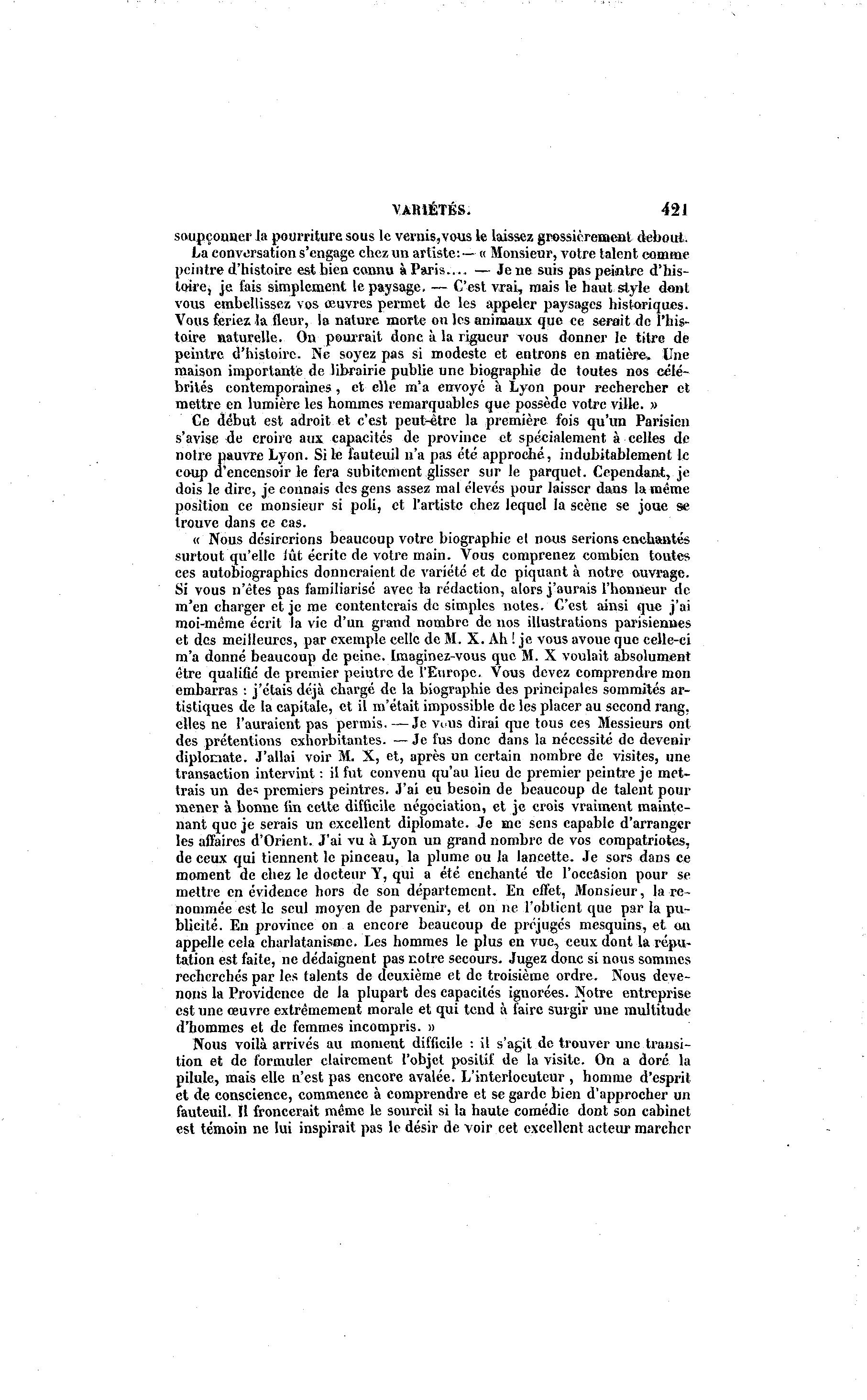 VARIETES. 421 soupçonner Ja pourriture sous le vernis,vous le laissez grossièrement debout. La conversation s'engage chez un artiste: — « Monsieur, votre talent comme peintre d'histoire est bien connu à Paris.... — Je ne suis pas peintre d'his- toire, je fais simplement le paysage, — C'est vrai, mais le haut style dont vous embellissez vos œuvres permet de les appeler paysages historiques. Vous feriez la fleur, la nature morte on les animaux que ce serait de l'his- toire naturelle. On pourrait donc à la rigueur vous donner le titre de peintre d'histoire. Ne soyez pas si modeste et entrons en matière» Une maison importante de librairie publie une biographie de toutes nos célé- brités contemporaines, et elle m'a envoyé à Lyon pour rechercher et mettre en lumière les hommes remarquables que possède votre ville. » Ce début est adroit et c'est peut-être la première fois qu'un Parisien s'avise de croire aux capacités de province et spécialement à celles de notre pauvre Lyon. Si le fauteuil n'a pas été approché, indubitablement le coup d'encensoir le fera subitement glisser sur le parquet. Cependant, je dois le dire, je connais des gens assez mal élevés pour laisser dans la même position ce monsieur si poli, et l'artiste chez lequel la scène se joue se trouve dans ce cas. « Nous désirerions beaucoup votre biographie el nous serions enchantés surtout qu'elle lût écrite de votre main. Vous comprenez combien tonte* ces autobiographies donneraient de variété et de piquant à notre ouvrage. Si vous n'êtes pas familiarisé avec la rédaction, alors j'aurais l'honneur de m'en charger et je me contenterais de simples notes. C'est ainsi que j'ai moi-même écrit la vie d'un grand nombre de nos illustrations parisiennes et des meilleures, par exemple celle de M. X. Ah ! je vous avoue que celle-ci m'a donné beaucoup de peine. Imaginez-vous que M. X voulait absolument être qualifié de premier peintre de l'Europe. Vous devez comprendre mon embarras : j'étais déjà chargé de la biographie des principales sommités ar- tistiques de la capitale, et il m'était impossible de les placer au second rang, elles ne l'auraient pas permis. — J e Vuus dirai que tous ces Messieurs ont des prétentions exhorbitantes. — Je fus donc dans la nécessité de devenir diploniate. J'allai voir M. X, et, après un certain nombre de visites, une transaction intervint : il fut convenu qu'au lieu de premier peintre je met- trais un de* premiers peintres. J'ai eu besoin de beaucoup de talent pour mener à bonne iin cette difficile négociation, et je crois vraiment mainte- nant que je serais un excellent diplomate. Je me sens capable d'arranger les affaires d'Orient. J'ai vu à Lyon un grand nombre de vos compatriotes, de ceux qui tiennent le pinceau, la plume ou la lancette. Je sors dans ce moment de chez le docteur Y, qui a été enchanté de l'occasion pour se mettre en évidence hors de son département. En effet, Monsieur, la re- nommée est le seul moyen de parvenir, el on ne l'obtient que par la pu- blicité. En province on a encore beaucoup de préjugés mesquins, et on appelle cela charlatanisme. Les hommes le plus en vue, ceux dont la répu- tation est faite, ne dédaignent pas cotre secours. Jugez donc si nous sommes recherchés par les talents de deuxième et do troisième ordre. Nous deve- nons la Providence de la plupart des capacités ignorées. Notre entreprise est une œuvre extrêmement morale et qui tend à faire surgir une multitude d'hommes et de femmes incompris. » Nous voilà arrivés au moment difficile : il s'agit de trouver une transi- tion et de formuler clairement l'objet positif de la visite. On a doré la pilule, mais elle n'est pas encore avalée. L'interlocuteur , homme d'esprit et de conscience, commence à comprendre et se garde bien d'approcher un fauteuil. Il froncerait même le sourcil si la haute comédie dont son cabinet est témoin ne lui inspirait pas le désir de voir cet excellent acteur marcher
