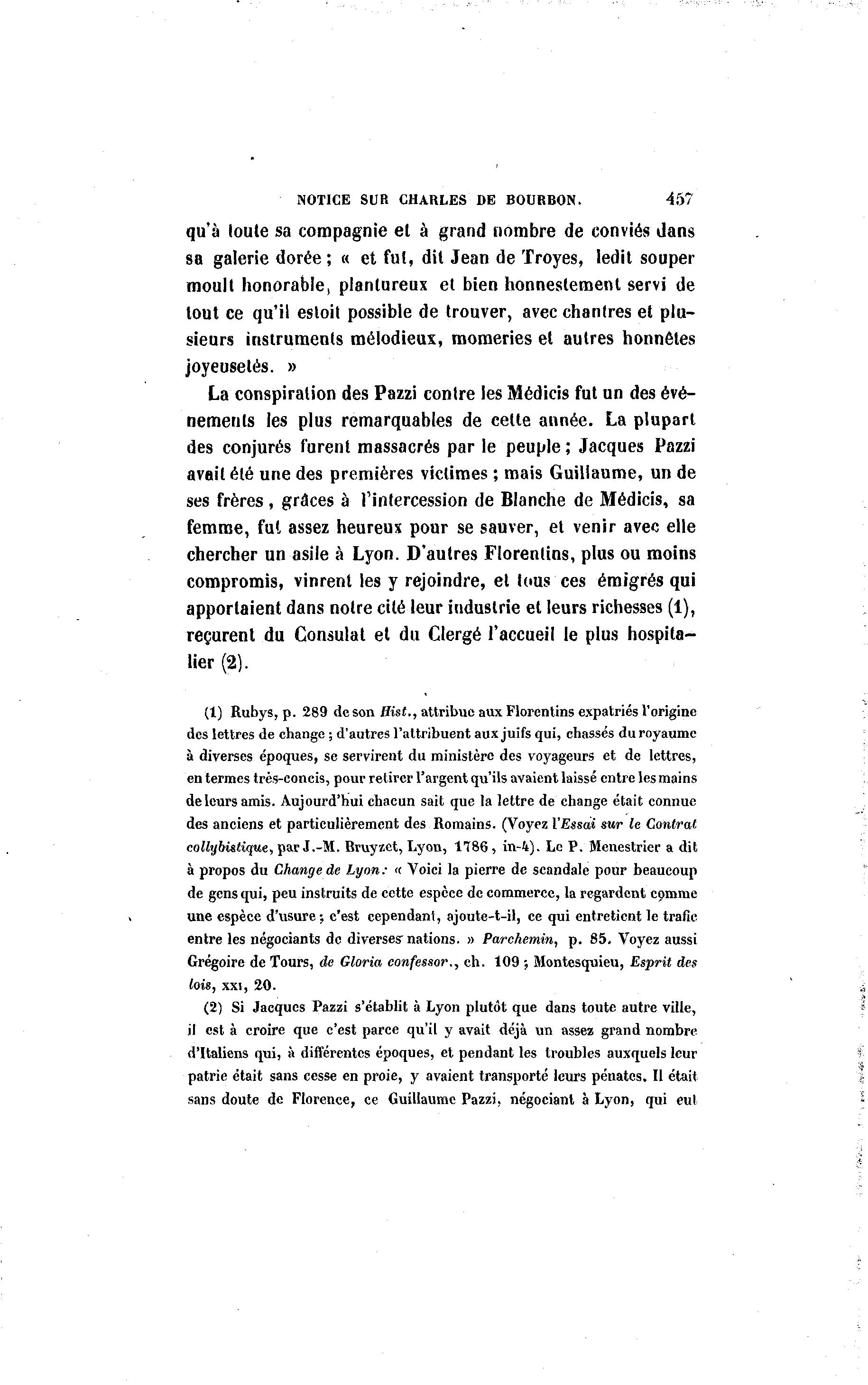 NOTICE SUR CHARLES DE BOURBON. 457 qu'à loule sa compagnie et à grand nombre de conviés dans sa galerie dorée ; « et fui, dit Jean de Troyes, ledit souper moult honorable, plantureux et bien honnestement servi de tout ce qu'il esloit possible de trouver, avec chantres et plu- sieurs instruments mélodieux, momeries et autres honnêtes joyeuselés. » La conspiration des Pazzi contre les Médicis fut un des évé- nements les plus remarquables de cette année. La plupart des conjurés furent massacrés par le peuple ; Jacques Pazzi avait été une des premières victimes ; mais Guillaume, un de ses frères , grâces à l'intercession de Blanche de Médicis, sa femme, fui assez heureux pour se sauver, et venir avec elle chercher un asile à Lyon. D'autres Florentins, plus ou moins compromis, vinrent les y rejoindre, et tous ces émigrés qui apportaient dans notre cité leur industrie et leurs richesses (1), reçurent du Consulat et du Clergé l'accueil le plus hospita- lier (2). (1) Rubys, p. 289 de son Hist., attribue aux Florentins expatriés l'origine des lettres de change ; d'autres l'attribuent aux juifs qui, chassés du royaume à diverses époques, se servirent du ministère des voyageurs et de lettres, en termes très-concis, pour retirer l'argent qu'ils avaient laissé entre les mains de leurs amis. Aujourd'hui chacun sait que la lettre de change était connue des anciens et particulièrement des Romains. (Voyez l'Essai sur le Contrat collybùtique, par J.-M. Bruyzet, Lyon, 1T86, in-4). Le P. Menestrier a dit à propos du Change de Lyon : « Voici la pierre de scandale pour beaucoup de gens qui, peu instruits de cette espèce de commerce, la regardent comme une espèce d'usure; c'est cependant, ajoute-t-il, ce qui entretient le trafic entre les négociants de diverses" nations. » Parchemin, p. 85. Voyez aussi Grégoire de Tours, de Gloria confessor., ch. 109 ; Montesquieu, Esprit des lois, xxi, 20. (2) Si Jacques Pazzi s'établit à Lyon plutôt que dans toute autre ville, il est à croire que c'est parce qu'il y avait déjà un assez grand nombre d'Italiens qui, à différentes époques, et pendant les troubles auxquels leur patrie était sans cesse en proie, y avaient transporté leurs pénates. Il était sans doute de Florence, ce Guillaume Pazzi, négociant à Lyon, qui eut