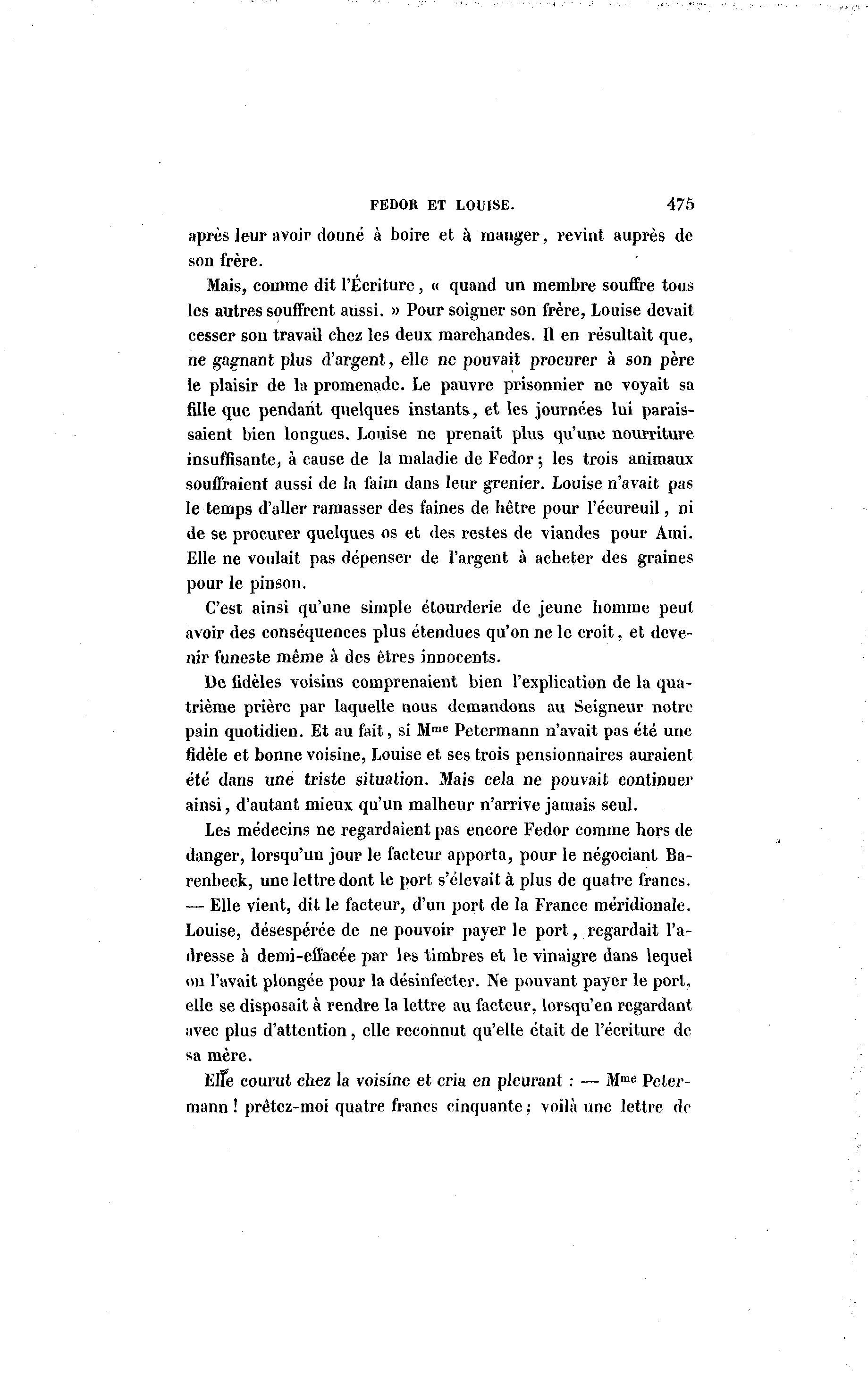 FËDOR ET LOUISE. 475 après leur avoir donné à boire et à manger, revint auprès de son frère. Mais, comme dit l'Écriture, « quand un membre souffre tous les autres souffrent aussi. » Pour soigner son frère, Louise devait cesser sou travail chez les deux marchandes. 11 en résultait que, ne gagnant plus d'argent, elle ne pouvait procurer à son père le plaisir de la promenade. Le pauvre prisonnier ne voyait sa fille que pendant quelques instants, et les journées lui parais- saient bien longues. Louise ne prenait plus qu'une nourriture insuffisante, à cause de la maladie de Fedor; les trois animaux souffraient aussi de la faim dans leur grenier. Louise n'avait pas le temps d'aller ramasser des faines de hêtre pour l'écureuil, ni de se procurer quelques os et des restes de viandes pour Ami. Elle ne voulait pas dépenser de l'argent à acheter des graines pour le pinson. C'est ainsi qu'une simple étourderie de jeune homme peut avoir des conséquences plus étendues qu'on ne le croit, et deve- nir funeste même à des êtres innocents. De fidèles voisins comprenaient bien l'explication de la qua- trième prière par laquelle nous demandons au Seigneur notre pain quotidien. Et au fait, si M me Petermann n'avait pas été une fidèle et bonne voisine, Louise et ses trois pensionnaires auraient été dans une triste situation. Mais cela ne pouvait continuer ainsi, d'autant mieux qu'un malheur n'arrive jamais seul. Les médecins ne regardaient pas encore Fedor comme hors de danger, lorsqu'un jour le facteur apporta, pour le négociant Ba- renbeck, une lettre dont le port s'élevait à plus de quatre francs. — Elle vient, dit le facteur, d?un port de la France méridionale. Louise, désespérée de ne pouvoir payer le p o r t , regardait l'a- dresse à demi-effacée par les timbres et le vinaigre dans lequel on l'avait plongée pour la désinfecter. Ne pouvant payer le port, elle se disposait à rendre la lettre au facteur, lorsqu'en regardant avec plus d'attention, elle reconnut qu'elle était de l'écriture de sa mère. Elfe courut chez la voisine et cria en pleurant : — Mme Peter- mann ! prêtez-moi quatre francs cinquante ; voilà une lettre de