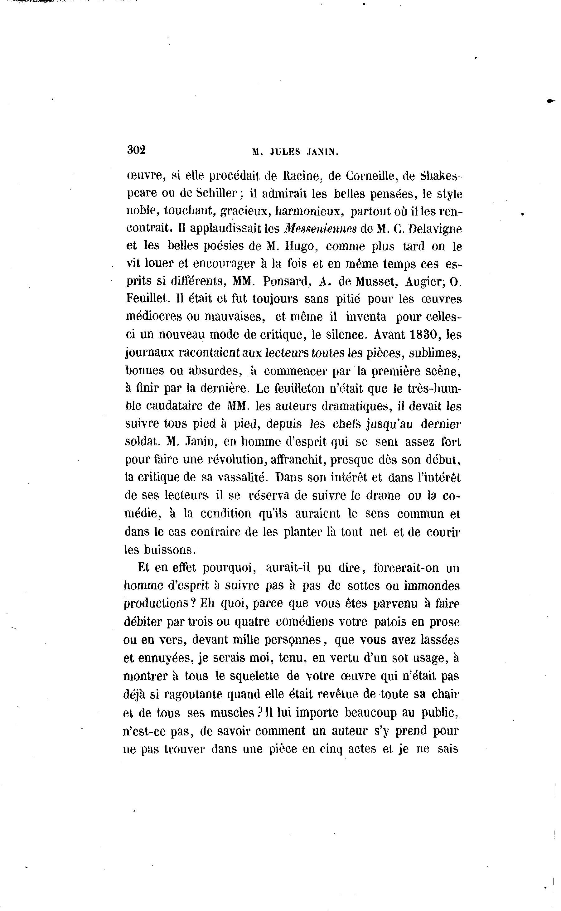 302 M. JULES JANIN. œuvre, si elle procédait de Racine, de Corneille, de Shakes peare ou de Schiller; il admirait les belles pensées, le style noble, touchant, gracieux, harmonieux, partout où il les ren- contrait. H applaudissait les Messeniennes de M. C. Delavigne et les belles poésies de M. Hugo, comme plus tard on le vit louer et encourager à la fois et en même temps ces es- prits si différents, MM. Ponsard, A. de Musset, Augier, 0. Feuillet. 11 était et fut toujours sans pitié pour les œuvres médiocres ou mauvaises, et même il inventa pour celles- ci un nouveau mode de critique, le silence. Avant 1830, les journaux racontaient aux lecteurs toutes les pièces, sublimes, bonnes ou absurdes, k commencer par la première scène, a finir par la dernière. Le feuilleton n'était que le très-hum- ble caudataire de MM. les auteurs dramatiques, il devait les suivre tous pied k pied, depuis les chefs jusqu'au dernier soldat. M. Janin, en homme d'esprit qui se sent assez fort pour faire une révolution, affranchit, presque dès son début, la critique de sa vassalité. Dans son intérêt et dans l'intérêt de ses lecteurs il se réserva de suivre le drame ou la co- médie, a la condition qu'ils auraient le sens commun et dans le cas contraire de les planter la tout net. et de courir les buissons. Et en effet pourquoi, aurait-il pu dire, forcerait-on un homme d'esprit à suivre pas à pas de sottes ou immondes productions? Eh quoi, parce que vous êtes parvenu k faire débiter par trois ou quatre comédiens votre patois en prose ou en vers, devant mille personnes, que vous avez lassées et ennuyées, je serais moi, tenu, en vertu d'un sot usage, k montrer k tous le squelette de votre œuvre qui n'était pas déjk si ragoûtante quand elle était revêtue de toute sa chair et de tous ses muscles? 11 lui importe beaucoup au public, n'est-ce pas, de savoir comment un auteur s'y prend pour ne pas trouver dans une pièce en cinq actes et je ne sais