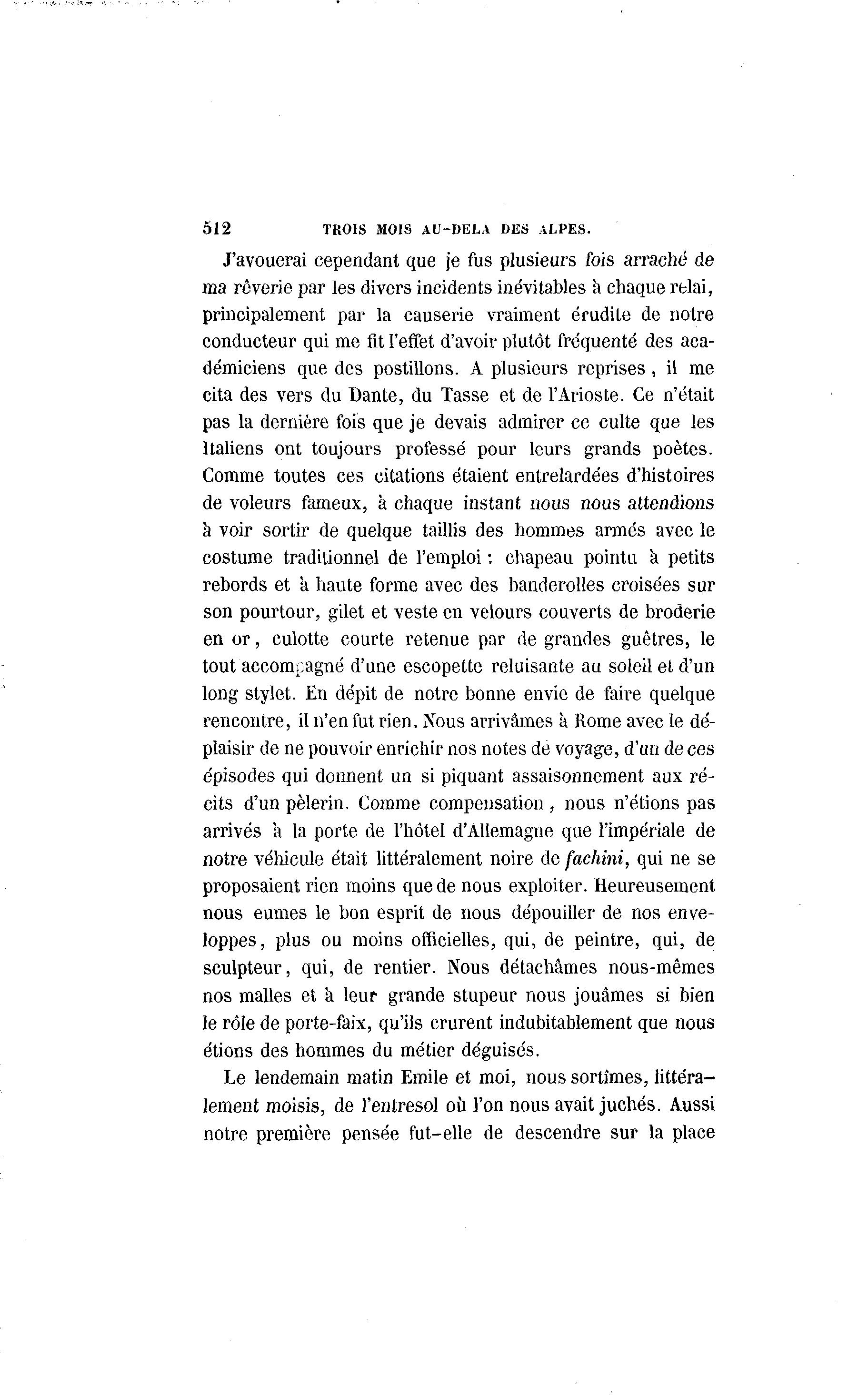 512 TROIS MOIS AU-DELA DES ALPES. J'avouerai cependant que je fus plusieurs fois arraché de ma rêverie par les divers incidents inévitables à chaque relai, principalement par la causerie vraiment érudite de notre conducteur qui me fit l'effet d'avoir plutôt fréquenté des aca- démiciens que des postillons. A plusieurs reprises, il me cita des vers du Dante, du Tasse et de l'Arioste. Ce n'était pas la dernière fois que je devais admirer ce culte que les Italiens ont toujours professé pour leurs grands poètes. Comme toutes ces citations étaient entrelardées d'histoires de voleurs fameux, à chaque instant nous nous attendions à voir sortir de quelque taillis des hommes armés avec le costume traditionnel de l'emploi ; chapeau pointu a petits rebords et a haute forme avec des banderolles croisées sur son pourtour, gilet et veste en velours couverts de broderie en or, culotte courte retenue par de grandes guêtres, le tout accompagné d'une escopette reluisante au soleil et d'un long stylet. En dépit de notre bonne envie de faire quelque rencontre, il n'en fut rien. Nous arrivâmes à Rome avec le dé- plaisir de ne pouvoir enrichir nos notes de voyage, d'un de ces épisodes qui donnent un si piquant assaisonnement aux ré- cits d'un pèlerin. Comme compensation , nous n'étions pas arrivés a la porte de l'hôtel d'Allemagne que l'impériale de notre véhicule était littéralement noire de fachini, qui ne se proposaient rien moins que de nous exploiter. Heureusement nous eûmes le bon esprit de nous dépouiller de nos enve- loppes, plus ou moins officielles, qui, de peintre, qui, de sculpteur, qui, de rentier. Nous détachâmes nous-mêmes nos malles et à leur grande stupeur nous jouâmes si bien le rôle de porte-faix, qu'ils crurent indubitablement que nous étions des hommes du métier déguisés. Le lendemain matin Emile et moi, nous sortîmes, littéra- lement moisis, de l'entresol où l'on nous avait juchés. Aussi notre première pensée fut-elle de descendre sur la place